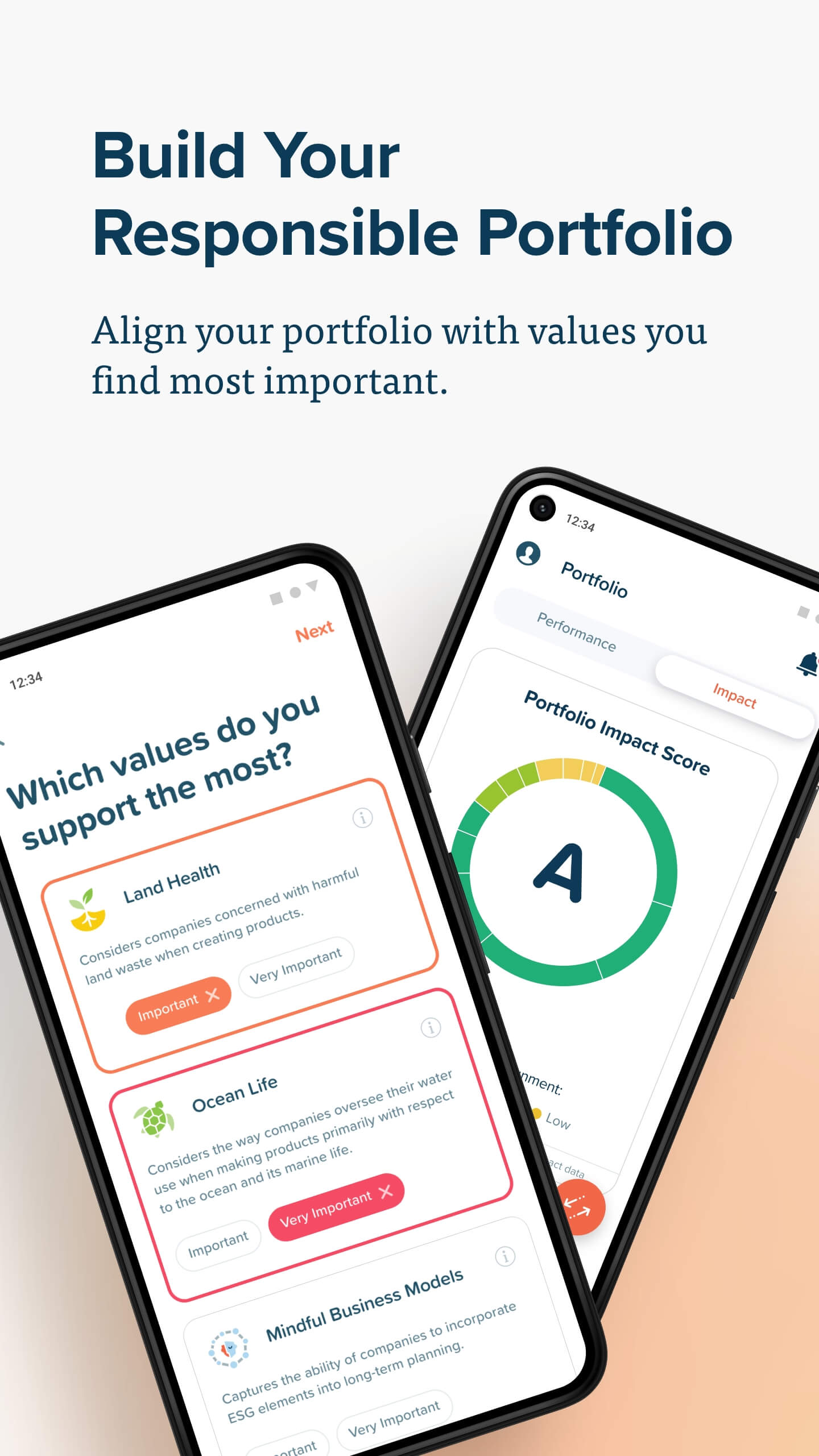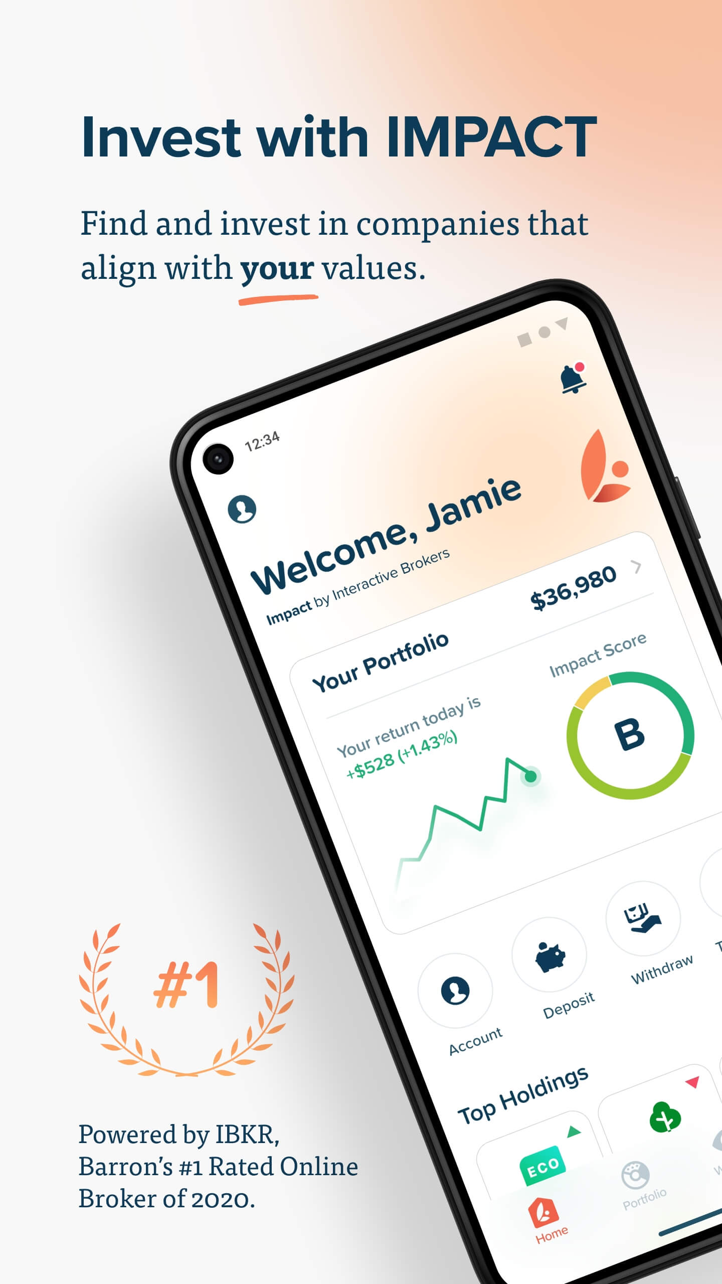 Sustainable investing, simplified. IMPACT by IBKR provides the tools and technology that make it easy to invest responsibly in companies that uphold the principles you believe in. First, select the values that are important to you, then Explore to find companies with similar values that fit your investment objectives. Next, build your portfolio of US stocks and funds completely commission-free. Monitor your portfolio's performance and grade with a tap. Want to improve your portfolio grade? Use Swap to trade out of one position and into another with a single order. Trade single- and multi-leg options globally on 30+ market centers with our step-by-step Options Wizard and user-friendly Option Chains. Enhanced with educational content so you can expand your knowledge about options and strategies. Make more of an IMPACT by donating to your favorite charities through the IMPACT app. Tap the Give icon, search for or select a charity, specify the amount you’d like to give and submit. See your giving history using the Donations tab in the Transaction History page. Need access to futures? You can use your account on IBKR's top-flight trading platforms like TWS, IBKR Mobile, and Client Portal. Trade your way to the world you want with IMPACT powered by IBKR, Barron's #1 rated online broker of 2021. Disclosures The IMPACT application is a product of Interactive Brokers LLC that allows clients to generate analysis of their IBKR brokerage accounts using environmental, social, and governance (“ESG”) data provided by unaffiliated third-party data providers along with proprietary in-house algorithms and trade and account data contained in IBKR’s systems. For more information, please see the "Interactive Brokers LLC Disclosure regarding Use of IMPACT and ESG Dashboard and IMPACT Application". Margin borrowing is only for experienced investors with high risk tolerance. You may lose more than your initial investment. The risk of loss in online trading of stocks, options, futures, currencies, foreign equities, and fixed Income can be substantial. The projections or other information generated by IMPACT app regarding the likelihood of various investment outcomes are hypothetical in nature, do not reflect actual investment results and are not guarantees of future results. Please note that results may vary with use of the tool over time. Please note that applicants will be required to open an IBKR Lite account with Interactive Brokers LLC. This account type is limited to trading U.S. exchange-listed stocks and ETFs. IBKR is able to provide commission-free trading in certain products because it receives payment for order flow from market makers for these orders. For more information, see https://ibkr.com/liteinfo. All sell orders are subject to small fees to offset the transactions fees imposed by regulators on the firm. For more information, see https://ibkr.com/liteinfo