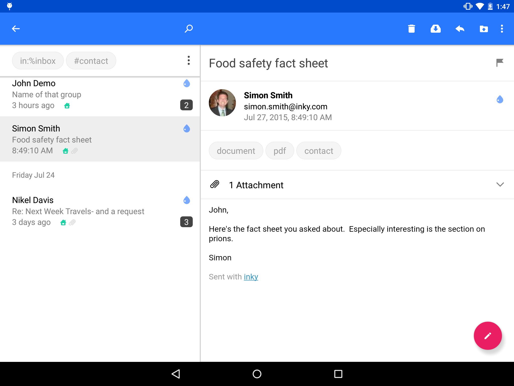 Inky downloads and analyzes your mail directly on your device, where it automatically sorts and filters messages into meaningful categories like Personal, Subscriptions, and Notes. Instantly search by keyword, contact, or even tags like #contact or #package to find what you need fast!