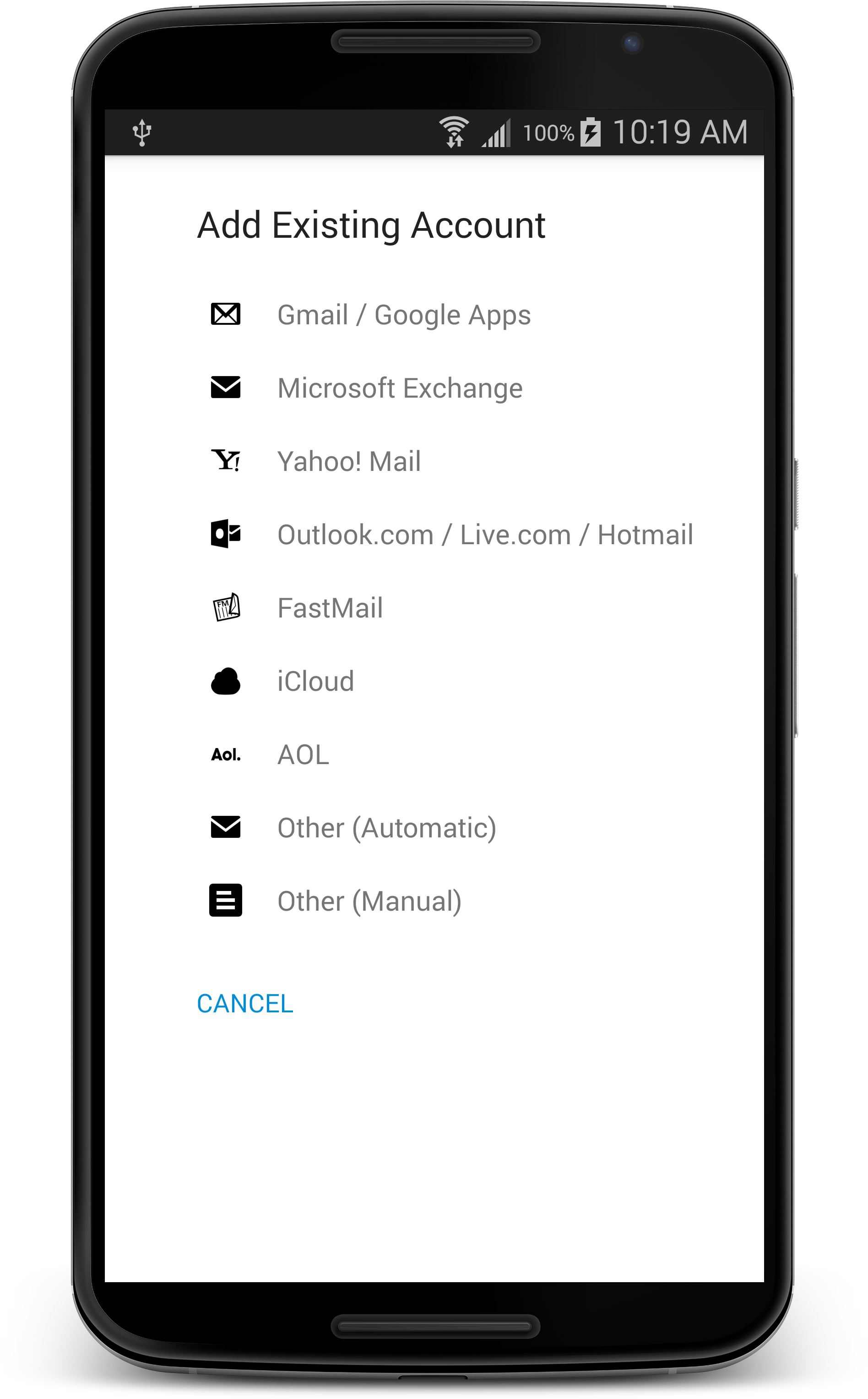 • Support for Exchange, Gmail, iCloud, AOL, Live, Hotmail, Yahoo! Mail, Outlook, and other IMAP and POP servers