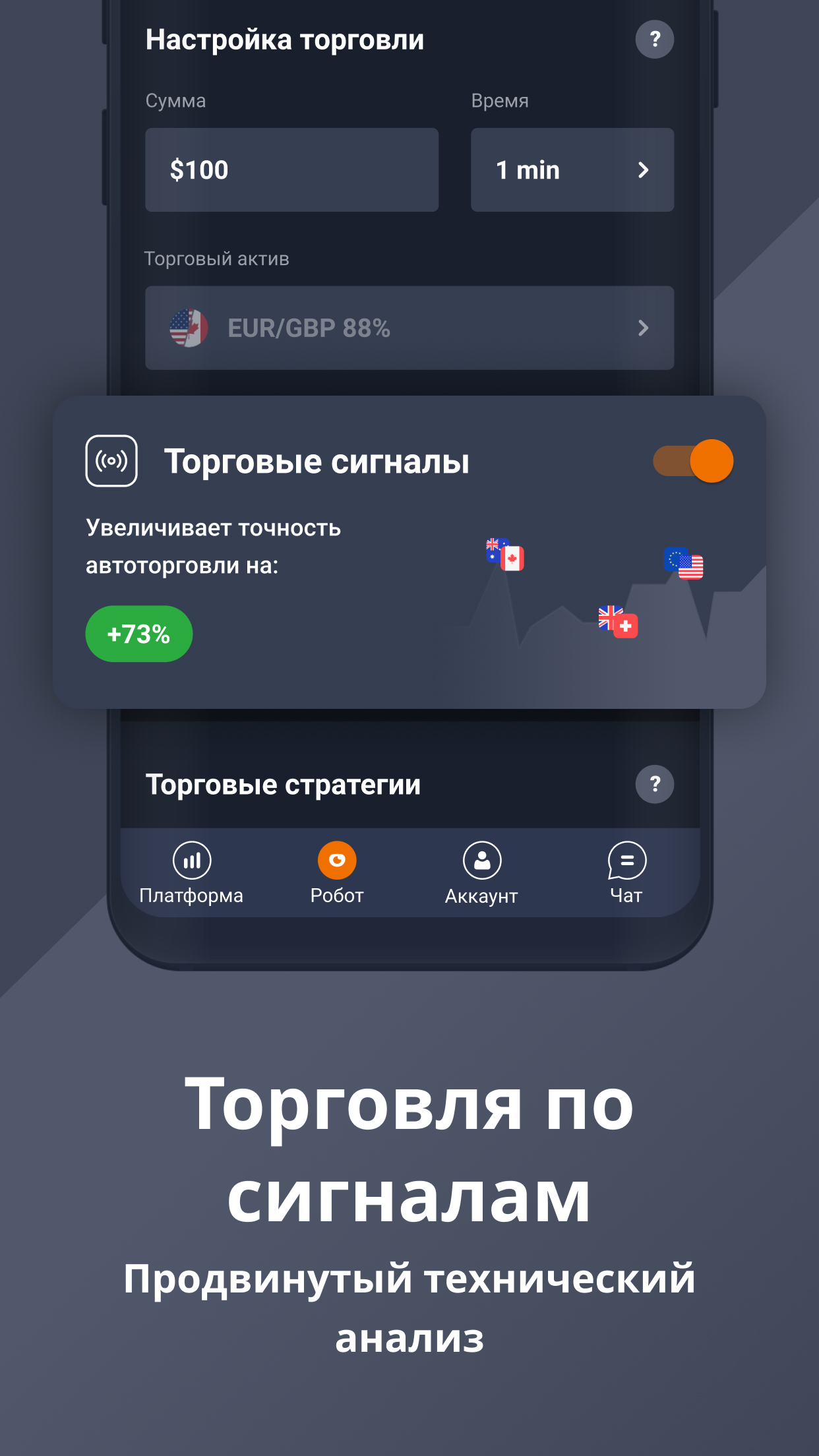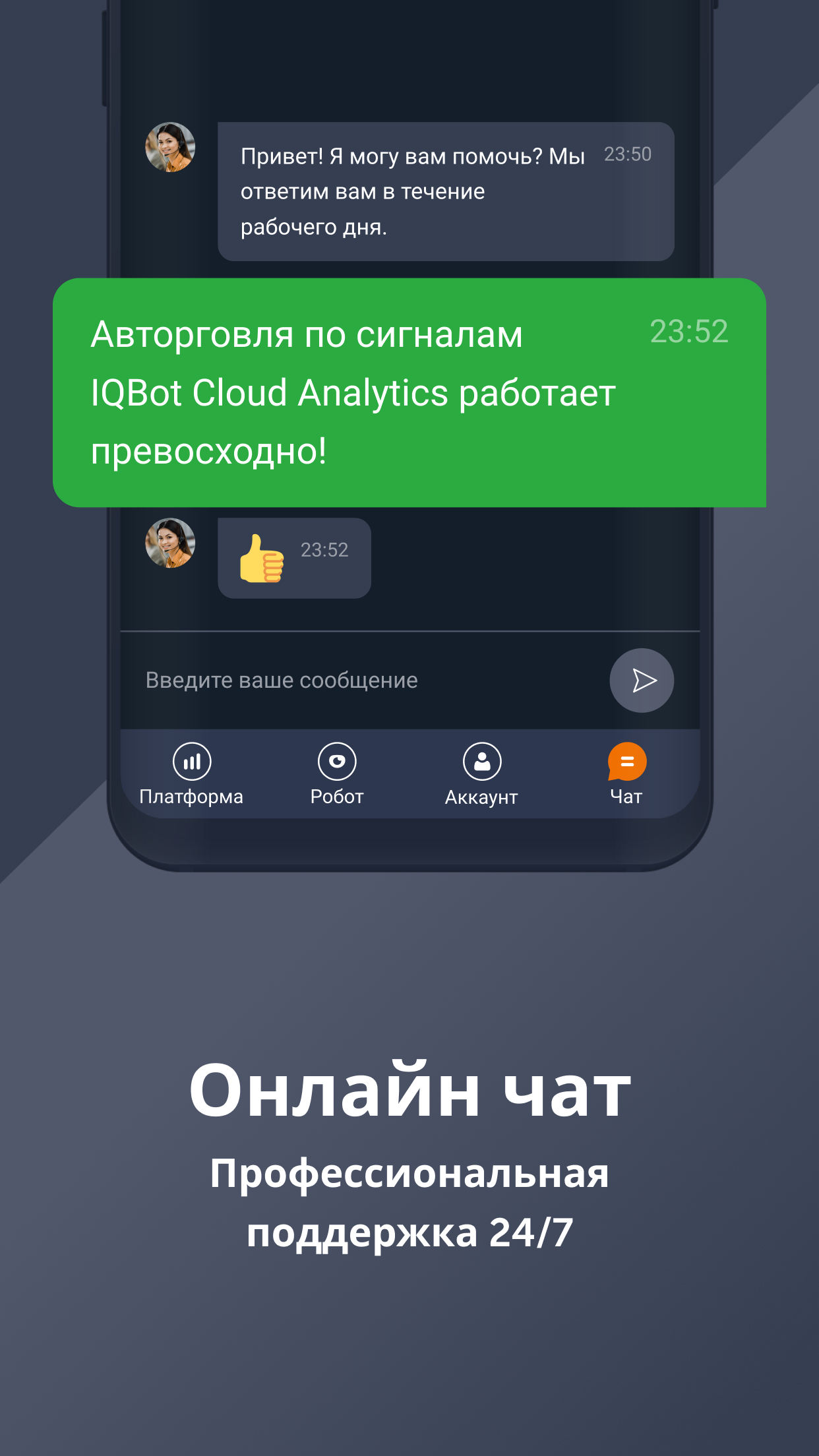 IQ Bot — это простое в использовании мобильное приложение для автотрейдинга на платформе IQ Option. Бот подходит как для профессиональных инвесторов, так и для новичков в трейдинге. Ключевые особенности IQ Bot: 🤖 Бот для автоматической торговли, на которого можно положиться Надежное приложение для торговли на платформе IQ Option позволяет в полной мере использовать технический анализ, что является более разумным подходом к инвестированию, чем копирование чужой торговли. Увеличьте точность вашей торговли с IQ Bot. 👍🏼 Удобный пользовательский интерфейс Благодаря удобному интерфейсу торгового приложения, локализованному на 14 языков, настройка IQ Bot и начало онлайн-торговли занимает меньше 5 минут. 📈 Качественная торговля на основе сигналов Приложение получает самые свежие рыночные данные со своих серверов Cloud Analytics, которые анализируют более 20 торговых индикаторов, включая полосы Боллинджера, MACD, STOCH, ATR и RSI. 💰 Безопасная торговля на демо-счете Лучший способ протестировать эффективность торговых сигналов — это попробовать робота на демо-счете. Вы можете проверить, какая стратегия лучше всего вам подходит, прежде чем переходить на реальный счет. Практикуйтесь в трейдинге без риска для своих денег! 💬 Техническая поддержка 24/7 Мы заботимся о наших пользователях, поэтому предоставляем круглосуточную техническую поддержку в чате. Если у вас появятся любые вопросы о нашем приложении, просто напишите нам, и мы быстро ответим. 🤝 Почему трейдеры выбирают нас: Бесплатное приложение на Android для автоматизированной мобильной торговли; Высокопроизводительный торговый робот для умной торговли; Торговые сигналы на основе расширенного технического анализа; Автотрейдинг с включенным take profit; Более точный, чем другие роботы по копированию торговли на IQ Option. Дисклеймер Пожалуйста, обратите внимание: * Это приложение для автоматической торговли разработано для платформы IQ Option собственной командой независимых разработчиков, не связанных с торговым приложением IQ Option X. * IQ Bot не предназначен для торговли на Grue Trade 7, Freetrade, Binomo, Win Trade, Quotex или любой другой платформе, кроме торговой платформы IQ Option.