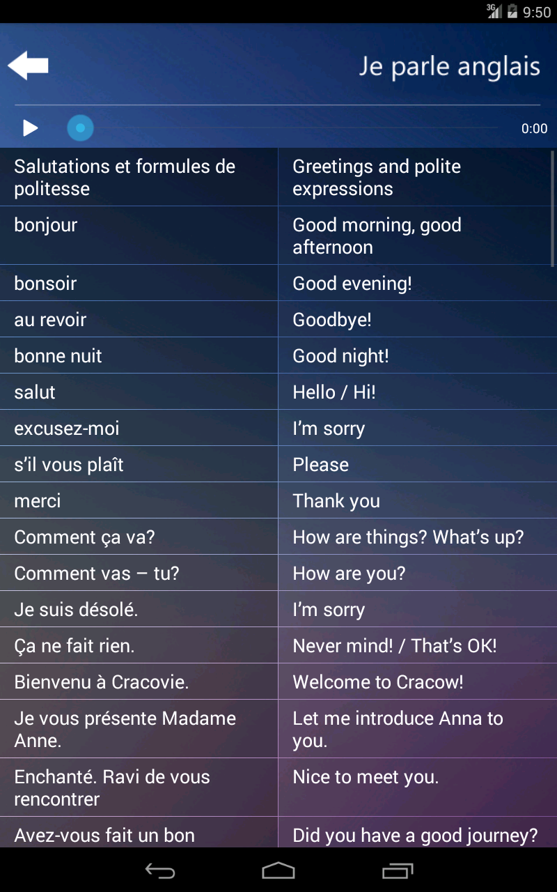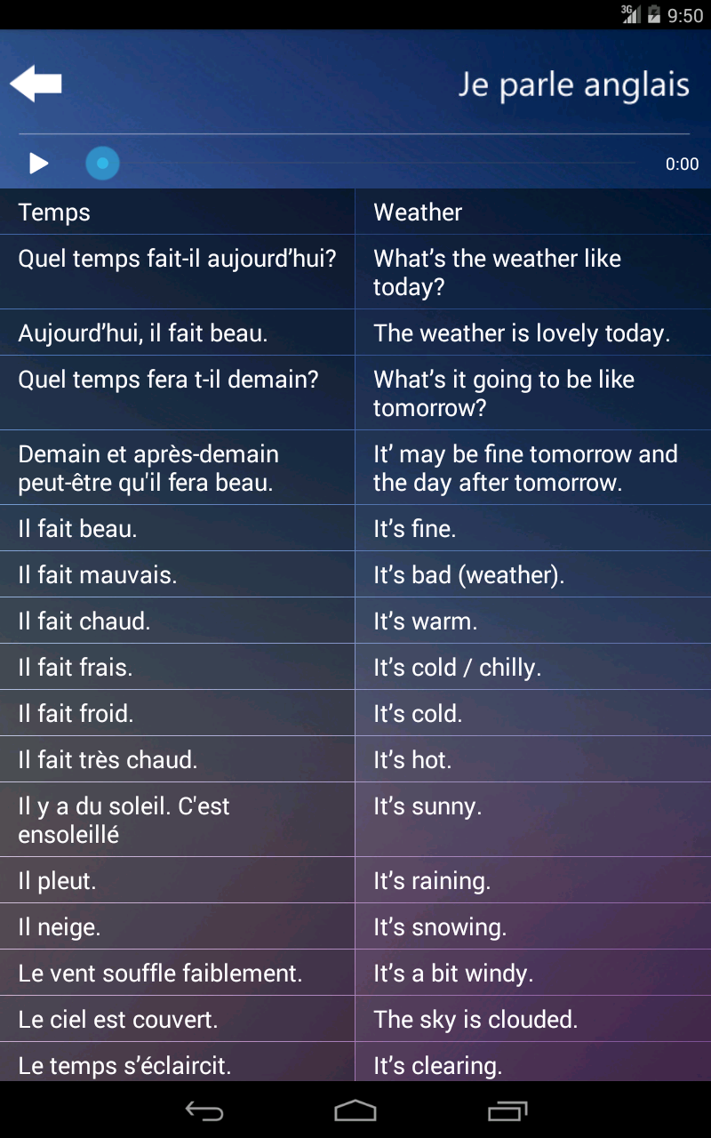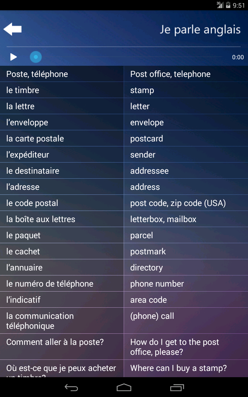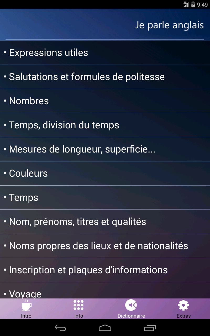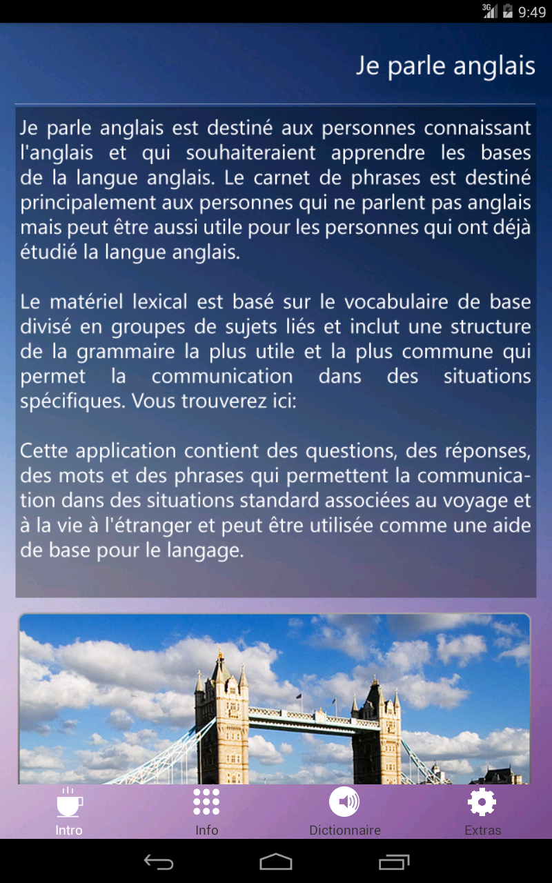 Это приложение содержит вопросы, ответы, слова и фразы, которые позволяют пользователям общаться в стандартных ситуациях, связанных с путешествиями и жизни за рубежом и могут быть использованы в качестве языка по основам помощи.