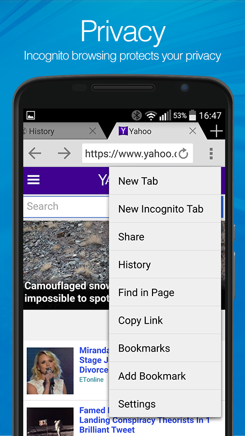 • Privacy - use Incognito mode to browse without saving your history
