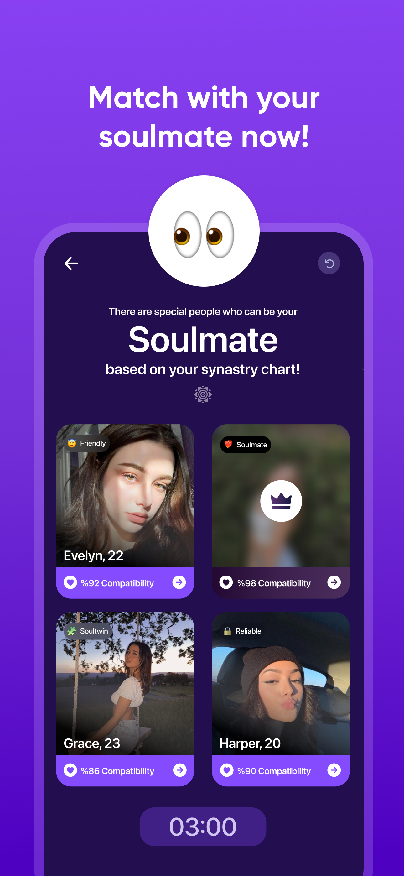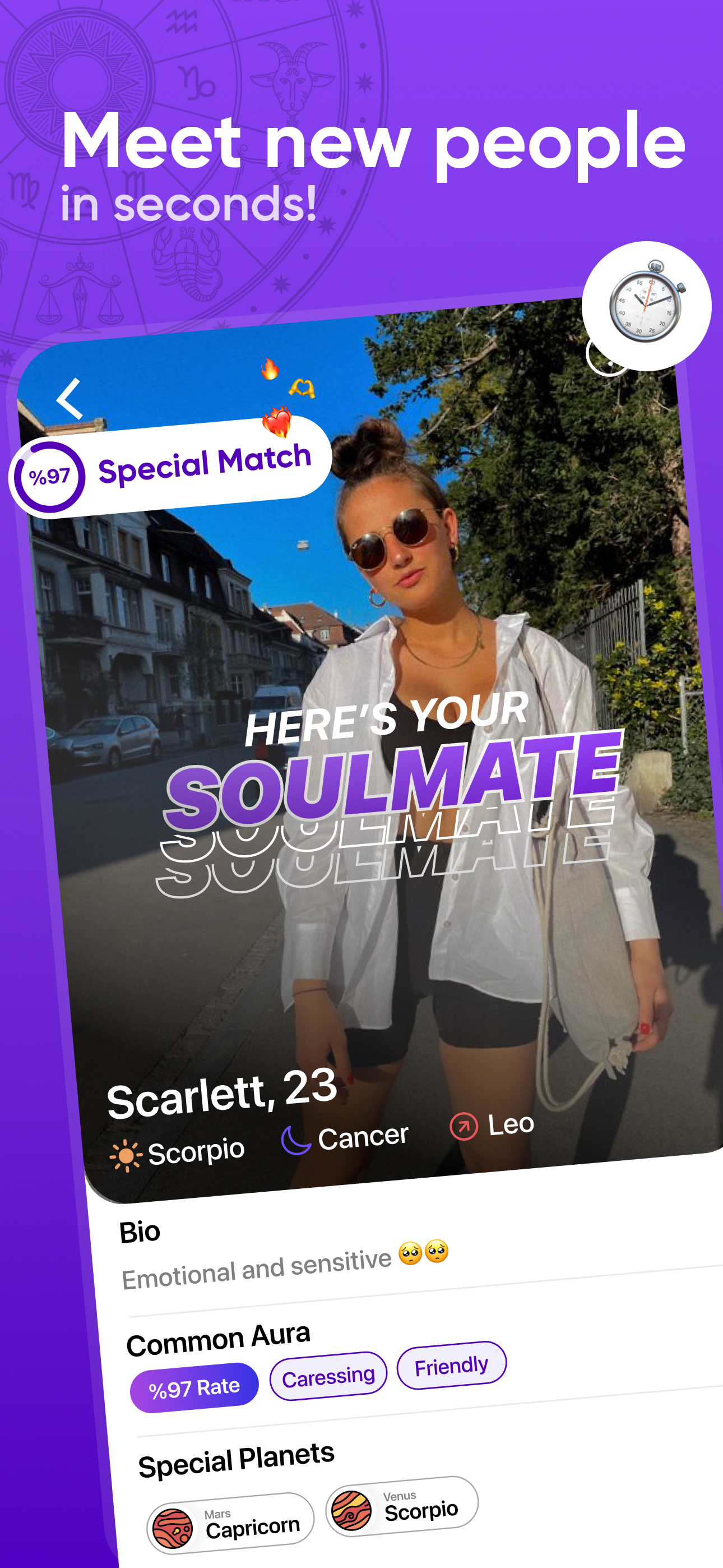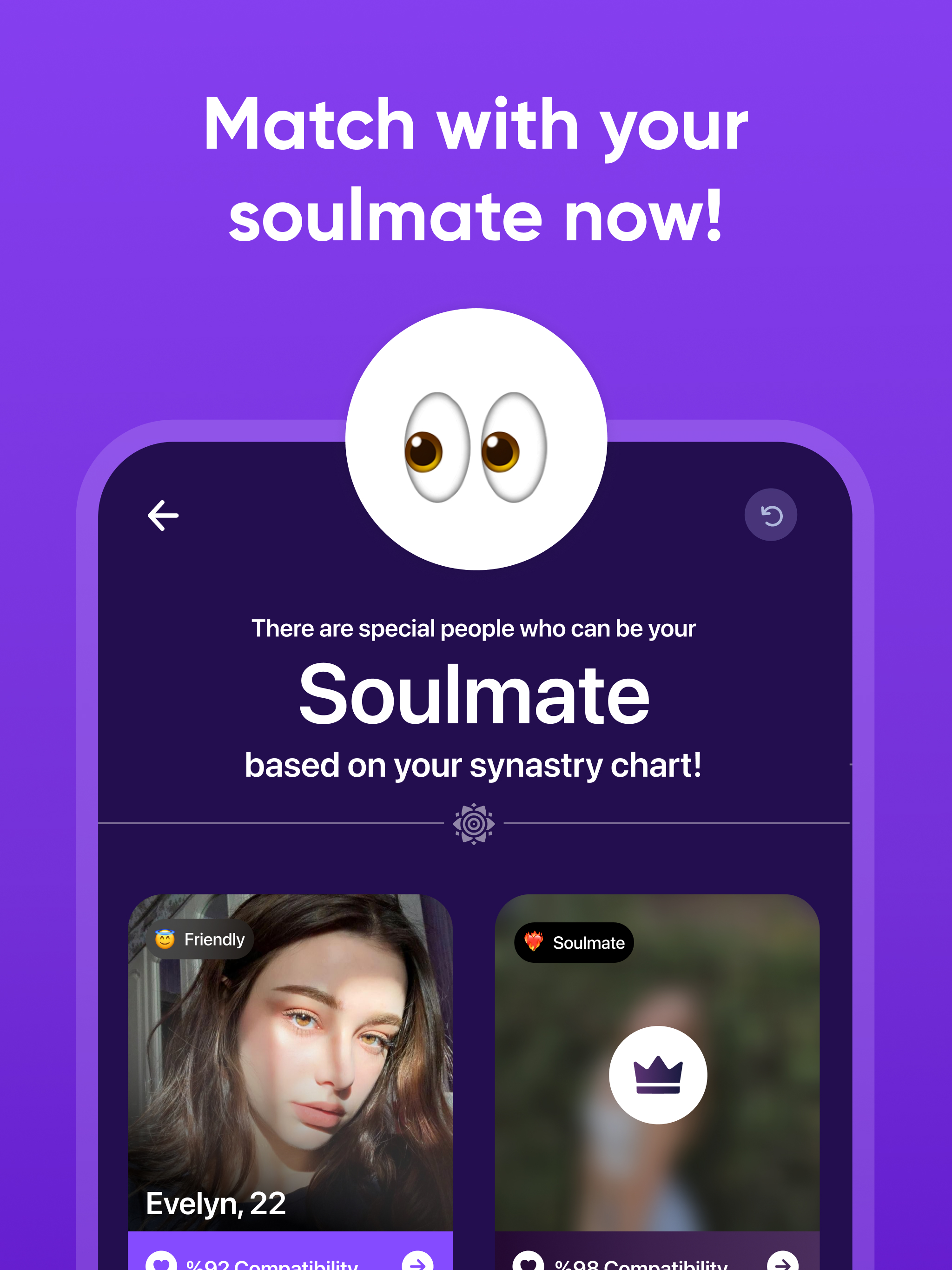 Исследуйте более глубокие связи и найдите особые совпадения, такие как Soulmate, Karma Lord, Shadow, Synthesis. Превзойдите стандартные приложения для знакомств и плывите по течению мистико-духовной основы зодиака.