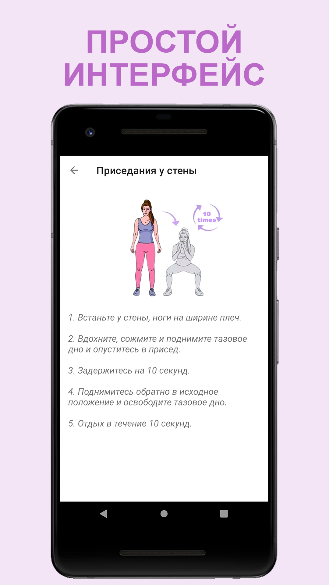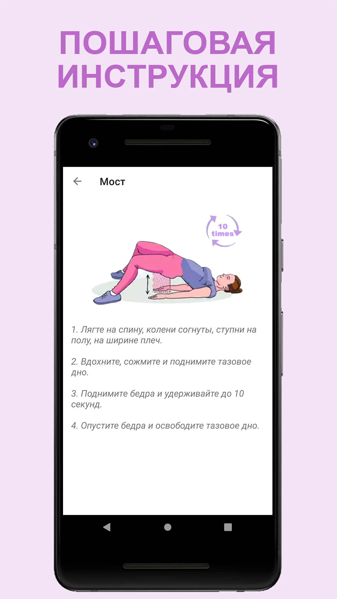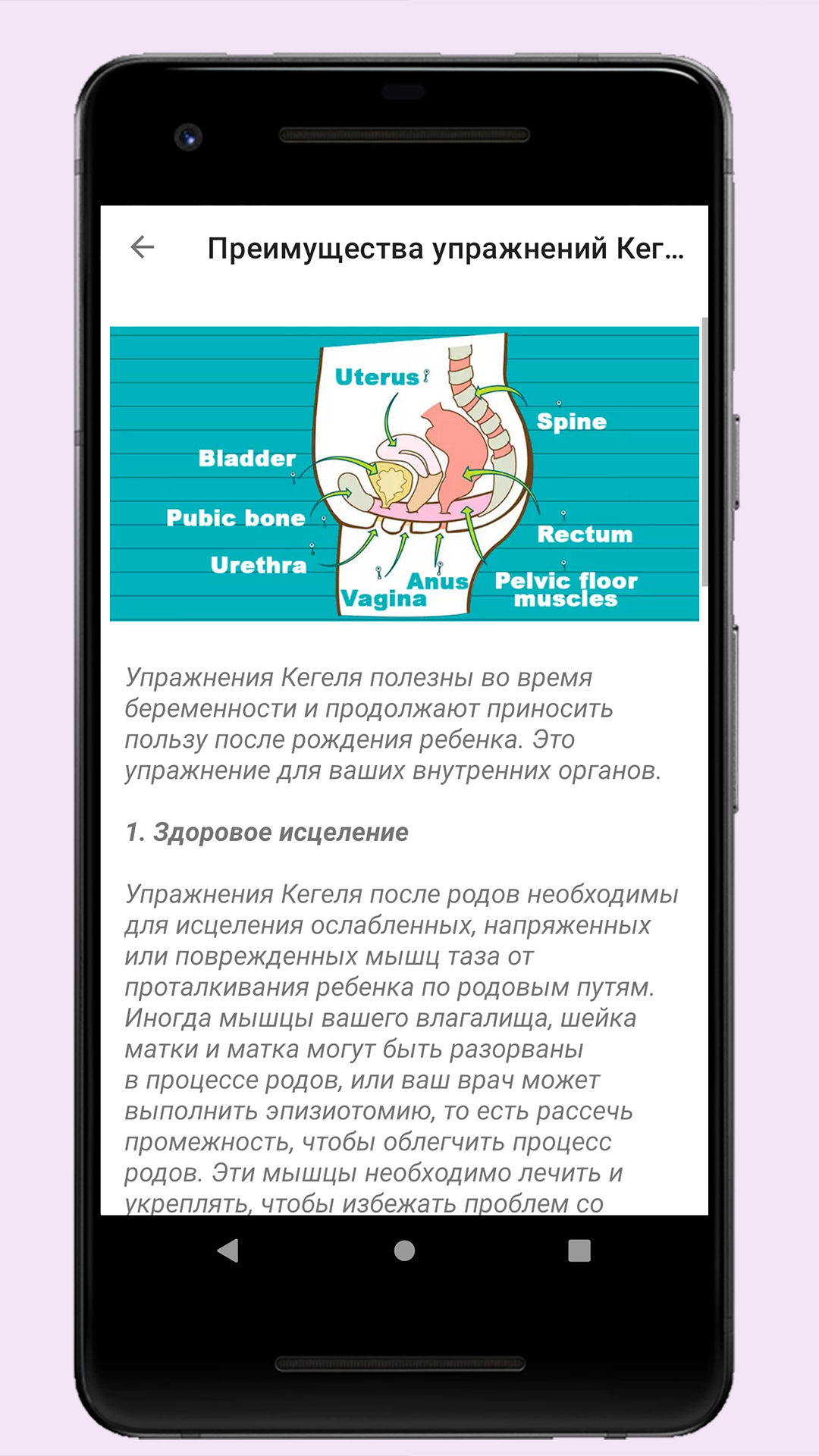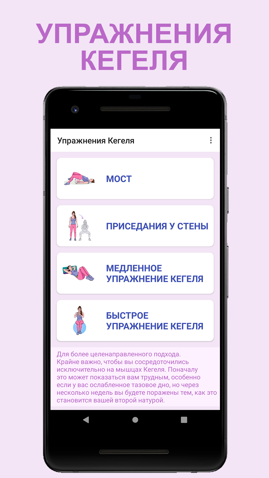 Упражнения Кегеля могут помочь укрепить мышцы под маткой, мочевым пузырем и кишечником (толстой кишкой). Они могут помочь как мужчинам, так и женщинам, у которых есть проблемы с недержанием мочи или контролем кишечника. У вас могут быть следующие проблемы: ✓ Когда вы станете старше ✓ Если вы набираете вес ✓ После беременности и родов ✓ После гинекологических операций (женщины) ✓ После операции на простате (мужчины) Упражнения Кегеля укрепляют мышцы тазового дна, поддерживающие матку, мочевой пузырь, тонкую кишку и прямую кишку. Вы можете выполнять упражнения Кегеля, также известные как тренировка мышц тазового дна, практически в любое время. Начните с понимания того, что упражнения Кегеля могут сделать для вас, а затем следуйте этим инструкциям, чтобы сокращать и расслаблять мышцы тазового дна. У людей с мозговыми и нервными расстройствами также могут быть проблемы с недержанием мочи или нарушением опорожнения кишечника. Упражнения можно выполнять в любое время, когда вы сидите или лежите. Вы можете выполнять их, когда едите, сидите за столом, ведете машину, отдыхаете или смотрите телевизор. Упражнения Кегеля менее полезны для женщин, у которых наблюдается сильное подтекание мочи при чихании, кашле или смехе. Кроме того, упражнения Кегеля не помогают женщинам, у которых неожиданно выделяется небольшое количество мочи из-за переполнения мочевого пузыря (недержание мочи при переполнении). Как найти нужные мышцы Упражнение Кегеля — это то же самое, что притвориться, что вам нужно помочиться, а затем задержать мочеиспускание. Вы расслабляете и напрягаете мышцы, контролирующие поток мочи. Важно найти правильные мышцы, которые нужно напрячь. В следующий раз, когда вам нужно будет помочиться, начните, а затем остановитесь. Почувствуйте, как мышцы влагалища (для женщин), мочевого пузыря или ануса напрягаются и поднимаются. Это мышцы тазового дна. Если вы чувствуете, что они напрягаются, вы правильно выполнили упражнение. Ваши бедра, ягодичные мышцы и живот должны оставаться расслабленными. Когда делать упражнение Кегеля Сделайте упражнения Кегеля частью своей повседневной жизни. Вы можете незаметно выполнять упражнения Кегеля практически в любое время, независимо от того, сидите ли вы за столом или отдыхаете на диване. Когда ожидать результатов Если вы регулярно выполняете упражнения Кегеля, вы можете ожидать результатов, таких как менее частые подтекания мочи, в течение от нескольких недель до нескольких месяцев. Чтобы получить постоянный эффект, сделайте упражнения Кегеля постоянной частью своего распорядка дня. Возможности приложения: ✓ Простой пользовательский интерфейс ✓ Лучшие упражнения Кегеля ✓ Нет платных функций