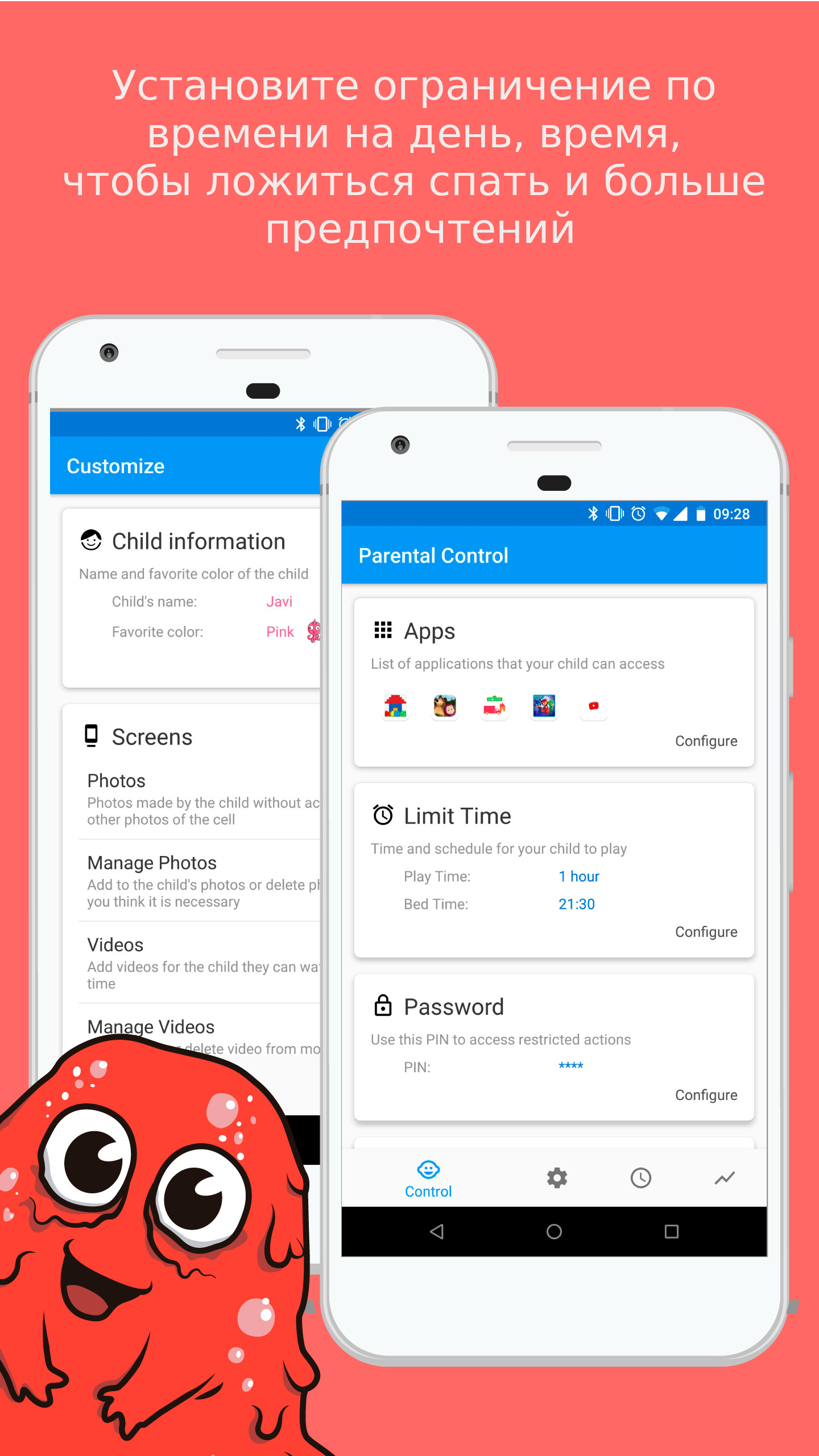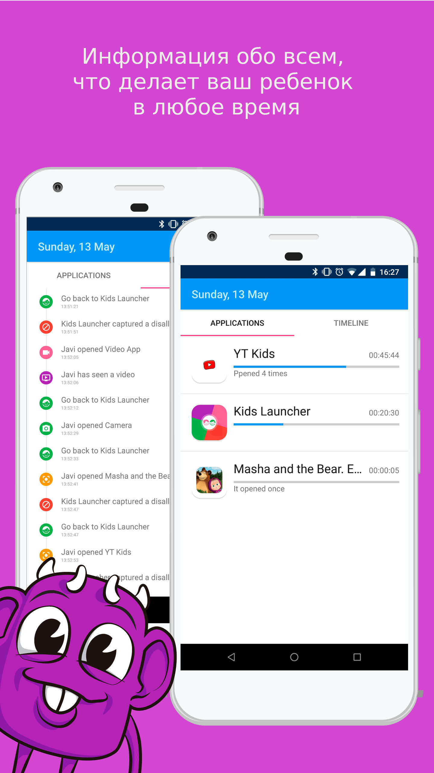Характеристики Kids Launcher: ★ Пользовательский экран запуска, на котором вы можете получить доступ только к приложениям, фотографиям или видеороликам, которые вы хотите ★ Установите ограничение времени на день и время, чтобы лечь спать ★ Блокирует доступ к приложениям, которые не разрешены ★ Дистанционный родительский контроль: Используйте пульт дистанционного запуска Kids Launcher Remote, чтобы управлять всем, что делает ваш ребенок с вашего мобильного телефона. ★ Если вы делите устройство с ребенком, вы можете получить доступ к заблокированным приложениям с помощью PIN-кода разблокировки в течение нескольких шагов ★ Ежедневная и ежемесячная статистика общего и за время приложения ★ Ребенок будет уведомлен за 10 минут до того, как пришло время прекратить использование телефона или планшета ★ Доступ в ограниченную зону по PIN-коду ★ Привлекательный интерфейс, основанный на дизайне материалов Kids Launcher содержит мини-приложения, адаптированные для детей, такие как Color by Number, приложение для фотографирования и редактирования с помощью наклеек или смайликов и простое приложение для рисования, где родитель может предложить новые штрихи или буквы, чтобы ребенок научился их рисовать. Kids Launcher предлагает удобный интерфейс для детей, где красочные монстры помогут вам получить доступ к неприемлемому контенту, предупредить, когда игра заканчивается, и обеспечить правильное использование мобильного телефона или планшета.
