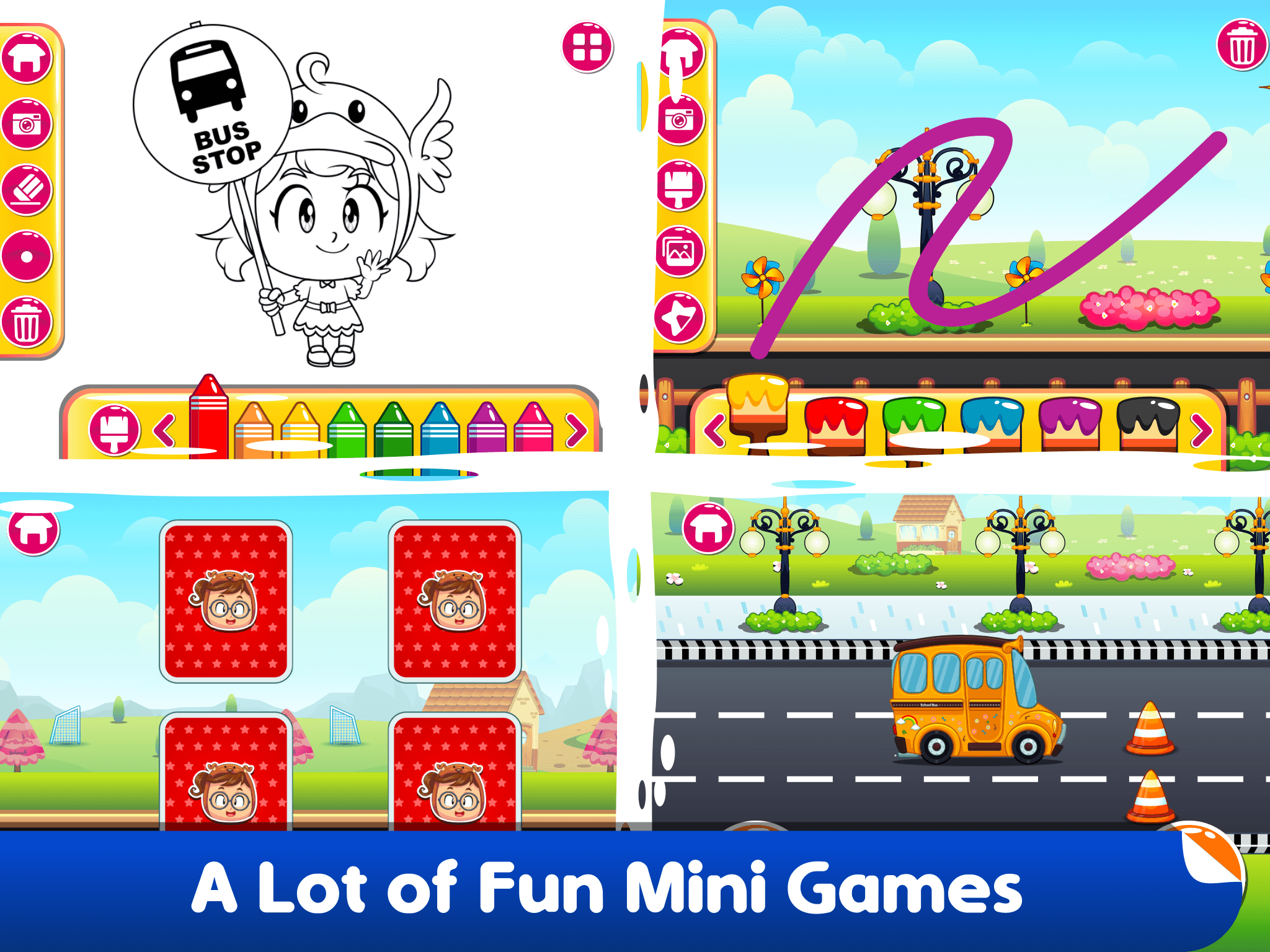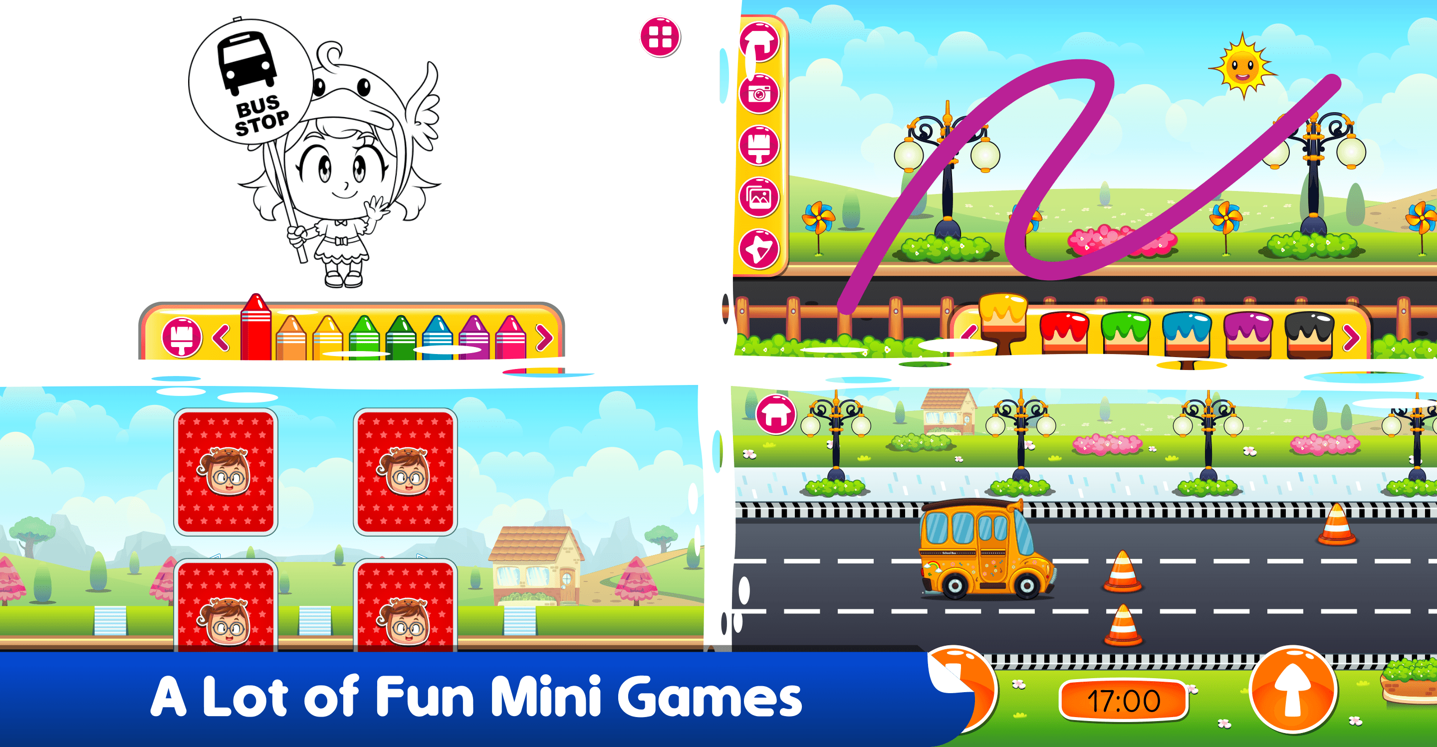 Наслаждайтесь 6 веселыми и увлекательными играми с образовательными ценностями: > Игры на память Найдите подходящие карты! Улучшите память вашего ребенка с помощью этой увлекательной игры на память. > Пора рисовать Выньте кисти! Разбавьте творческие способности вашего ребенка, раскрасив 6 изображений красочной кистью. > Творческий вызов Развивайте творческие способности своего ребенка с помощью множества видов наклеек с 6 различными фонами. > Супер Драйв Проверьте свои навыки вождения. Управляйте автобусом осторожно, избегая конусов > Гонки Соревнуйтесь с друзьями и узнайте, кто победитель > Школьный автобус Управляйте автобусом и садитесь за пассажиров. Что внутри: > 6 забавных и образовательных мини-игр, включая Игры на память, Раскраски, Наклейки, Супер Драйв, Гонки и Школьный автобус. > Интерактивная песня с анимированными милыми животными и персонажами.