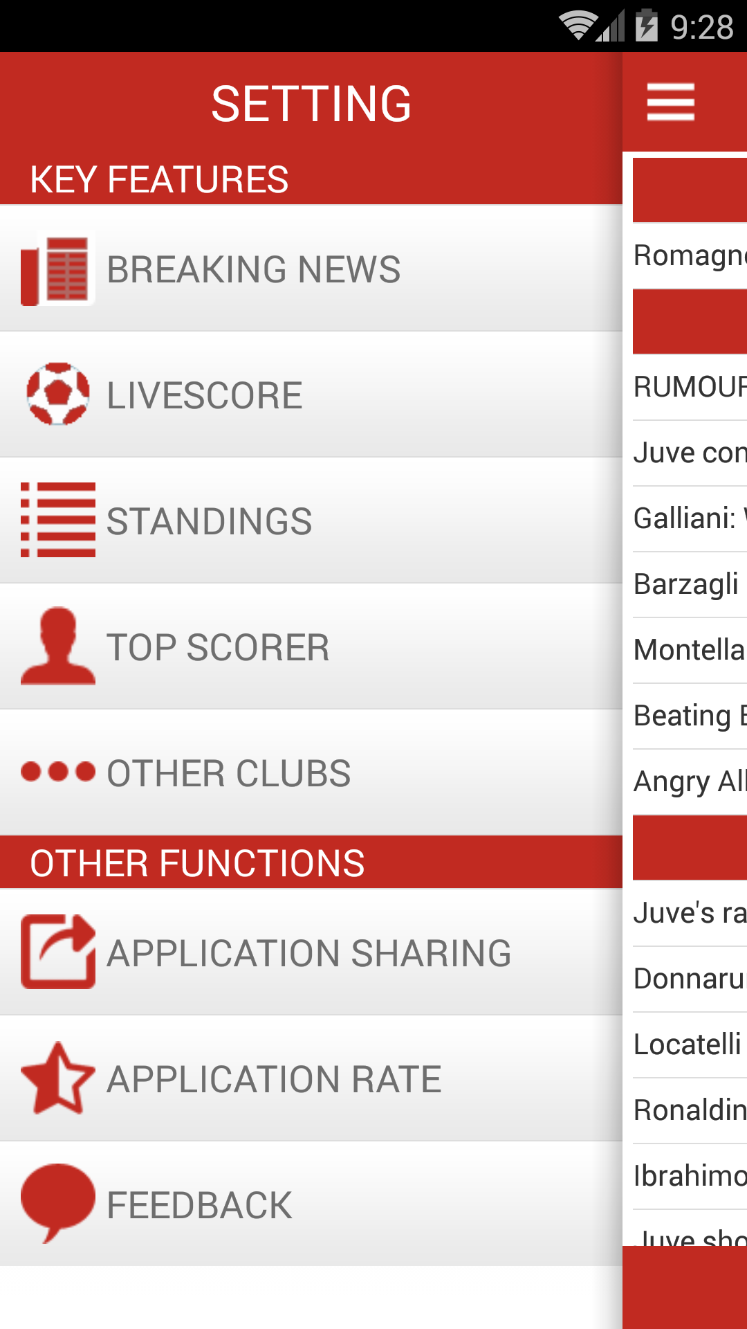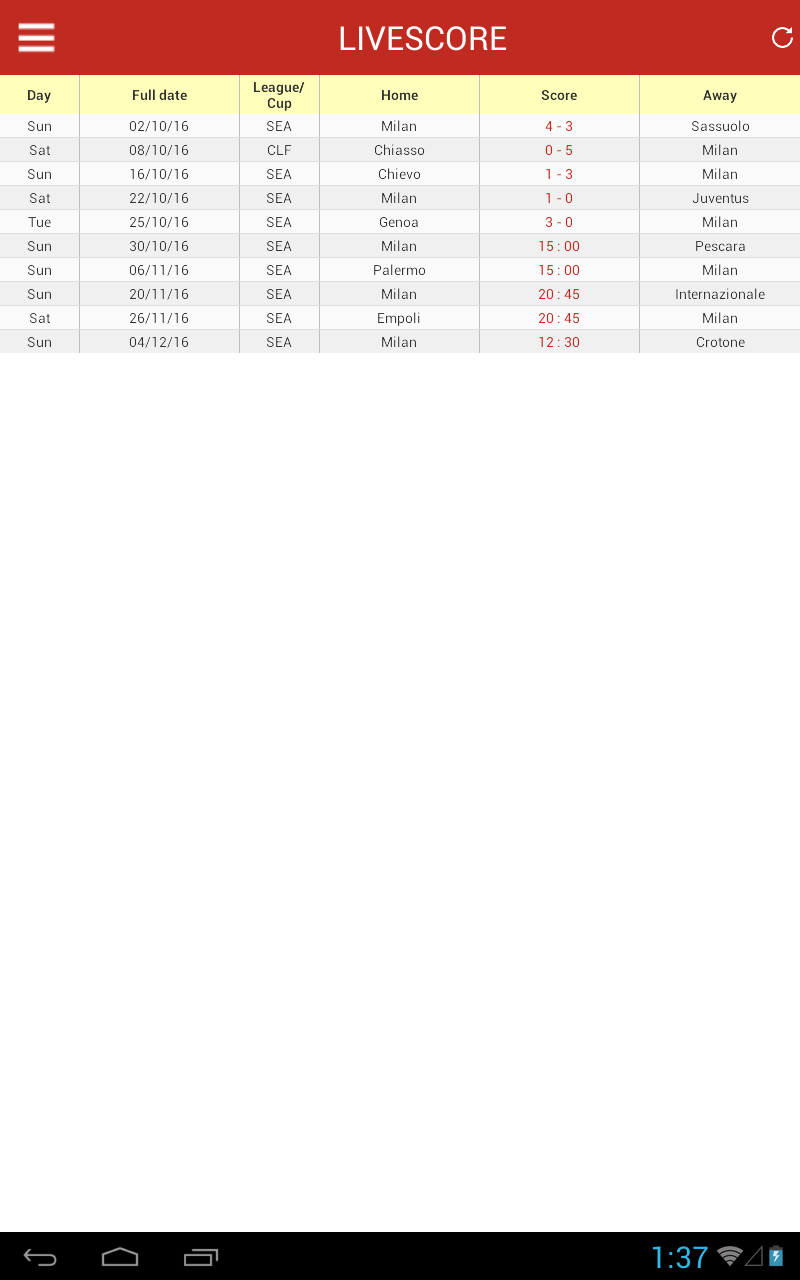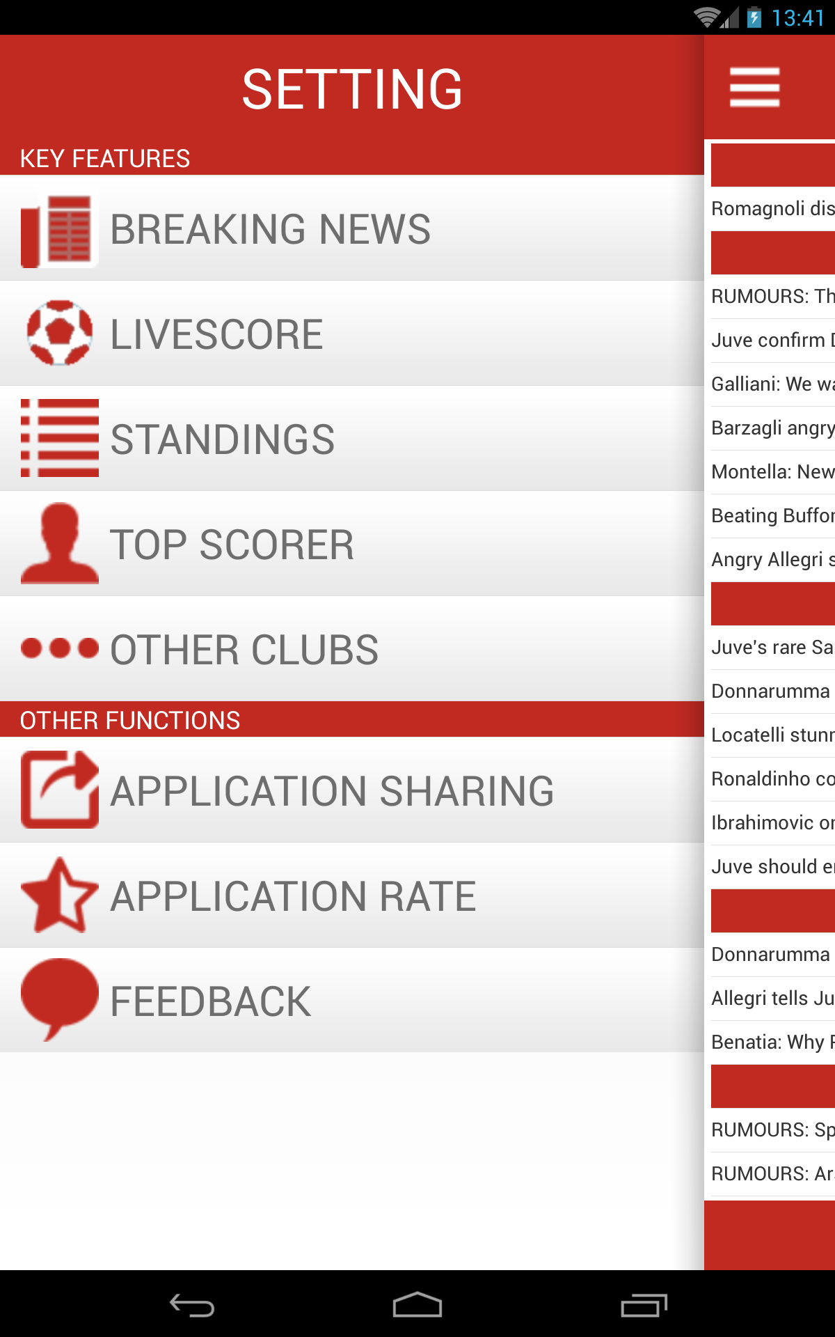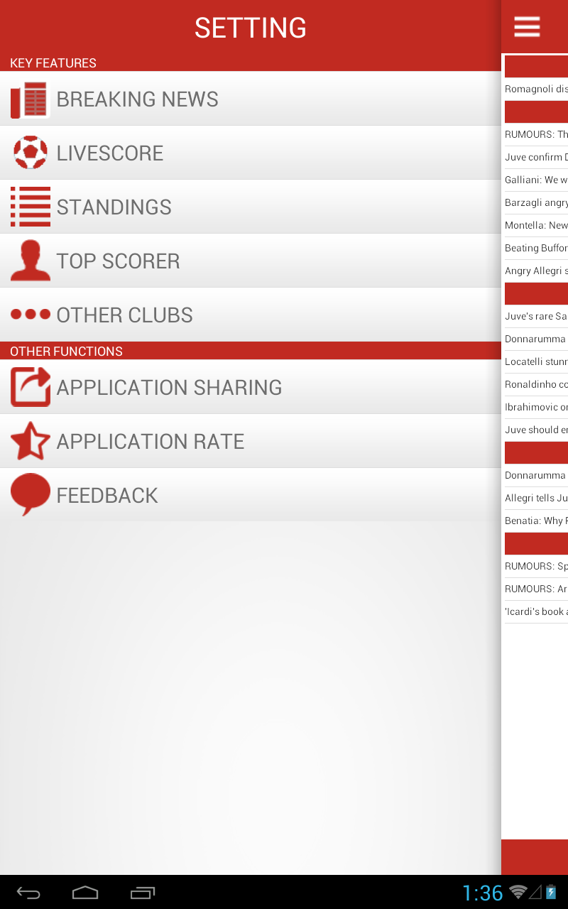 AC Milan Latest News app is application for the latest news on AC Milan club. When users click on the menu icon in the left corner of the application screen will appear the list of application functions: - BREAKING NEWS (Provide Breaking News about club AC Milan), when users click on the message to the page detailing the contents of each message (BREAKING NEWS DETAILS). - LiveScore (Provide the fastest results in the match on the club AC Milan). - Standings (Latest standings Serie A). - Top scorer (Providing top players scored most goals in Serie A). Thank for use Latest AC Milan News. If you like this app. Please give use five stars, Google+ and your feedback. Thank so much!