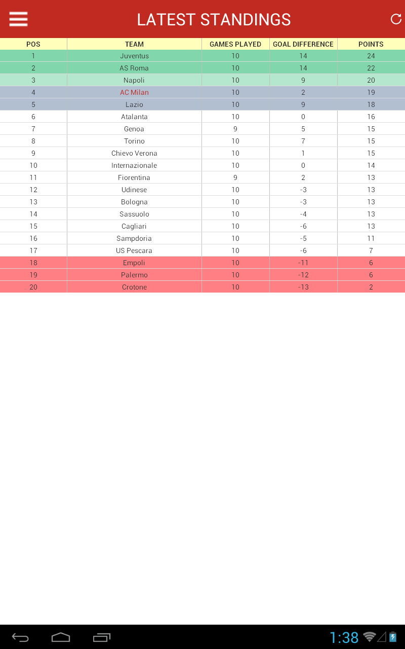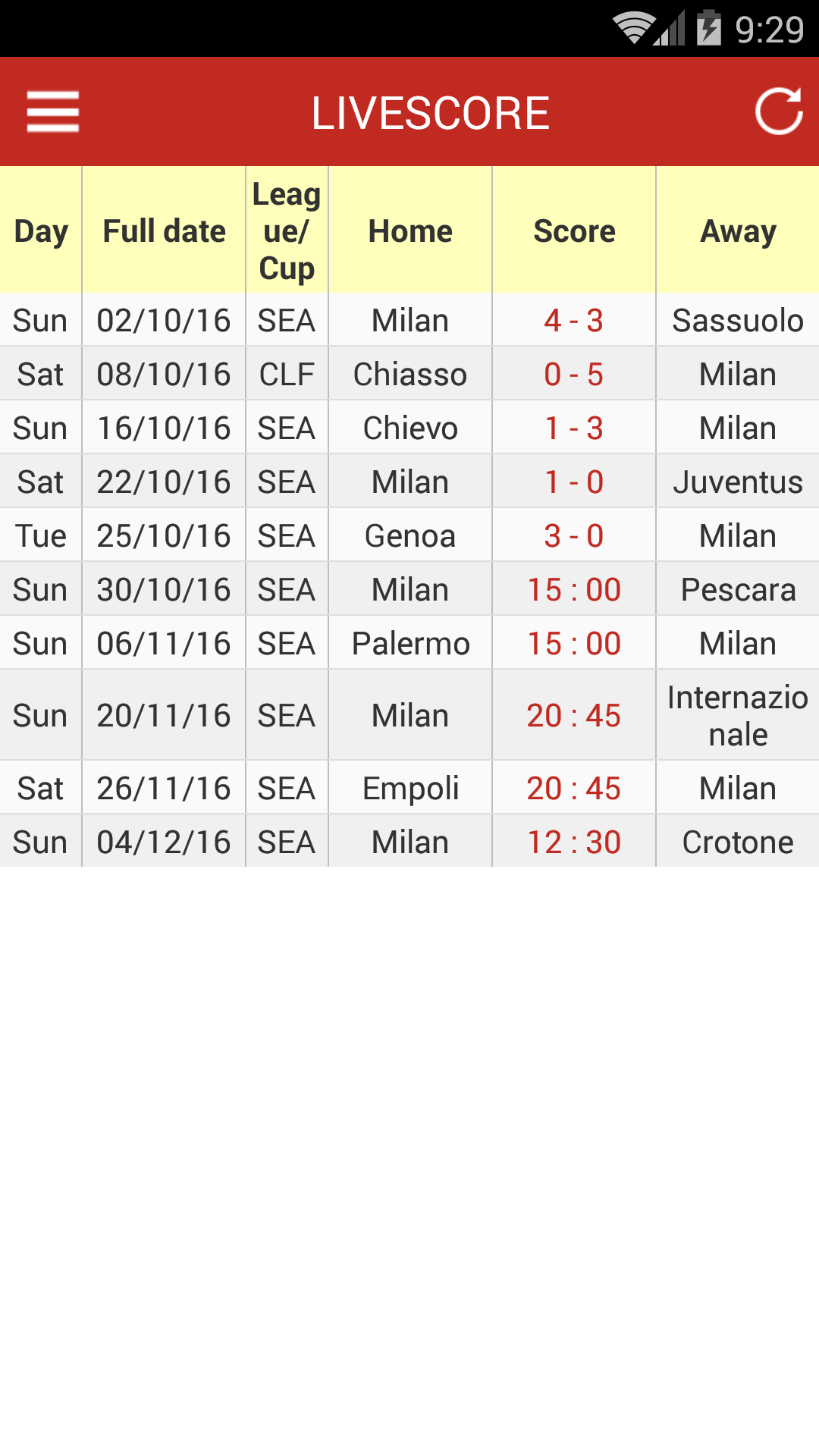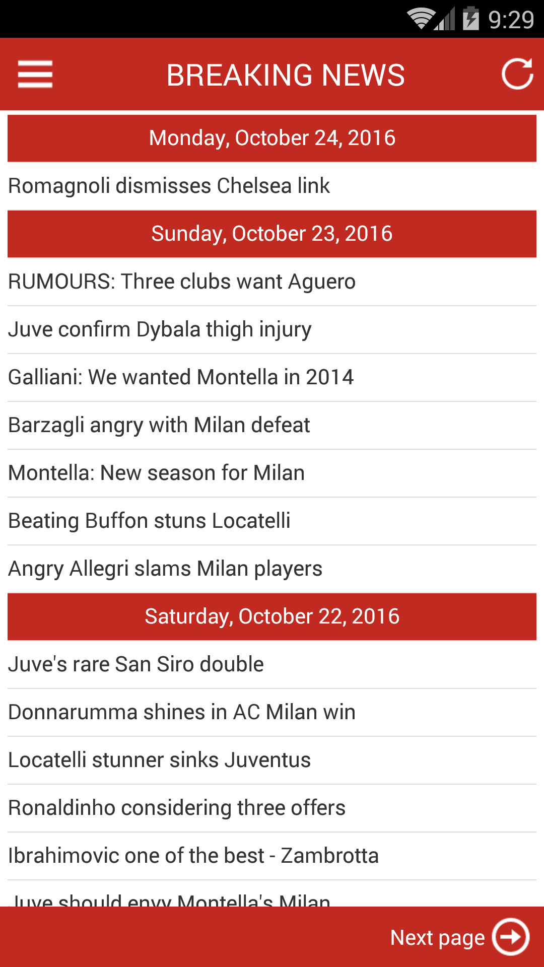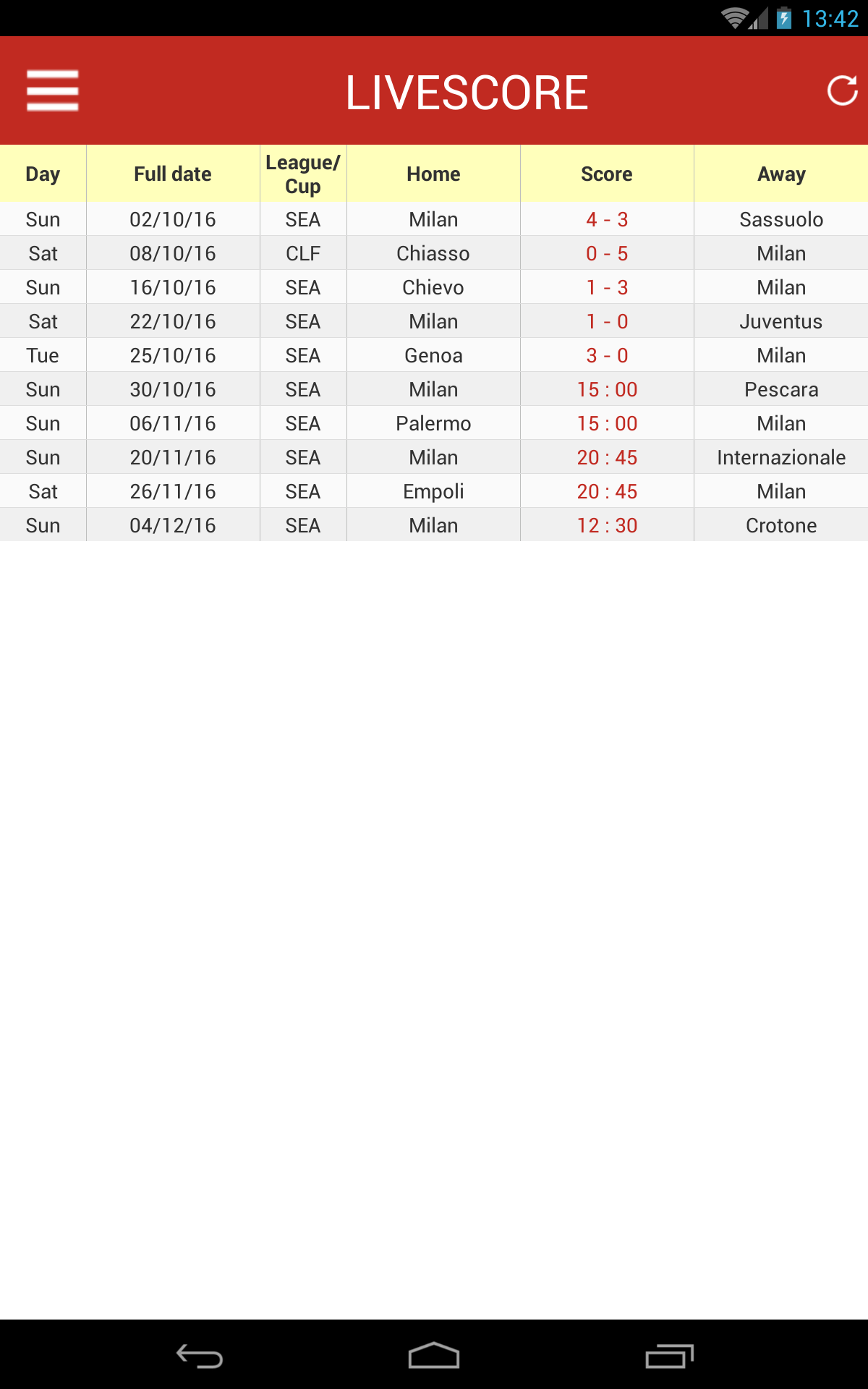 AC Milan Latest News app is application for the latest news on AC Milan club. When users click on the menu icon in the left corner of the application screen will appear the list of application functions: - BREAKING NEWS (Provide Breaking News about club AC Milan), when users click on the message to the page detailing the contents of each message (BREAKING NEWS DETAILS). - LiveScore (Provide the fastest results in the match on the club AC Milan). - Standings (Latest standings Serie A). - Top scorer (Providing top players scored most goals in Serie A). Thank for use Latest AC Milan News. If you like this app. Please give use five stars, Google+ and your feedback. Thank so much!