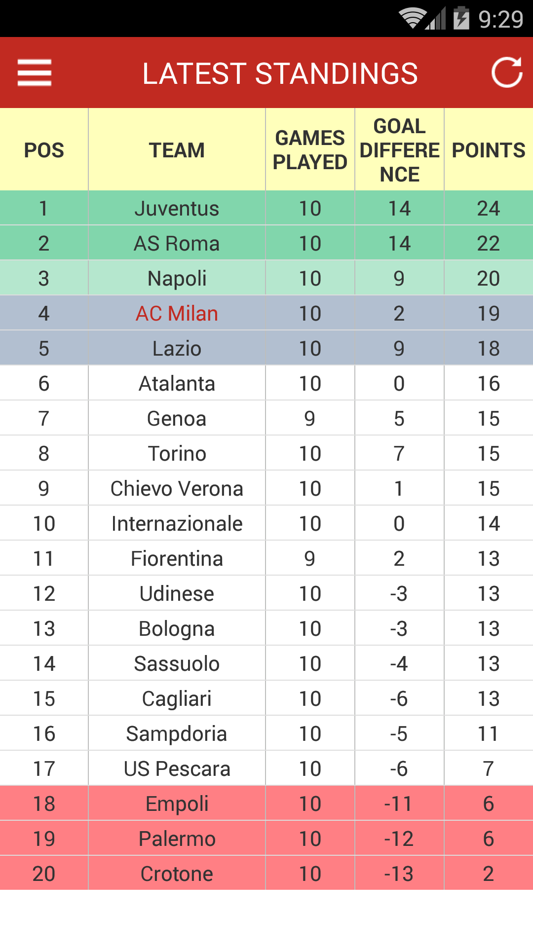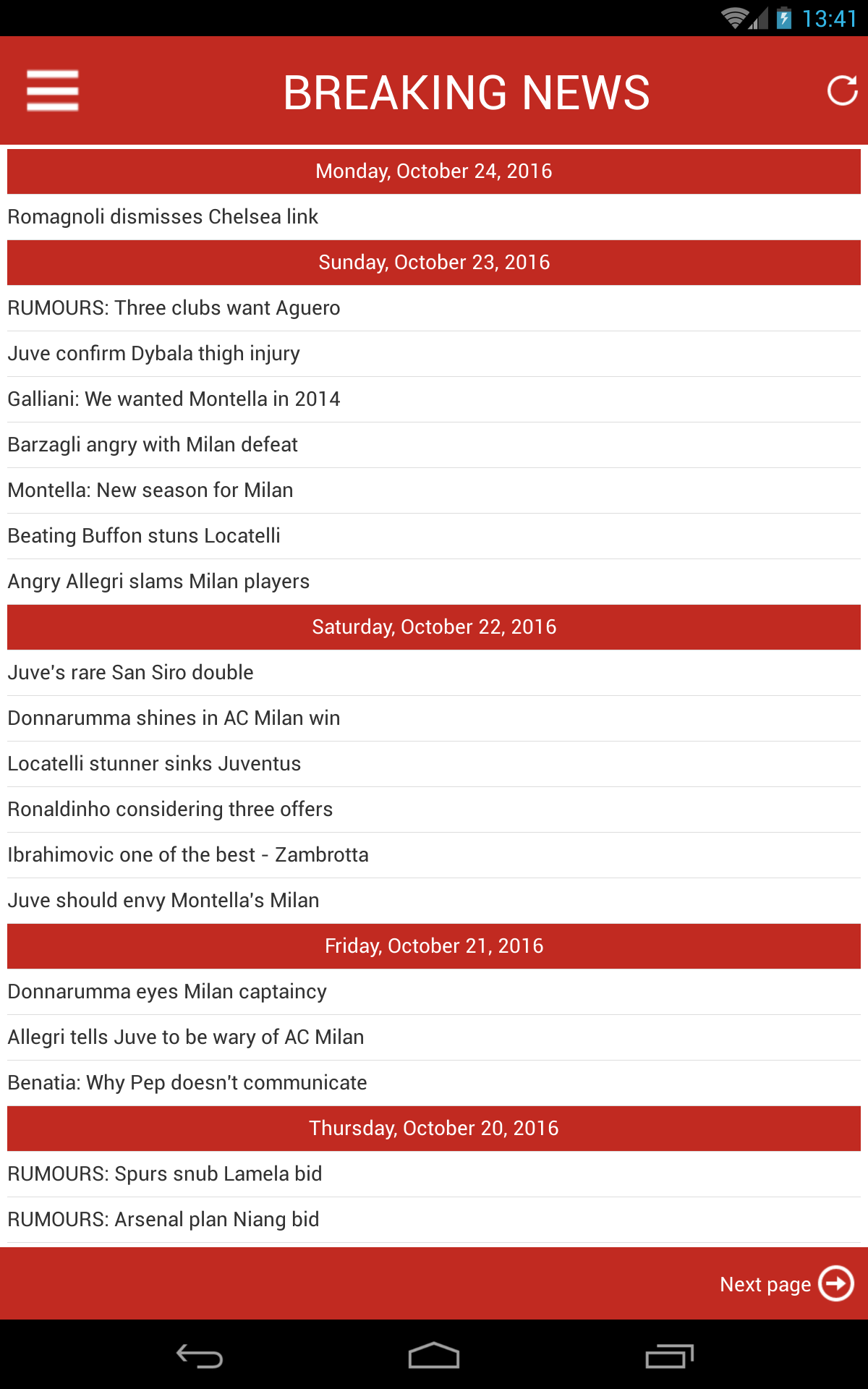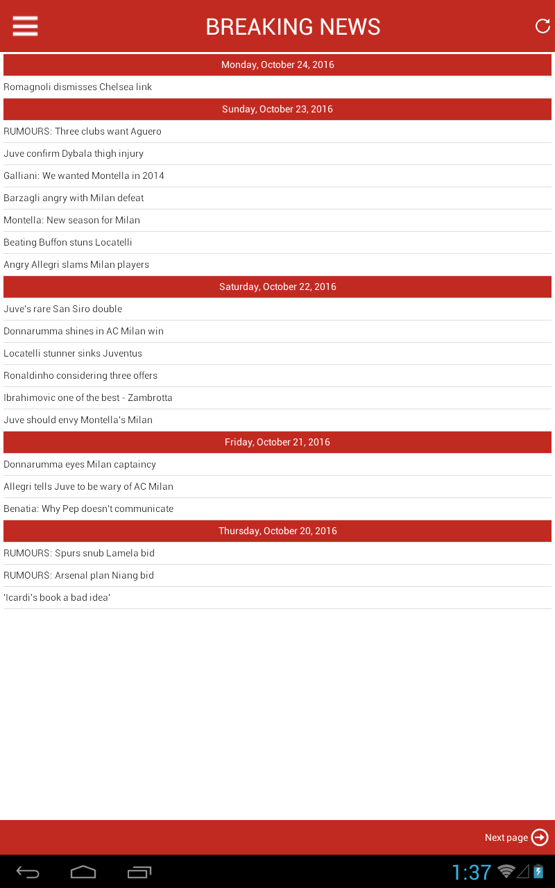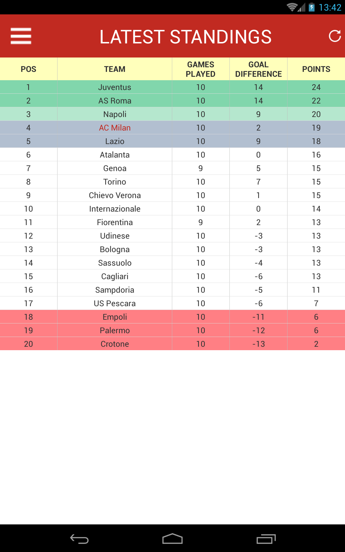 AC Milan Latest News app is application for the latest news on AC Milan club. When users click on the menu icon in the left corner of the application screen will appear the list of application functions: - BREAKING NEWS (Provide Breaking News about club AC Milan), when users click on the message to the page detailing the contents of each message (BREAKING NEWS DETAILS). - LiveScore (Provide the fastest results in the match on the club AC Milan). - Standings (Latest standings Serie A). - Top scorer (Providing top players scored most goals in Serie A). Thank for use Latest AC Milan News. If you like this app. Please give use five stars, Google+ and your feedback. Thank so much!