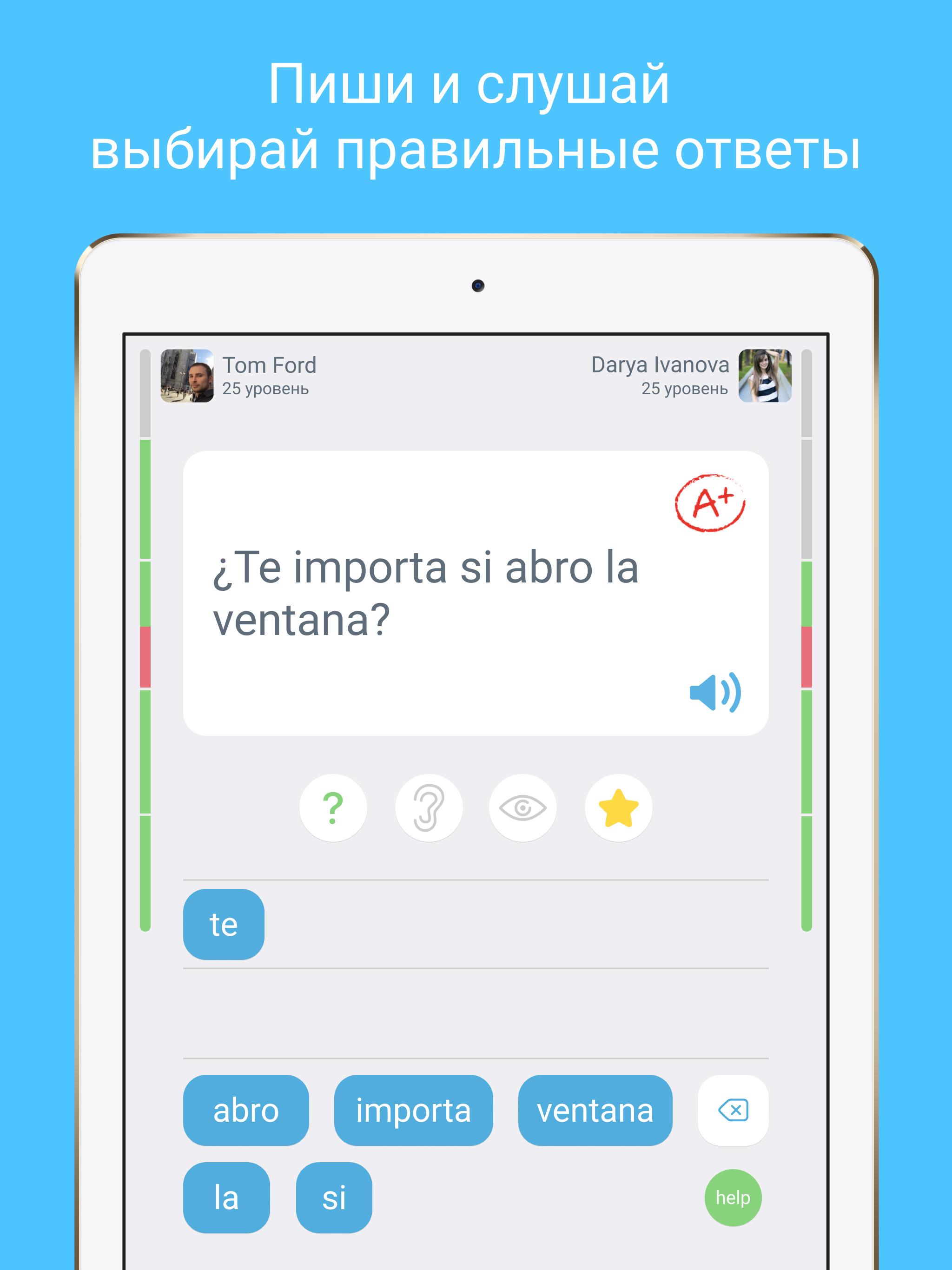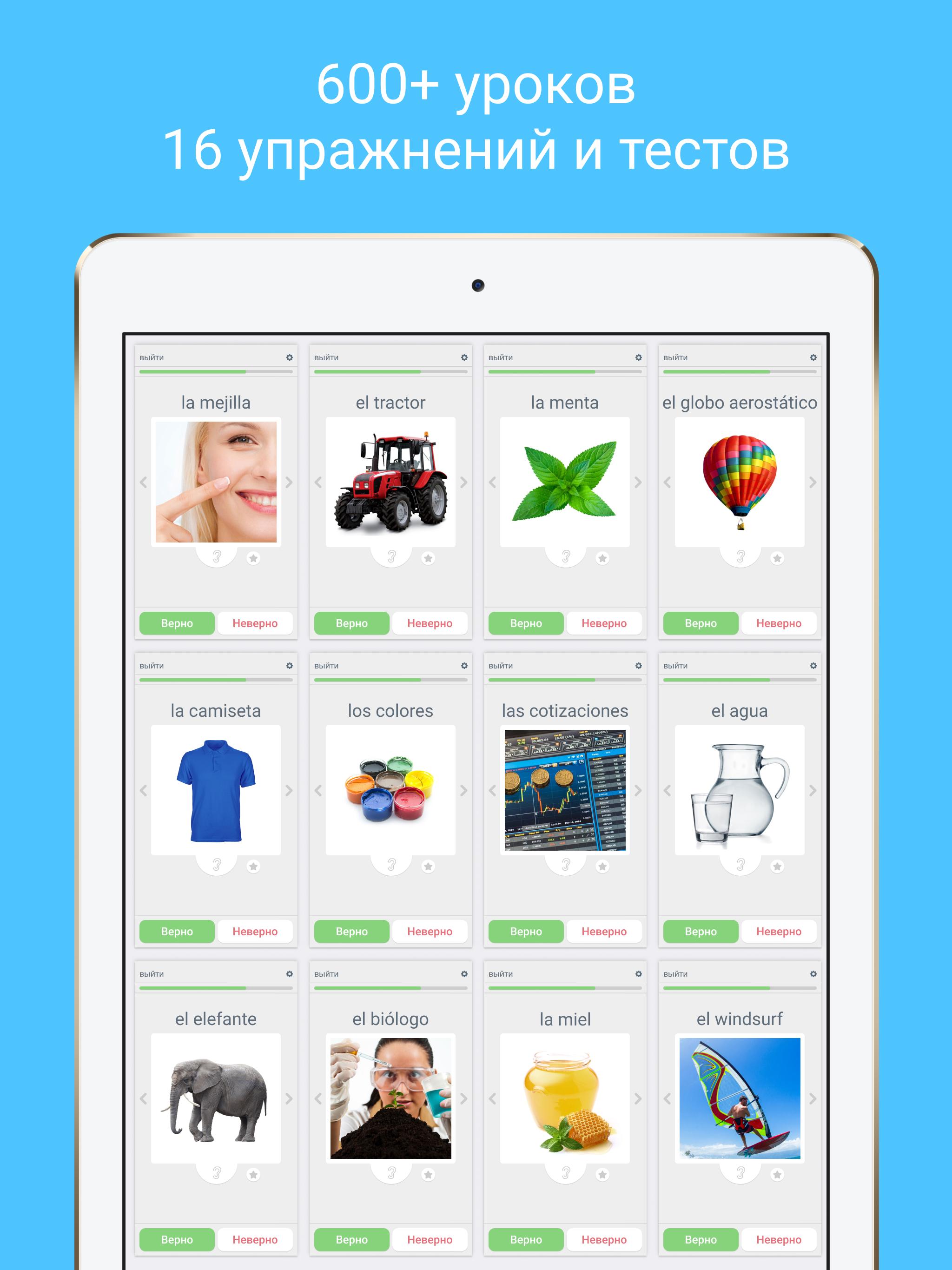 Игра онлайн также является одним из лучших способов проверить свои знания испанской] лексики. Играй в режиме дуэта с друзьями или другими игроками. Приложение содержит полезные функции, которые позволяют выполнять упражнения и проходить тесты, или изучать только то, что ты усвоил неправильно. Ты также можешь пропустить курс испанского для начинающих и перейти к более продвинутым урокам испанского.