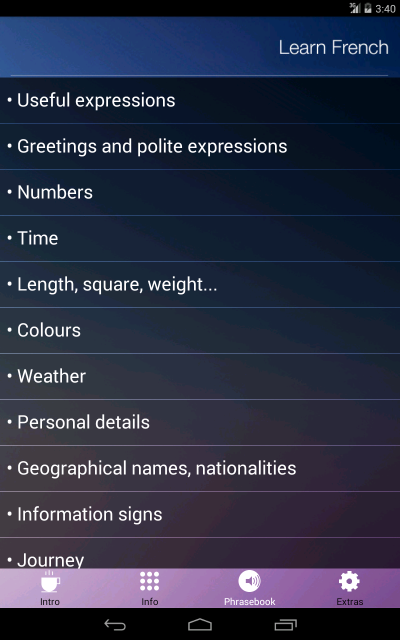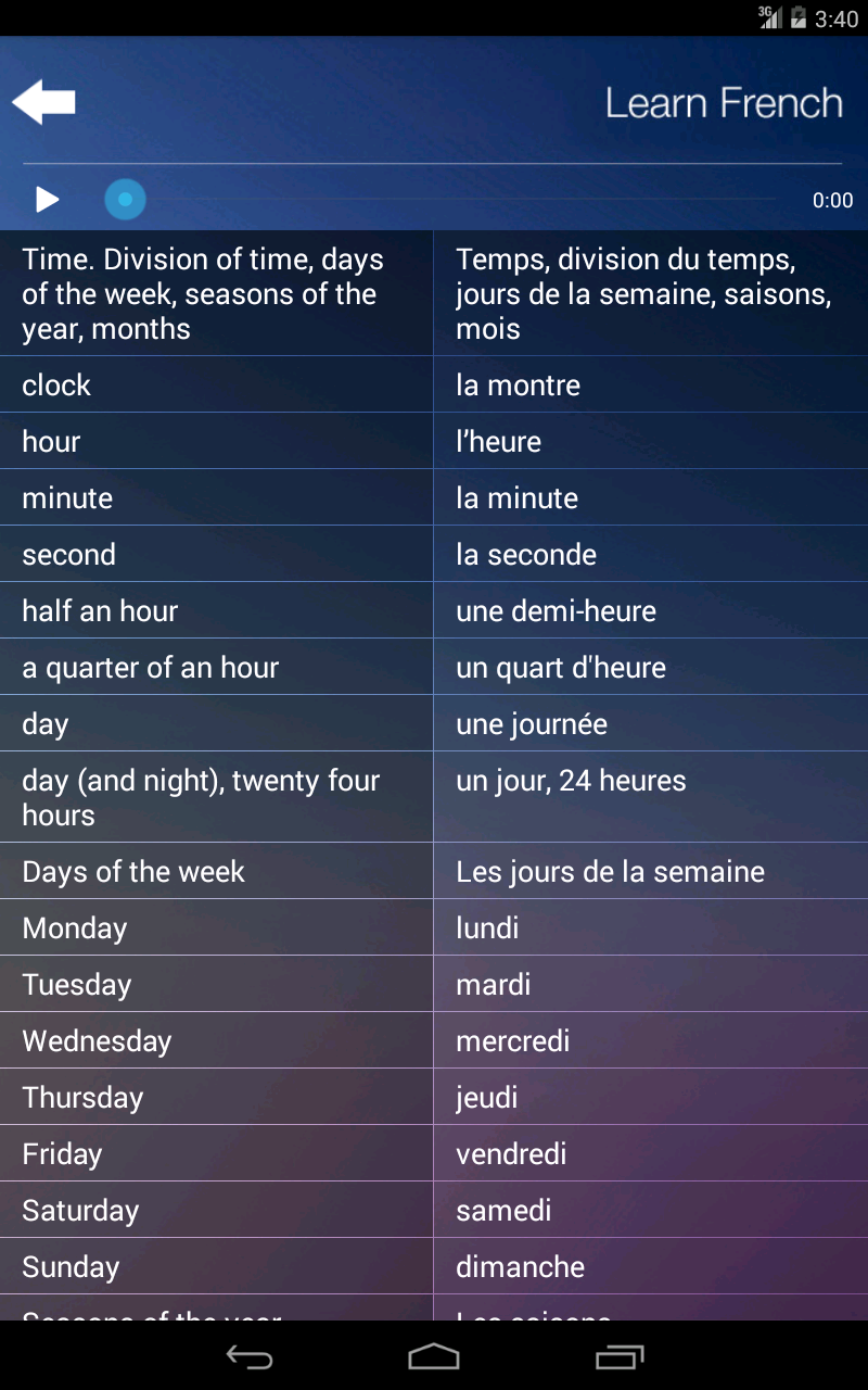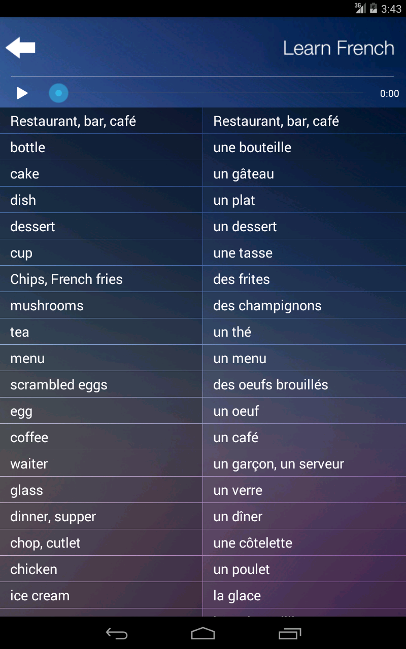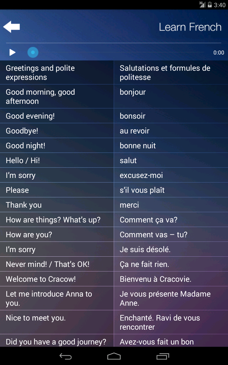 Наиболее существенные слова и фразы на французском языке, каждый с родной звуковой динамик. Идеальный путешествие приложение! Все аудио загружаются на устройство и доступен даже в режиме самолета или без дорогих международных роуминг.