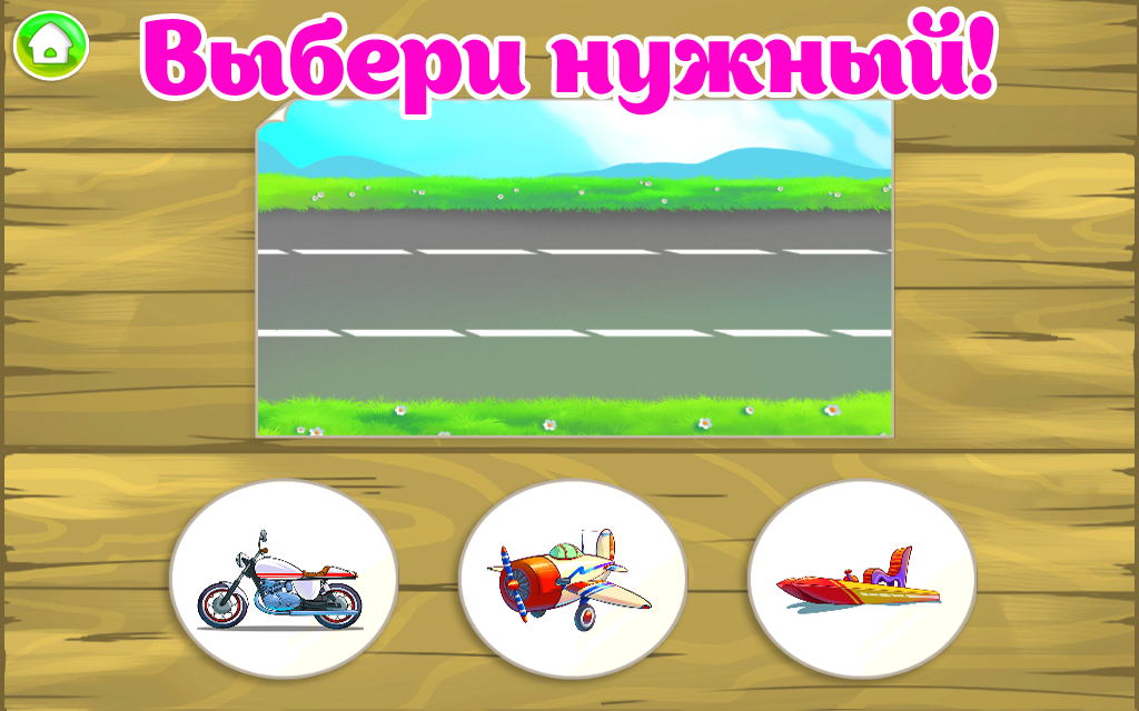 1.В первой мини-игре малыш должен выбрать лишний из доступных вариантов: ребенок видит четыре вида транспорта в определенной среде (вода, воздух, дорога) и должен указать на техника, которая в данной среде не передвигается. Например, автомобиль не летает по воздуху, в то время как воздушный шар, самолет и дирижабль летают.