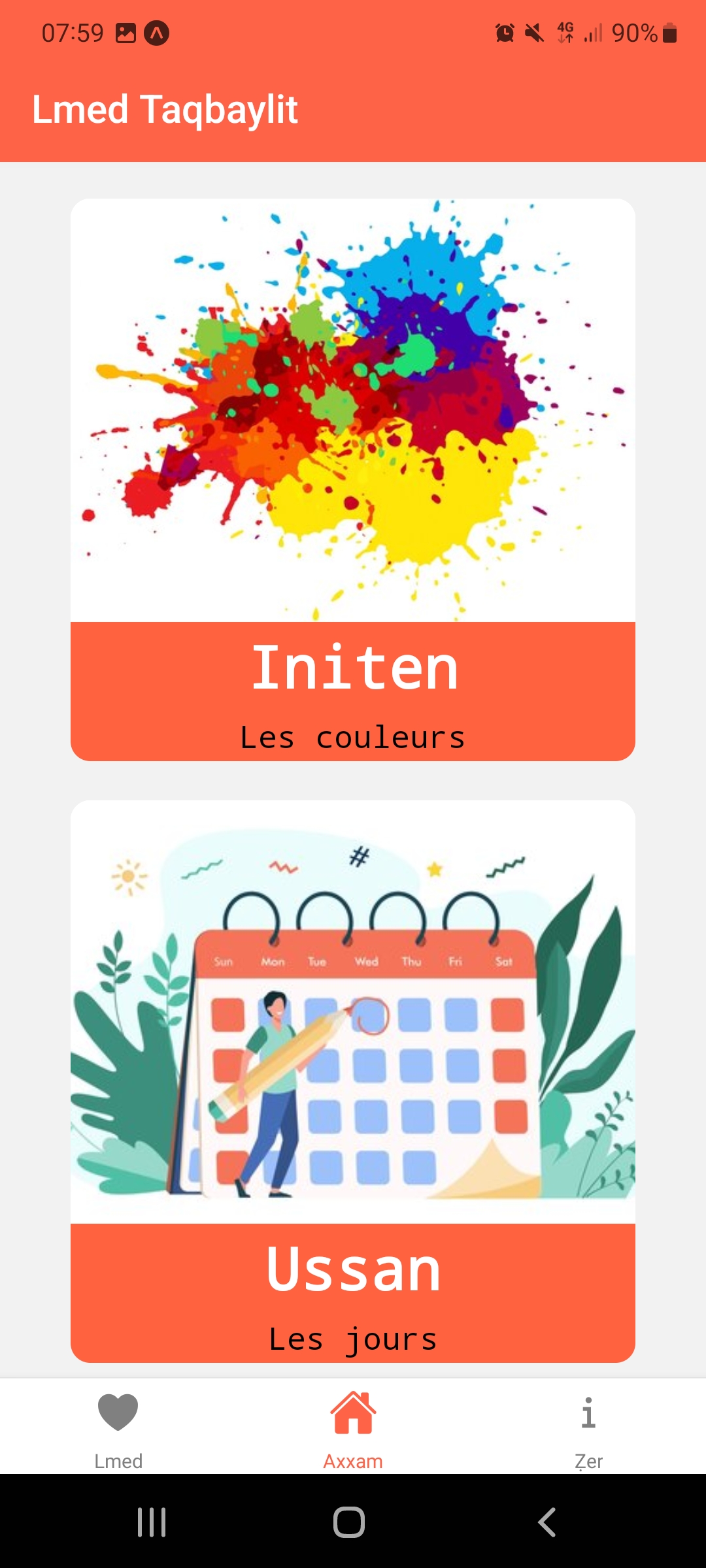 Приложение Lmed Taqbaylit — исключительный ресурс для изучения кабильского языка. Оно простое, практичное и богато иллюстрировано фотографиями и аудиофайлами, которые помогут вам правильно произносить слова. Лмед Такбайлит включает в себя несколько категорий, таких как алфавиты, животные, цифры, цвета, фрукты, овощи и даже планеты. Это приложение попадает в точку. Благодаря эргономичному, интуитивно понятному и практичному интерфейсу он предлагает бесплатно все основы для изучения кабильского языка. Lmed Taqbaylit, содержащий более 500 слов, позволяет опытным ораторам закрепить свои знания, а детям выучить свои первые слова на кабильском языке. Это приложение действует как книжка с визуальными картинками, помогающая идентифицировать объекты, и как голосовой гид, который оживляет их. Это бесплатное приложение еще больше обогащает уже доступные ресурсы, ставшие результатом нескольких месяцев напряженной работы. Это было бы невозможно без вклада многих анонимных участников, чья конечная цель — сохранить родной язык и предложить бесплатный инструмент для изучения этого языка, инструмент, который, вероятно, будет развиваться и постоянно обогащаться. Вы можете поддержать эту инициативу, скачав приложение, распространив информацию о нем и рассказав об этом достойном предприятии. Приложение Lmed Taqbaylit — отличный ресурс для изучения кабильского языка. Это просто, удобно и богато иллюстрировано изображениями и аудиофайлами, которые помогут вам правильно произносить слова. «Лмед Такбайлит» охватывает различные категории, включая алфавиты, животных, цифры, цвета, фрукты, овощи и даже планеты. Это приложение сразу переходит к делу. Благодаря эргономичному, интуитивно понятному и практичному интерфейсу он бесплатно предоставляет все основы для изучения Kabyle. Lmed Taqbaylit, содержащий более 500 слов, позволяет опытным ораторам закрепить свои знания, а детям выучить свои первые слова на кабильском языке. Он действует как книжка с визуальными картинками, помогающая идентифицировать объекты, и как аудиогид, оживляющий их. Это бесплатное приложение еще больше обогащает уже доступные ресурсы, ставшие результатом нескольких месяцев самоотверженной работы. Это было бы невозможно без вклада многочисленных анонимных людей, чья конечная цель — сохранить свой родной язык и предоставить бесплатный инструмент обучения, который может постоянно развиваться и совершенствоваться. Вы можете поддержать эту инициативу, загрузив приложение, распространив информацию среди своих кругов и поделившись этим похвальным начинанием.
