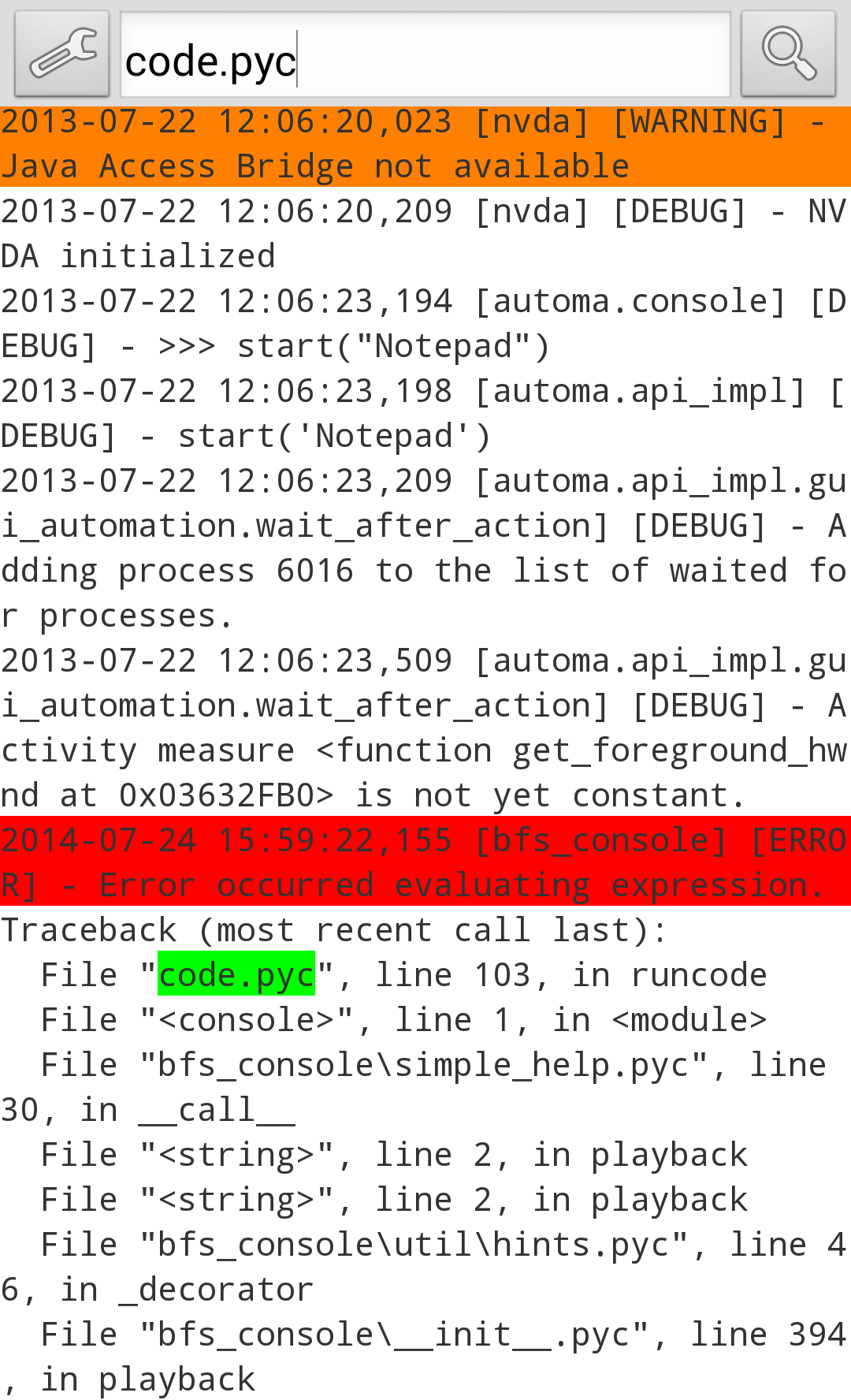 The built-in search function lets you find any text in your log file. The found string is highlighted in green. This is very useful when looking for specific information in your log files.