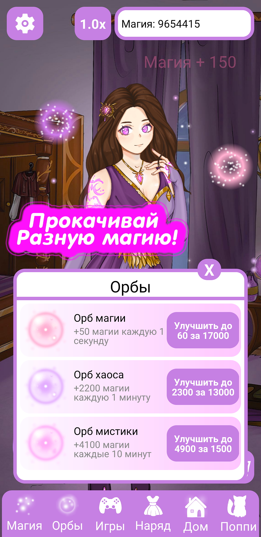 5.Экономическое распределение ресурсов. В игре кликере всегда приходятся манипулировать какими-то ресурсами (иногда в авто режиме). Где-то это деньги, а у нас это магия. Именно её мы накапливаем и тратим. От того, как вы будете тратить или копить магию и будет зависеть, как быстро вы пройдёте игру. В какой-то степени это как симулятор бизнеса где есть деньги, только магический и интересный! В этом смысл кликеров с прокачкой, улучшениями, апгрейдами, развитием и эволюцией.