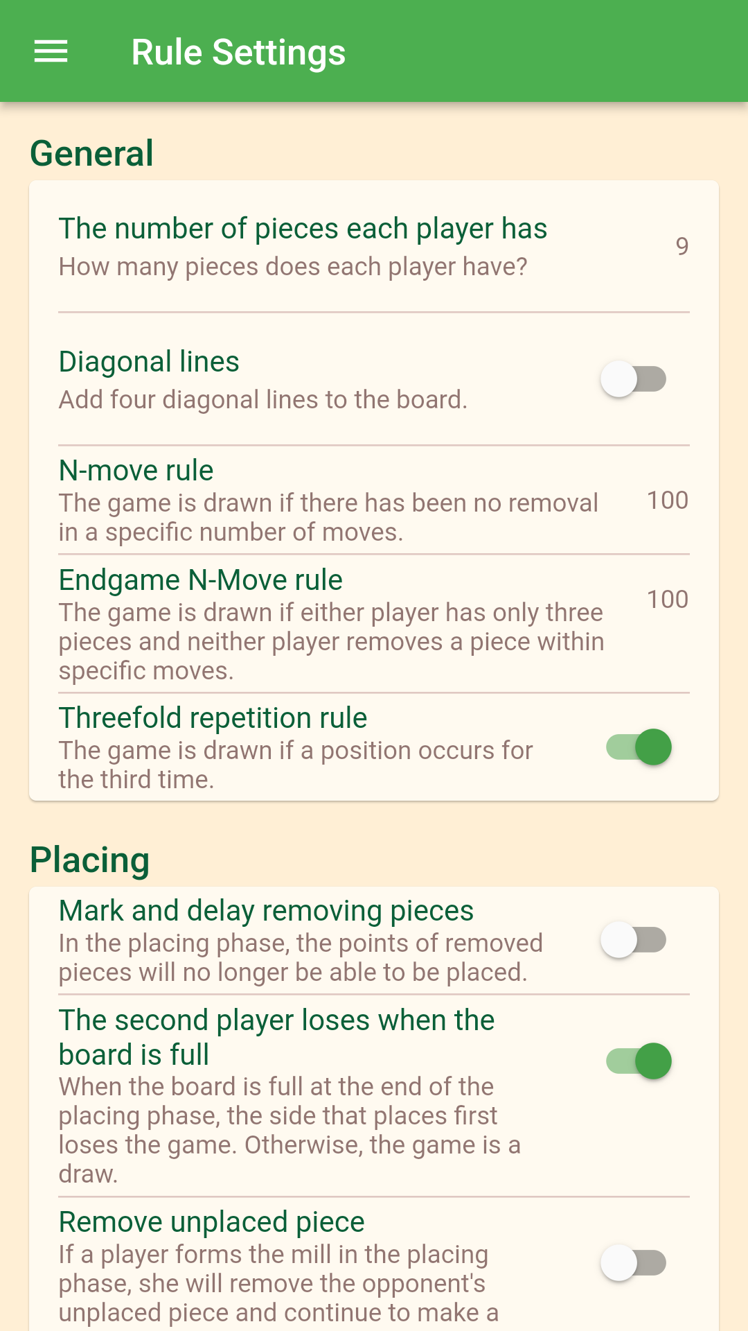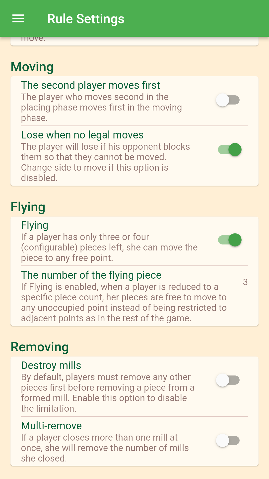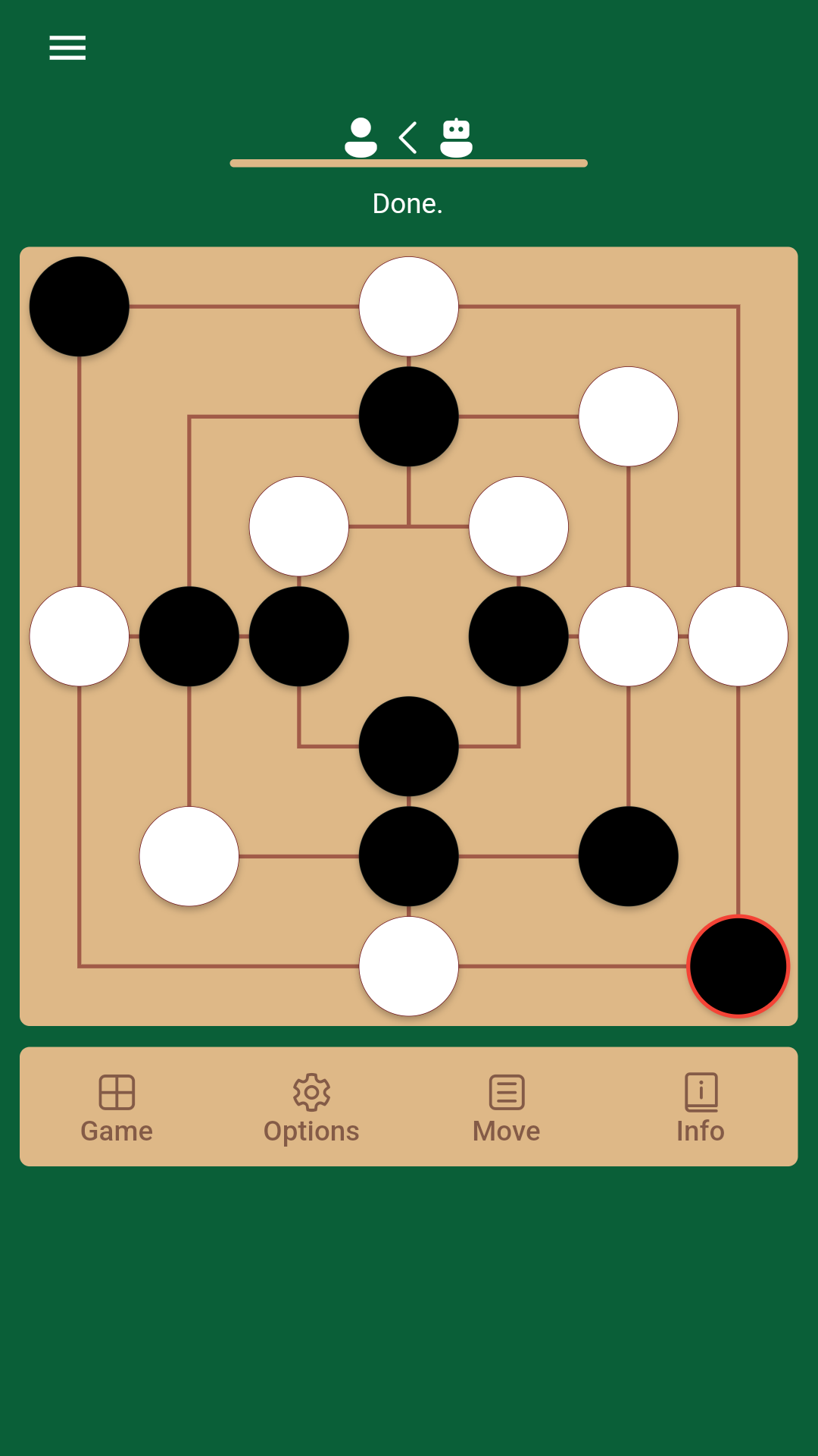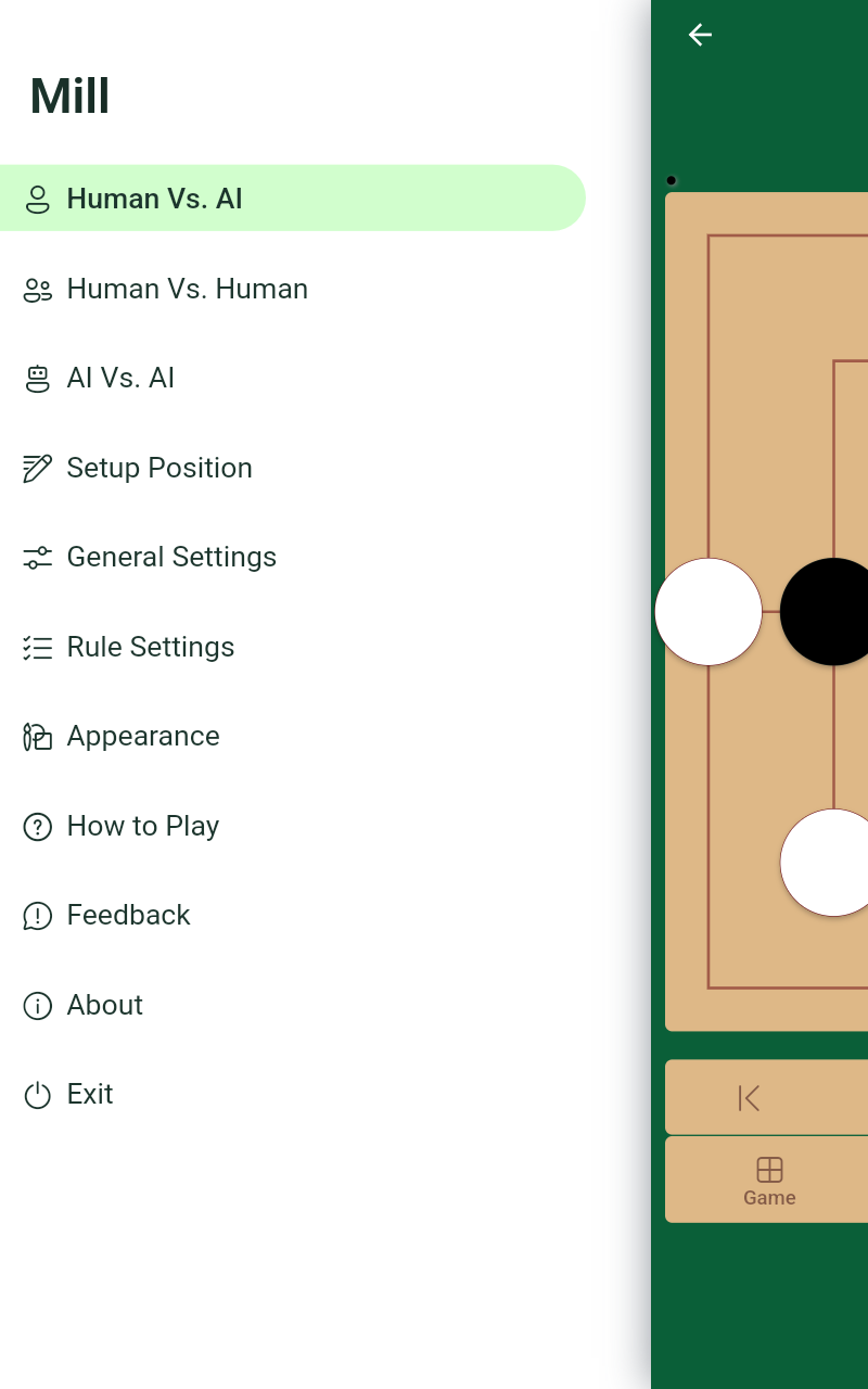 Правила: * Игрок, выровнявший три свои фигуры на линии доски, имеет мельницу и может удалить фигуру(ы) противника. * Любой игрок уменьшается до двух фигур и не имеет возможности формировать новые мельницы и, таким образом, проигрывает игру. * Если игрок не может передвинуть одну из своих фигур (заперт), он проиграл партию. Особенности: * Поддержка вариантов правил, таких как "Моррис девяти мужчин", "Моррис двенадцати мужчин", правило "полета" или без правила "полета". * Играйте против искусственного интеллекта или играйте за обе стороны. * Регулируемая сила игры. * Импорт/экспорт списка ходов. * Высокая настраиваемость. * Цветовые темы. * Доступен полный исходный код. * Поддерживает 40+ языков, таких как английский, персидский, немецкий, венгерский, русский, арабский, чешский, румынский, испанский, португальский, французский, итальянский, польский, турецкий, китайский, японский, корейский, хинди. Некоторые советы по стратегии для начинающих: * Играйте на перекрестных точках, так как они обеспечивают большую подвижность фигур. * Углы слабы, так как игрок может двигаться только в нескольких направлениях. * Дайте фигуре пространство для движения. * Не делайте мельницы сразу. Обычно первый игрок, сделавший мельницу в фазе расстановки, легко блокируется. * У черных есть преимущество, потому что они получают возможность стратегически разместить последнюю фигуру. * Двойные атаки - помните, что игроки могут атаковать две точки одновременно.