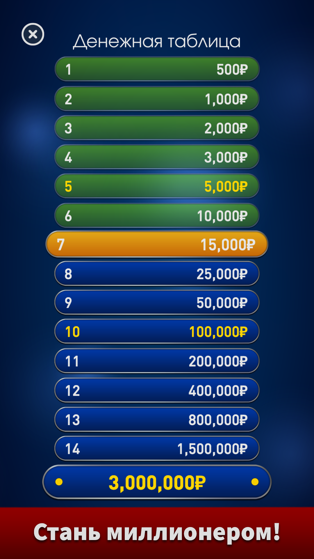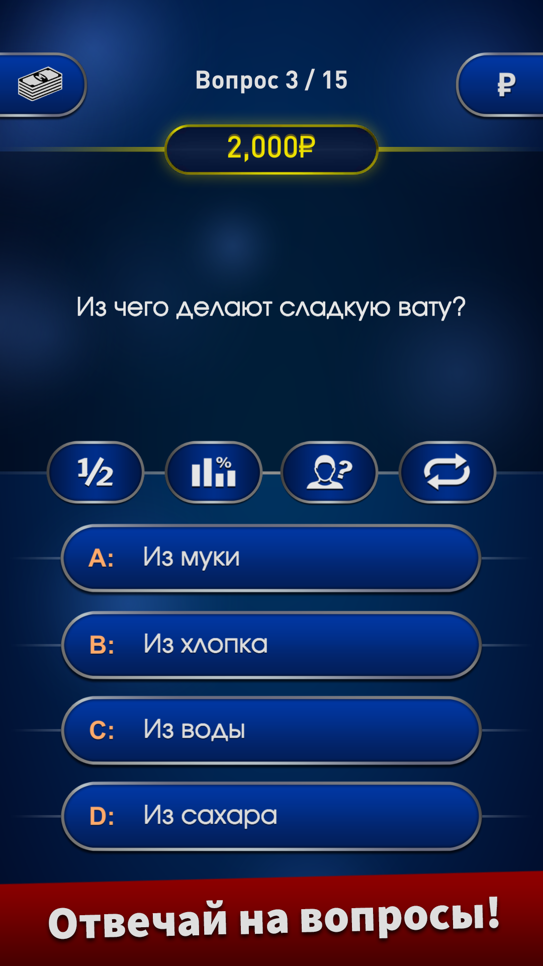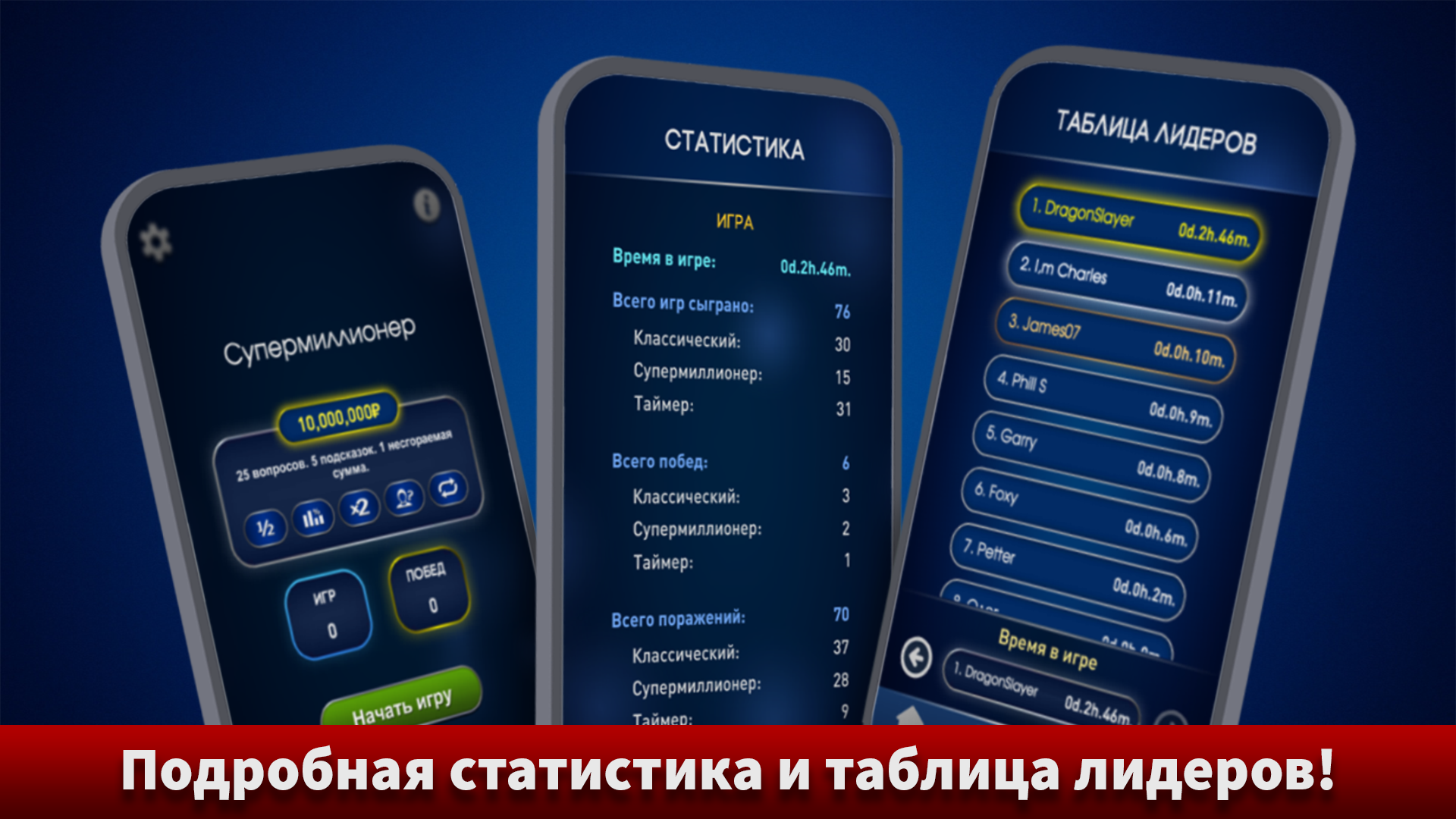 Совершенно новый режим "СУПЕРМИЛЛИОНЕР" с 25-ю вопросами, 5-ю подсказками и главным призом - 10 миллионов! Такого вы еще нигде не видели! Любителям классической версии игры предлагаем режим с 15-ю вопросами и выигрышем в 3 000 000. Заработанные очки теперь можно потратить на покупку разнообразных вещей, транспорта и даже недвижимости! Миллионер – это викторина для взрослых и для детей по мотивам телешоу, где вам предстоит ответить на ряд вопросов и заполучить заветный приз – 3 миллиона! Покупайте на заработанные очки разные предметы, транспорт, жильё и многое другое! Игра не требует интернета и является совершенно бесплатной! В новой версии игры Миллионер 2023 мы подготовили для вас обновленную базу самых интересных вопросов - их более 30 тысяч! Окажитесь в центре внимания, ощутите себя игроком знаменитого шоу для тех, кто хочет стать миллионером. Покажите всем, что вы самый умный и эрудированный! Тренируйте свой интеллект и ум, отвечая на самые каверзные вопросы и находя правильные ответы. Возглавьте таблицу рекордов и пригласите друзей посоревноваться с вами в этой интеллектуальной викторине! Вы любите викторины, вопросы и логические задачи? Вам нравятся тесты на проверку знаний? Если да, то эта игра для вас Викторина подходит и для детей, первые уровни совсем несложные и даже самые маленькие смогут найти правильные ответы. Особенно весело играть всей семьей, узнавая новое! Правила викторины Миллионер 2023 Для того чтобы выиграть 3 миллиона виртуальных рублей и стать миллионером, нужно правильно ответить на 15 вопросов, к каждому вопросу предлагается 4 варианта ответа. Игра начинается с простых вопросов, и с каждым новым уровнем вы переходите к более сложным. Чем более вы эрудированны и отвечаете правильно, тем больше игровых денег вы получаете. Особенности нашей викторины: - огромная база вопросов из различных областей, категорий и уровней сложности, обновляющихся каждый месяц. - возможность потратить заработанные виртуальные деньги на покупку вещей в свой дом - нарастающий уровень сложности. - 15 интересных заданий на пути к возможности стать миллионером - 4 типа подсказок - несколько режимов игры - качественная и проработанная графика, анимация и звуковое сопровождение; - простой и очень захватывающий игровой процесс. - подключение к Интернету не требуется. - подходит для любого возраста. - онлайн таблица рекордов! Идеальная игра, чтобы провести время с семьей или в кругу друзей! Покажите кто здесь самый умный ! Кто самое сильное звено? Кто хочет стать миллионером? Играйте бесплатно в викторину - игру Миллионер 2023 и выигрывайте! Пусть 3 миллиона и не реальные, но ведь всегда приятно почувствовать себя эрудитом и посоревноваться в этом с друзьями. Усовершенствуйте свой интеллект в нашей trivia игре! Кто хочет стать миллионером?! В нашей игре много как логических, так и просто вопросов на знания. Она поможет вам проявить эрудицию и стать миллионером! Надеемся, что вам очень понравится в нашей игре и вы еще не раз запустите приложение, чтобы попробовать выиграть миллион! Удачи в викторине! Примечание: призы в игре виртуальные.