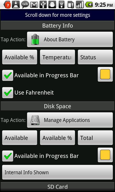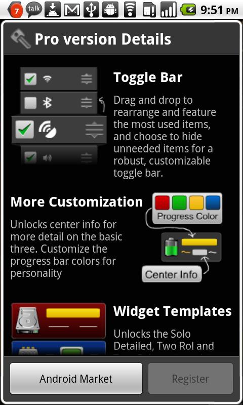 - Переключение Бар с 11 переключает: Wi-Fi, GPS, Bluetooth (BT), громкость, яркость, режим полета, время отключения экрана, APN (3G GSM EDGE), Графический ключ разблокировки, автоматического поворота, Автоматическая синхронизация