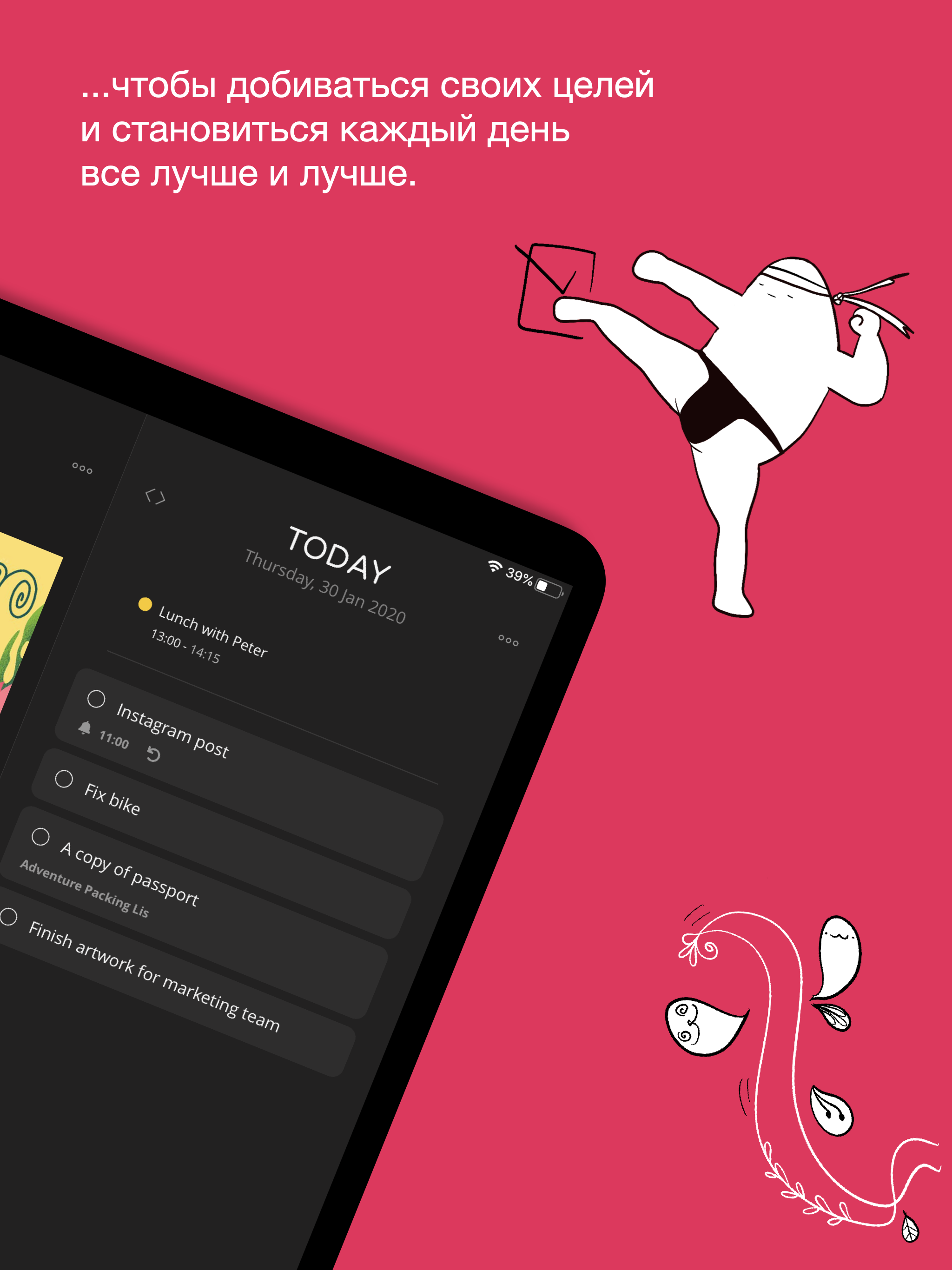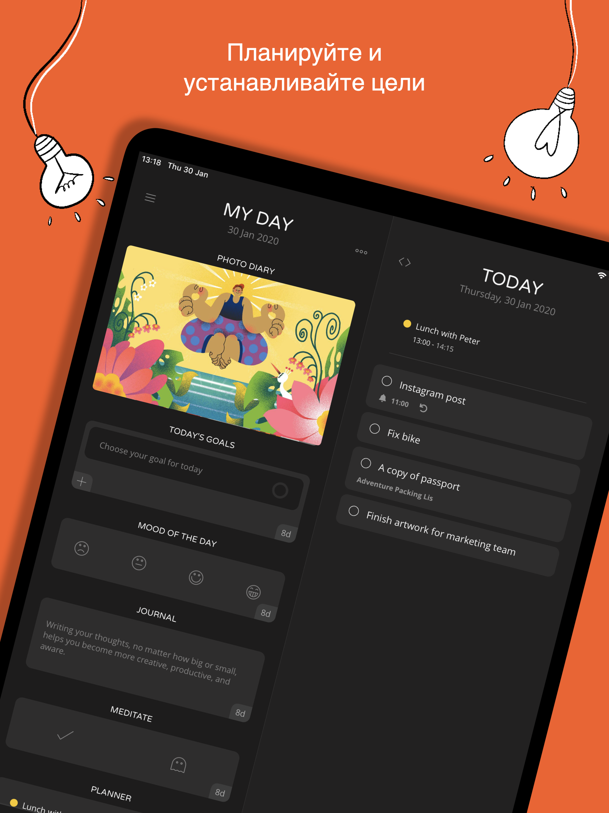 Разработанное для людей творческих, независимых и свободных духом, для дерзких первопроходцев, приложение Moleskine Journey сочетает лучшие функции офисных приложений (календарей, напоминаний и заметок) с такими инструментами для развития личности, как дневники и трекеры привычек. Moleskine Journey позволяет планировать и успешней справляться с большинством важных дел дома и на работе, проявляя при этом креативность. 4 настраиваемых раздела этого минималистского и интуитивно понятого приложения посвящены различным аспектам жизни пользователей. *МОЙ ДЕНЬ* В этом разделе Moleskine Journey можно устанавливать себе цели, оценивать достигнутый прогресс и ежедневно следить за своими привычками. *ПЛАНИРОВЩИК* Здесь можно просматривать все свои задания и события, составлять графики и намечать следующие шаги. *ПРОЕКТЫ* Здесь можно хранить заметки, задания, напоминания, медиаконтент, ссылки и события, сгруппированные по темам. *ЗАДАНИЯ* Здесь можно быстро записывать дела, которые еще необходимо запланировать, либо просматривать сразу все свои задания. Добавьте в раздел «Мой день» свои привычки. ЦЕЛИ Что важно сделать именно сегодня? Используйте раздел «Мой день» для постановки целей на день. Составьте список задач или покупок. Как бы вы ни настроили этот раздел, список на день – простой, но эффективный способ придать повседневным усилиям четкость и целенаправленность. ЕЖЕДНЕВНИК Привычка записывать свои мысли, важные и не очень, помогает стать более креативным, продуктивным и внимательным к происходящему. Используйте Moleskine Journey для ежедневной записи идей, мыслей и ощущений. Ведите журнал учета работы, дневник путешественника или просто записывайте, что вы делаете или чувствуете каждый день, или то, что вас вдохновляет. ДНЕВНИК ПИТАНИЯ Пробуете ли вы новую диету или фиксируете свои достижения кулинара, привычка следить за тем, что ешь, поможет оставаться здоровым и расширить свои кулинарные горизонты. Вести дневник питания с фотографиями и настроенными описаниями – тоже веселый, полезный и простой способ следить за своими пищевыми привычками. Этот визуальный инструмент мгновенного действия помогает изучать физические реакции и выявлять пищевые триггеры и продукты питания, позволяющие сохранять и здоровье, и хорошее настроение. ФОТОДНЕВНИК Выберите по одной фотографии с места каждого события. Снимайте каждый день то, что вас вдохновляет, и создайте каталог изображений, заставляющий двигаться вперед. СЛОЖНАЯ ЗАДАЧА Следите за своими привычками и находите стимулы для достижения своих целей одна за другой. Что бы вы ни решили изменить, главное – вписать соответствующую привычку в свою повседневную жизнь и придерживаться ее. Трекер задачи помогает разбить эти цели на ежедневные крошечные подцели. Вспомните прошлую неделю, месяц или год и получите прилив энергии от каждой мелочи, приближающей вас к реализации своей мечты. Moleskine Journey – платное приложение с бесплатным пробным периодом. Скачайте его бесплатно и попробуйте безо всяких препятствий. Приобретя подписку по окончании пробного периода, вы сможете использовать его на всех устройствах. Приложение может использоваться и в отсутствие действующей подписки, но в режиме «только для чтения». • Неограниченный доступ со всех устройств. • Месячная или годовая подписка. Политика конфиденциальнос