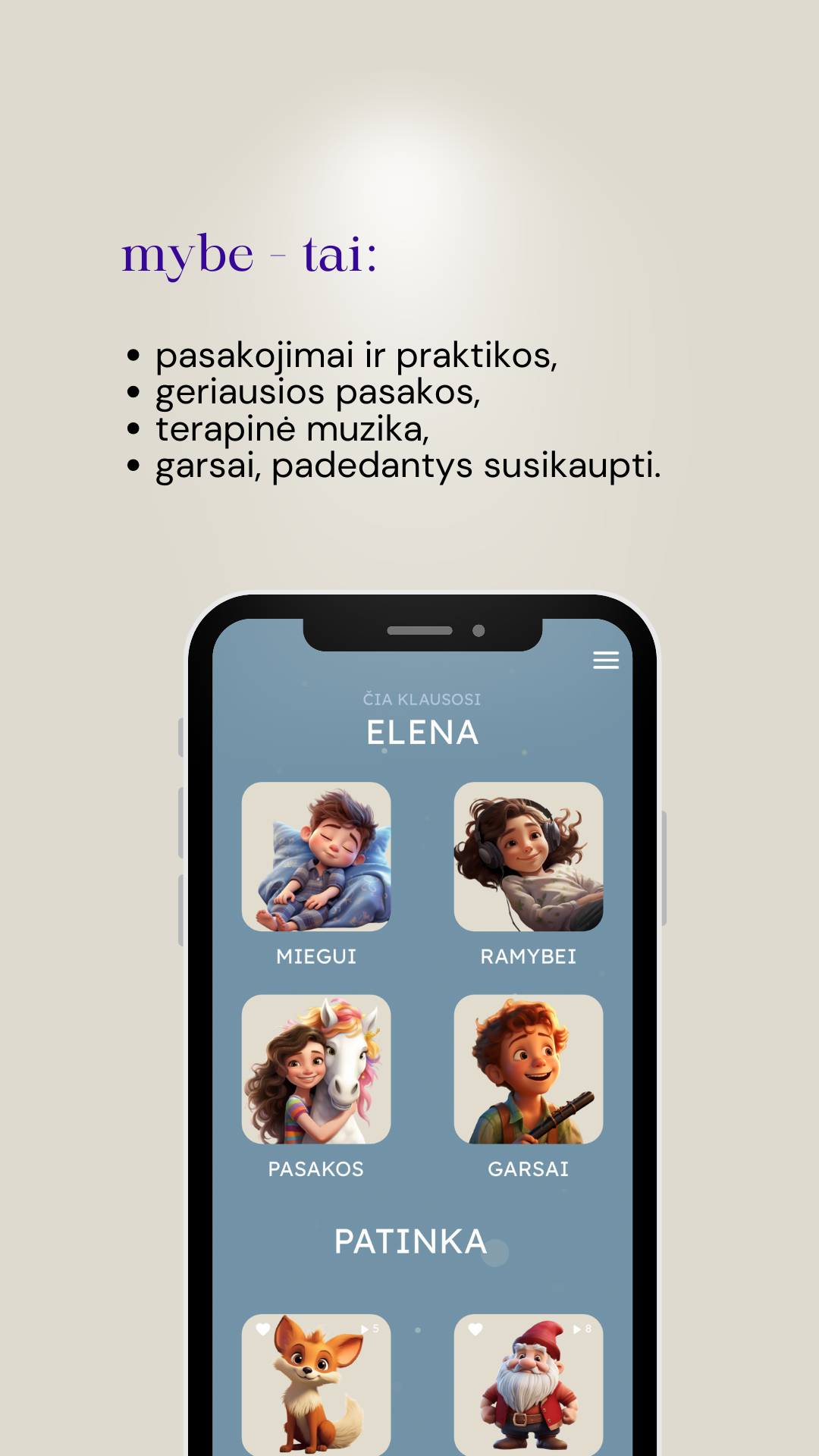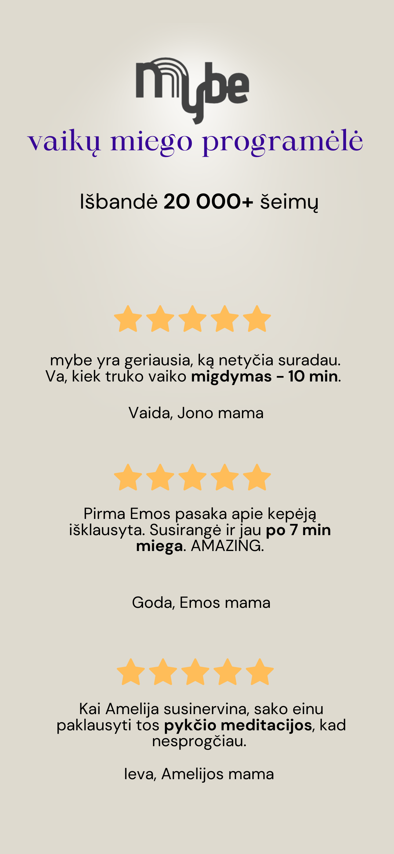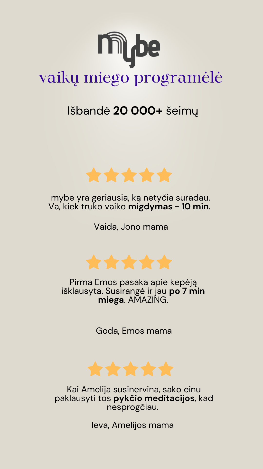👋 Привет, это Майб. Записи в нем помогают детям сосредоточиться утром, успокоиться днем и заснуть ночью. СПАТЬ Сон — лекарство от чувствительности к раздражителям и условие продуктивного дня. Мы знаем это и уже помогли заснуть более чем 20 000 детям. Как? Мы записываем колыбельные с тщательно подобранными историями, самыми успокаивающими голосами, успокаивающими мелодиями и звуками природы. Говорят, дети засыпают за 6 или 10 минут 💤, а у родителей целый длинный свободный вечер. ВНИМАНИЕ Вы заметили, что вашему ребенку трудно сосредоточиться? У нас есть саундтреки, созданные музыкальными терапевтами, которые помогут вам лучше сосредоточиться. Как это работает? Ну, они просто занимают ту часть мозга, которая склонна отвлекаться, и позволяют вам сосредоточиться и читать, конструировать, лепить. Со временем дети учатся концентрироваться. МИР Можно избежать ежедневных эпизодов стресса, беспокойства или гнева. Необходимо помочь ребенку, сенситивному к повседневной деятельности и сенсорным раздражителям, снова обрести равновесие. В приложении Mybe представлены разработанные экспертами практики, которые помогут вам успокоиться с помощью дыхательных упражнений, терапевтических мелодий и успокаивающих историй. Со временем дети могут научиться менее реагировать на раздражители. ИЗОБРАЖЕНИЕ Слушая сказки в стихах, дети развивают не только воображение, но и речь. В приложении Mybe вы услышите лучшие классические литовские сказки в стихах – «Грибная война», «Аге мелаге» и другие. РЕШЕНИЕ ДЛЯ ПОЗИТИВНОГО РОДИТЕЛЬСТВА Создавая приложение Mybe, мы стремились подарить счастье вам, родителям. Мы хотим позволить вам жить более спокойно, наслаждаться родительством и создать связь с эмоционально более сильным ребенком, который хорошо спал. Мы стремимся, чтобы вы каждый день чувствовали себя лучшей мамой или папой.