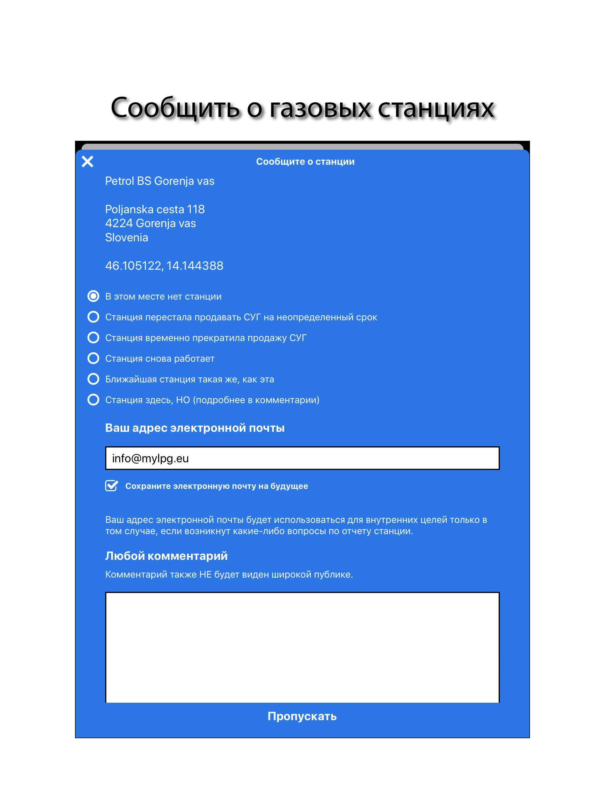 С помощью вас и других пользователей портала и приложений myLPG.eu мы расширяем базу данных заправочных станций сжиженного нефтяного газа и делаем ее максимально актуальной.