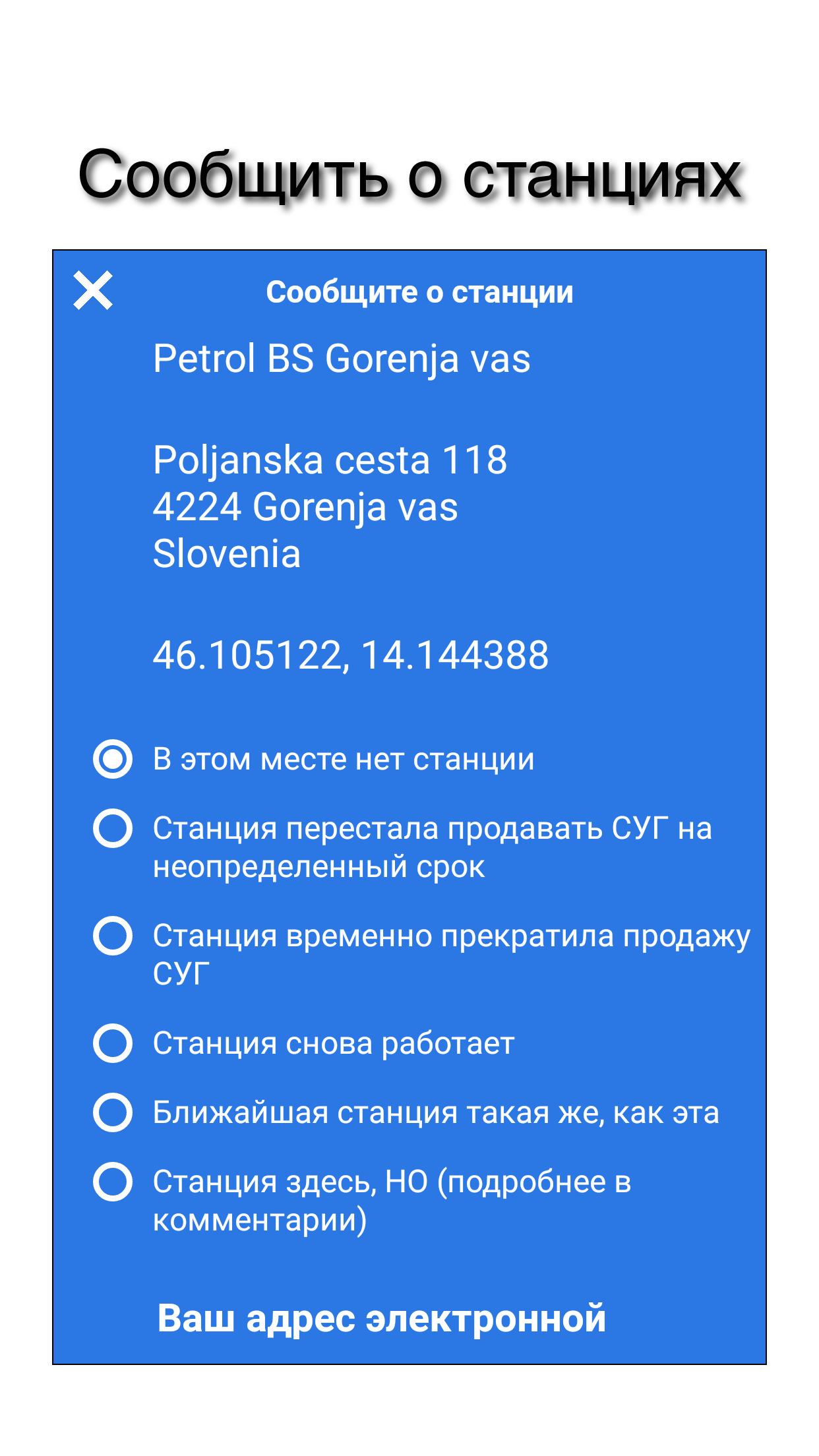 - кнопка сообщить о станции