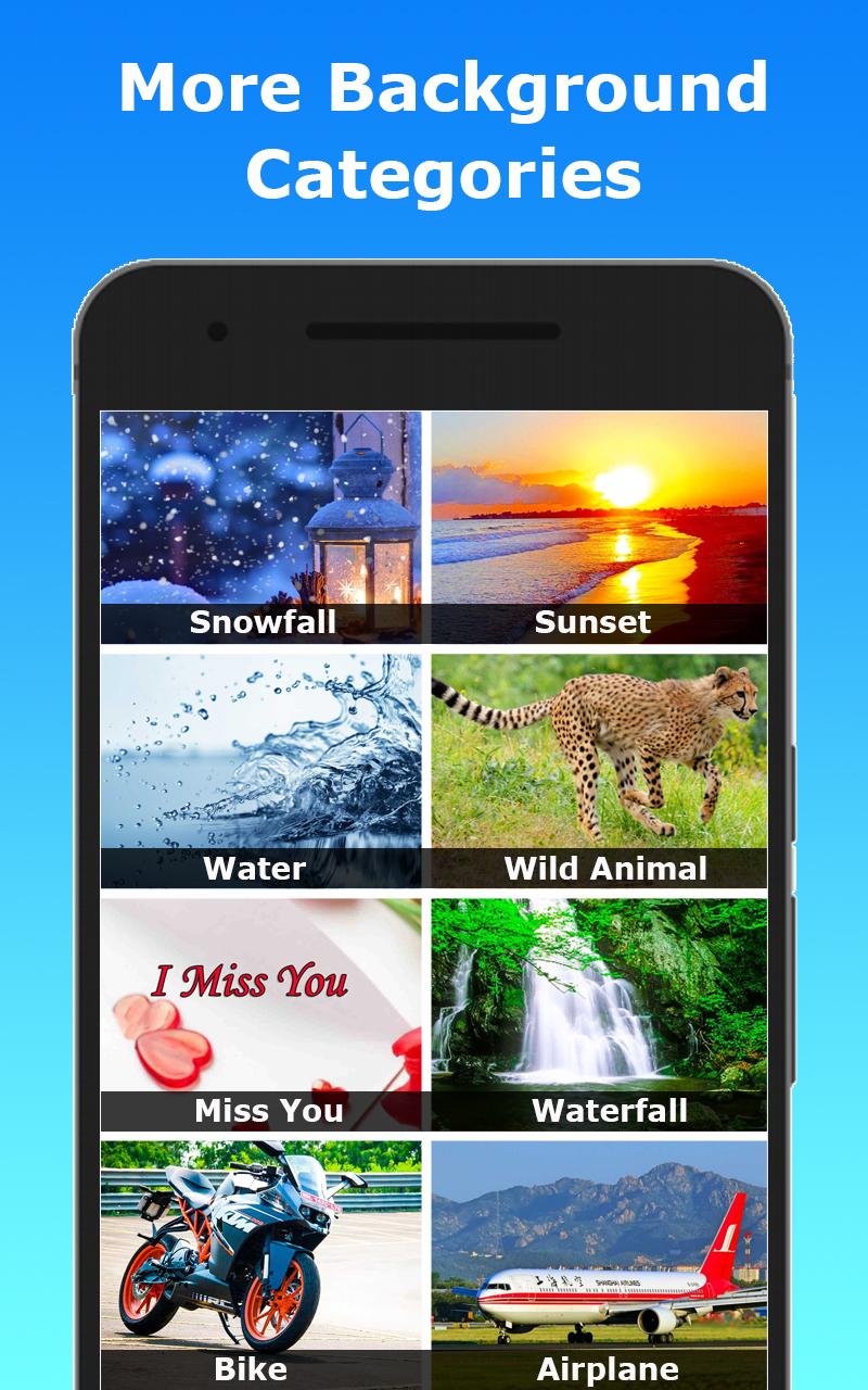 Nature photo backgrounds and Photo Frames are in this Nature photo editor. Your photos with these backgrounds and photo frames will be looking natural. Nature has green trees, plants with colorful flowers, Green Hill, Mountain, Water, Waterfall, beach etc. After downloaded this Nature photo editor, First select gallery photo or take new one. It can be resized with the help of crop option. Crop the image manually with fingers to remove unwanted portions from the image. When you Press the crop button, the unwanted portion will be deleted and cropped portion will be ready for editing. Nature photo editor has background eraser option which you can use to erase unwanted background from your existing and new photos & selfies. There are two types of erasers available in this app. One is auto eraser and the other is manual eraser. In manual eraser, eraser size can be adjusted. Either decreased or increased. When you use this nature photo editor, if you do any mistake while erasing, you can correct it using repair option. After erased unwanted background, save it without background or apply any single color background from the list or add any beautiful background from our collections. Otherwise use cut out tool to cut paste the selective image on any beautiful background. Nature photo editor has world famous 1000 beautiful backgrounds which you can set with your photos and get natural effect like those were taken naturally within those places. Apply color effects to get soft and sharp pictures. Add text using add text on photo option. Select text from the list of fonts. Text size can be increased or decreased and the text color can be changed. Nature photo editor pictures can be used as a greeting card to convey wishes to your friends. Beautify your pictures with different category sticker collections. Nature photo frames has 100+ amazing stickers which you can apply on your photos to make them more attractive. The sticker sizes can be resized and they can be rotated and moved over the device screen. Nature photo editor has flip option which you can apply on your pictures and stickers. The final image can be saved and set as a wall paper of your device. This app has a collection of wonderful garden photo backgrounds. A collection of Romantic love photo backgrounds are in this nature Photo Editor. These photo backgrounds will give natural effect to your pictures. In this Nature photo frames, you can also get a collection of awesome waterfall photo backgrounds. Photo with waterfall effect will be very nice. Nature photo editor has an amazing collection of wild animal backgrounds. Take photo lion, tiger, zebra, bear, elephant, horse etc. and share with your friends Nature photo editor has miss you photo backgrounds. Your photos with these miss you photo backgrounds will show your love to your partner. Beautiful sunset backgrounds are in this Nature photo editor. Set these backgrounds to your photo to make it attractive. Awesome night backgrounds are in this nature photo frames app. Your photo with these backgrounds will impress all. Nature photo editor has horse background collections. Attach these backgrounds and make your photos were taken with those horses. Echo mirror effect, Blur photo, Color Splash, Blur Background, Photo Collage, photo & stickers’ opacity adjustment, lock and unlock feature for backgrounds and stickers are the other features of this Nature photo editor. Stickers Nature photo editor has 100+ stickers. The categories are Snowfall, Rain, Miss you, Horse, animals, Balloon, Cakes, emoji, smiley, Flower crown, Dog & cat, love, beard, men hairstyle, mustache, sunglass, women hair style, women hat, and smiley images.
