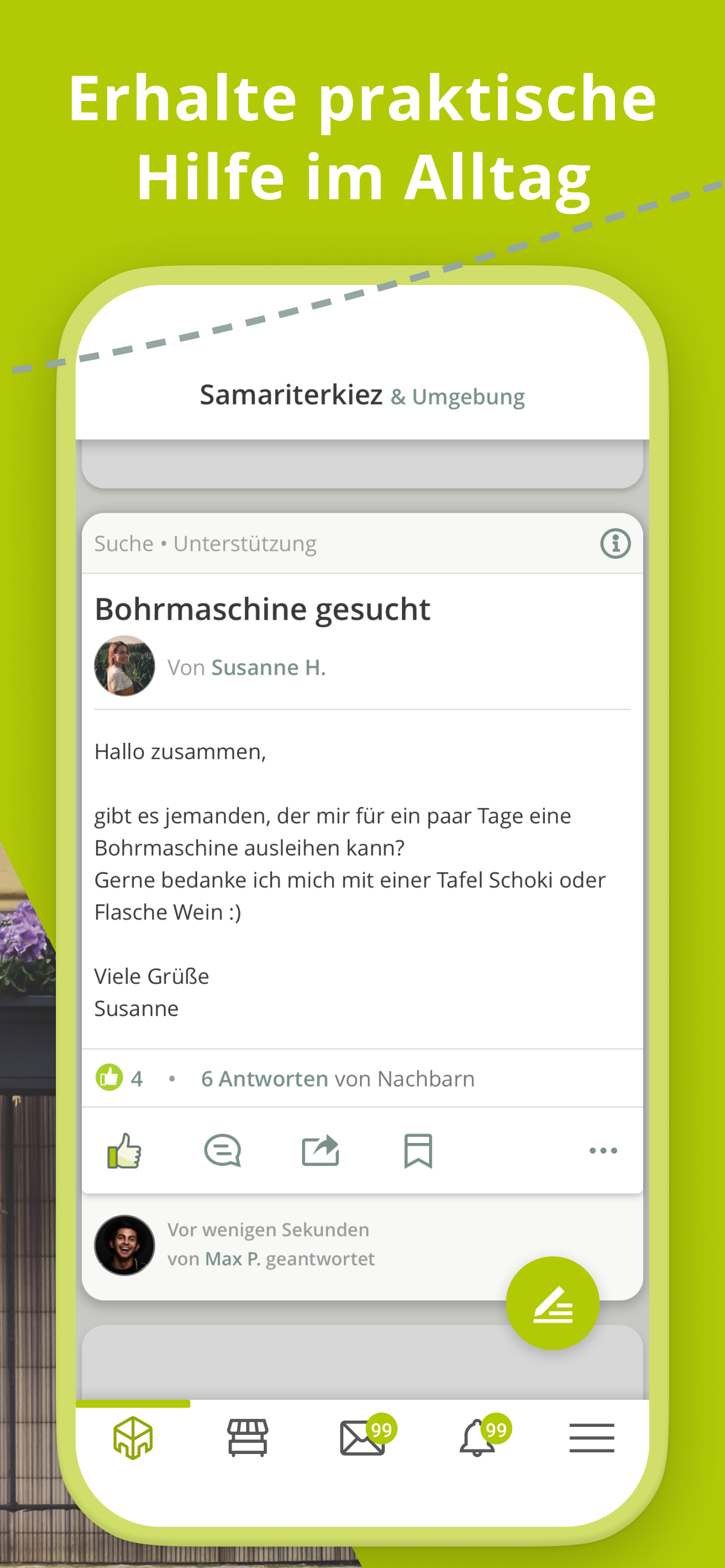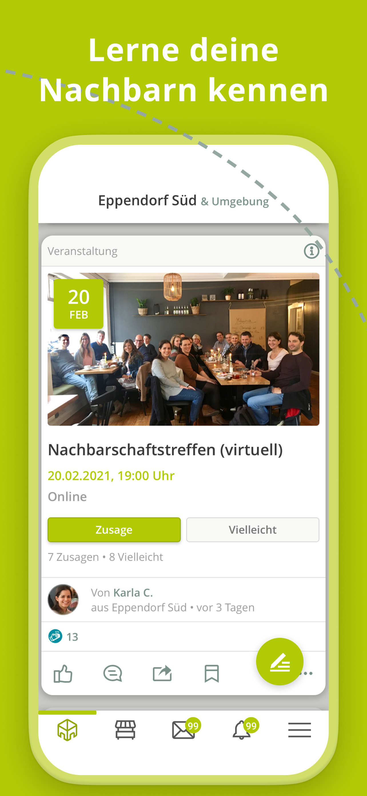Nebenan.de - крупнейшая в Германии социальная сеть для соседей. Nebenan.de предлагает вам самый простой способ связаться с людьми, находящимися в непосредственной близости от вас: узнать, помочь, отдать, продать, поделиться. Вы ищете няню? Спросите своих соседей и получите местную помощь. Узнайте, насколько ценным может быть активный и хорошо функционирующий район.