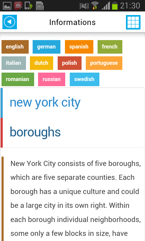 - Многоязычной информации о городе транспорт, питание, история, аэропорты и многие другие, как информация таблицу Clima или съесть и события (Offline)