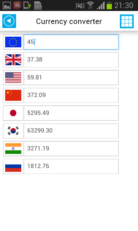 - Курс валют: евро, британский фунт, доллар США, китайские Youan, японская иена, корейский вон, рупия, русский рубль (Offline)