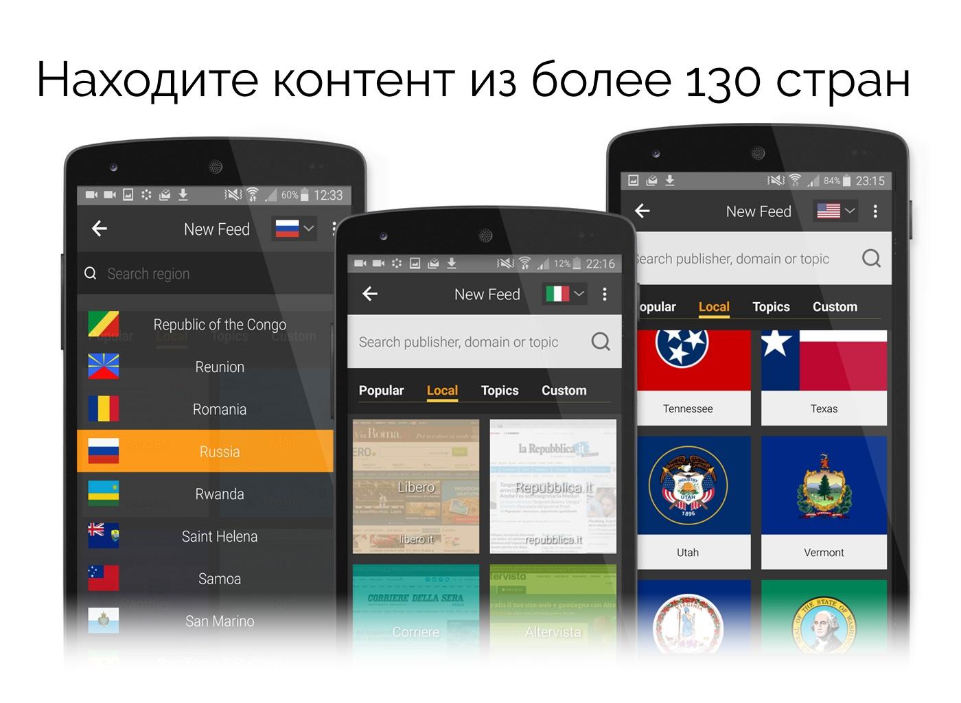 ★★★NewsTab – это уникальное приложение, организующее новости и прочий контент для чтения как глобальных, так и местных новостей. Приложение поддерживает многочисленные журналы новостей и RSS на различных языках из более 130 стран.★★★ NewsTab синхронизируется со всеми вашими устройствами и платформами (Android и сеть). Устали продираться через многочисленные приложения с новостями и контентом, пытаясь организовать топовые события дня? Важные новости теряются среди многочисленных приложений? Местные новости и прогноз погоды проходят мимо вас? Организуйте же все свои новости и журналы в одном прекрасном приложении! В NewsTab вы сможете организовать, читать и делиться новостями и контентом, который вам интересен, черпая их из многочисленных любимых журналов (глобальные и местные новости, а также прогноз погоды). Просто найдите и читайте местные и международные новости из более 130 стран на различных языках. Подписывайтесь на популярные темы и контент (сенсации, спорт, технологии, развлечения, знаменитости, и т.д.) или создавайте собственный организованный контент с новостями и оповещениями Google. NewsTab совмещается с любыми RSS, новостями Google или Twitter, поэтому так легко подписаться на любую тему, тэг, блог, газету, журнал или сайт. NewsTab – это прекрасное новостное приложение, разработанное для приятного чтения любимых новостных сайтов (через RSS иTwitter) с удобным переходом на изображения. Оно объединяет гибкость таких открытых RSS-приложений, как Feedly или Google Reader, с интуитивным и визуальным интерфейсом прочих новостных приложений, например, Flipboard, News Republic или LinkedIn Pulse. С NewsTab вы можете с легкостью подписаться на любую тему, журнал или RSS, и организовать их в разделы на основе своих предпочтений. Вы также можете добавить свой аккаунт на Twitter и отслеживать новостную ленту, пользователей и тэги. Для любителей международных новостных сайтов мы создали мощный каталог, проиндексировав миллионы страниц топовых международных и местных газет и журналов из более 130 стран на различных языках. Топовые регионы включают Россию, Бразилию, Мексику, Китай, Индию, Японию, Германию, Италию, Англию, Францию, Израиль и многие другие страны. Топовые языки включают английский, итальянский, испанский, французский, португальский, русский, китайский, японский, арабский, иврит и многие другие. Ключевые характеристики: • Красиво, интуитивно и весело • Легкий поиск топовых местных и международных журналов из 130 стран • Межплатформенный сервис: хорош как в сети, так и Android • Читайте любые новости (с поддержкой Google News) • Читайте социальные сети и отслеживайте тэги на Twitter • Гибкое и настраиваемое приложение (читайте RSS / Twitter и организуйте свои новости) • Offline, читайте в удобное время. • Совмещается с такими популярными приложениями, как Pocket, Instapaper, Readability, Evernote and OneNote • Красивый и полезный новостной виджет • Поддерживает новостные видео и подкасты