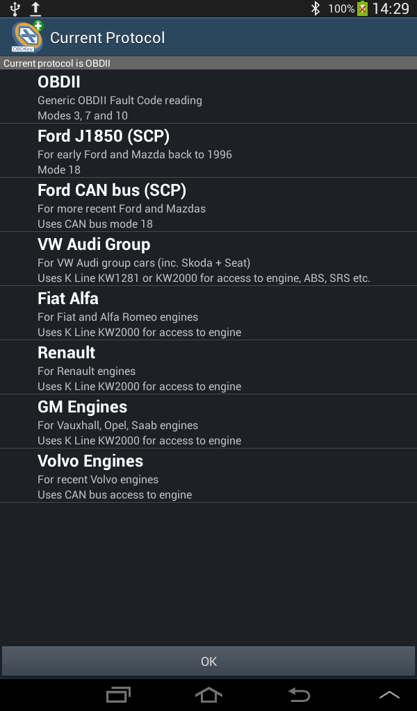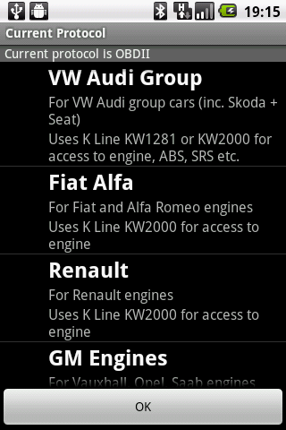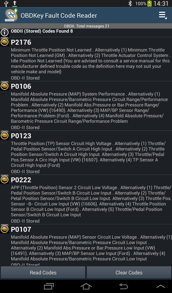 OBDKey неисправностей Code Reader является чтение код неисправности, поиск и применение посредничества для Android, что позволяет получить доступ к блоки управления вашего автомобиля (ECU), чтобы получить коды ошибок. Родовых и изготовления специфические коды могут читать, объяснил и сброс из следующих функций: * Все OBDII уступчивые (США с 1996, бензин с 2001, дизель с 2004 г.) * Pre - OBDII Форд (в том числе некоторые Mazda), используя J1850 PWM / Форд SCP * CAN основе Форд (включая Mazda), используя CAN основе Форд SCP * Pre - OBDII GM (включая Vauxhall / Opel / Saab) * VW Audi Group (VAG) (в том числе Seat / Skoda), используя KW1281 или KWP2000 * Fiat / Alfa Romeo с помощью KWP2000 Только, для VAG исключением, которые могут быть использованы с помощью KW1281 читать двигатели, подушки безопасности, приборные панели и т.д. двигателя Обратите внимание, это будет работать только с OBDKey оборудования. Приложение является сложной и мощный, но простой в использовании, что позволяет быстро и легко добраться до автомобиля EOBD, предварительно OBD и специфических диагностических кодов производителя. Приложение позволяет причина освещенной света проверки двигателя (MIL), которая будет создана. Вы сможете читать ясных, четких DTC определений общие для всех уступчивых EOBD на экране от встроенного в Посмотрите Code Base, который также включает многие сотни конкретных кодов автомобилей тоже. OBDKey является CAN включен инструмент и с этим приложением получает общий P0, P2 и P3 и U0 коды эмиссии двигателей, а также поднимает специфическое P1, P3 и U1 коды. С одного экрана крана, приложение может OBDKey неисправностей Code Reader выключает MIL свет, ясные Коды и сброс мониторов. OBDKey неисправностей Code Reader доступна для Android пользователей и только владельцы единичных OBDKey Bluetooth. Особенности включают в себя полностью автоматическое подключение Bluetooth только спаривание было установлено, код неисправности пользователь посмотрите вверх, удобную навигацию с помощью меню, пейзажном и портретном режимах и поддерживается, HDPI, MDPI и LDPI возможностях экрана, работает с более крупными «таблетка» устройств. Только на английском языке в настоящее время. Встроенная библиотека данных с функцией поиска пользователь также включен. OBDKey обновляемыми через веб-загрузки через соединение Bluetooth. Данные, полученные от транспортного средства (ы) могут быть экспортированы по электронной почте на любой адрес по вашему выбору. OBDKey доступна http://www.obdkey.com