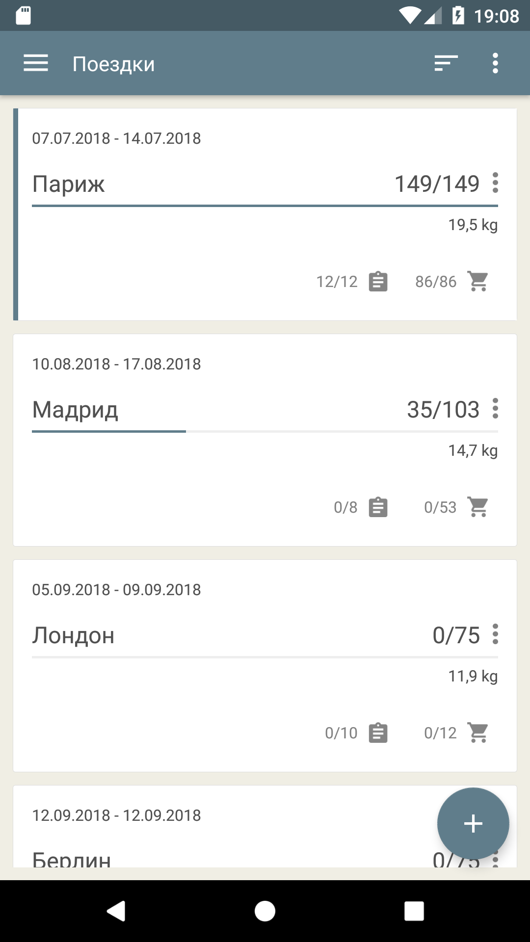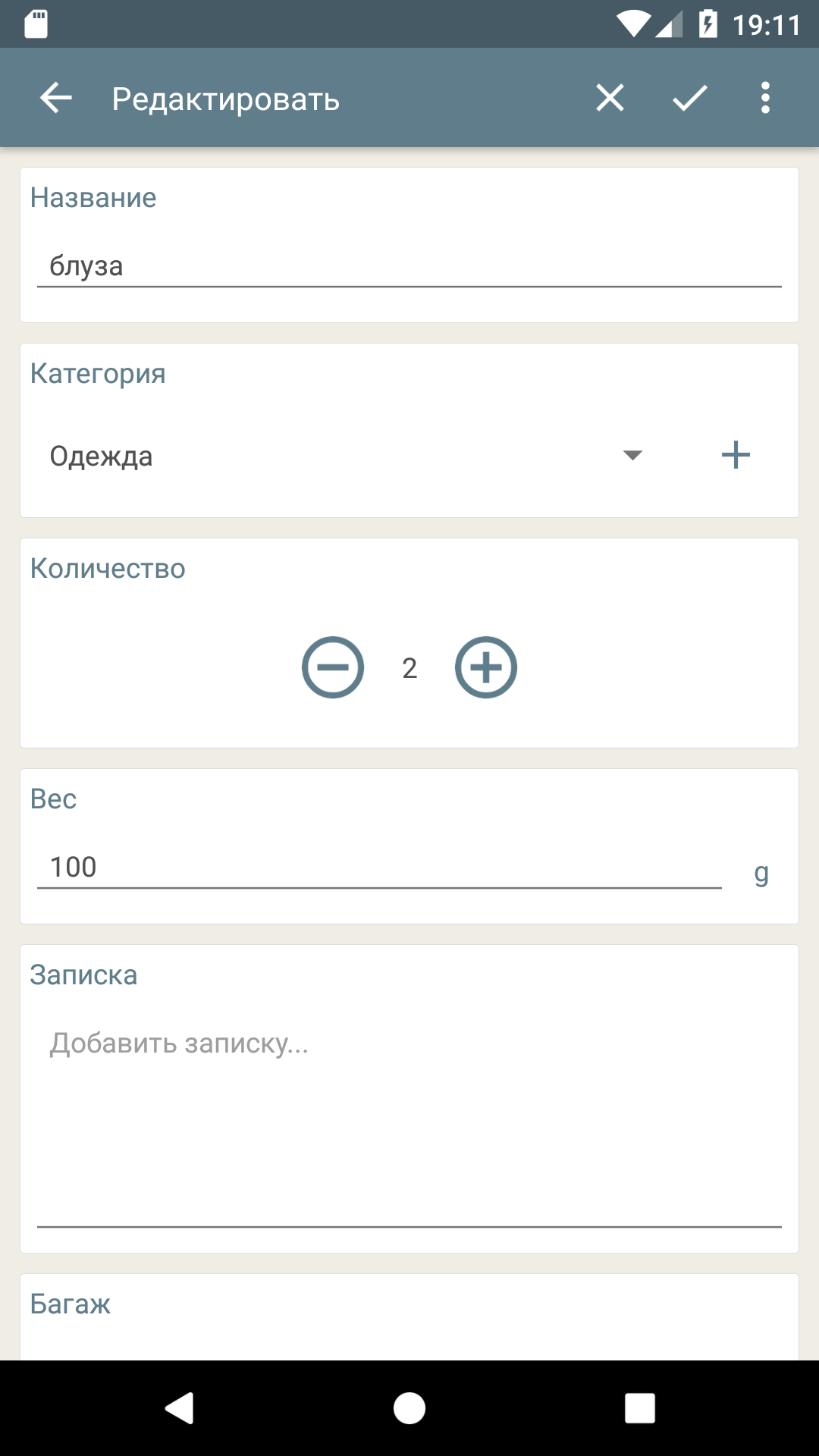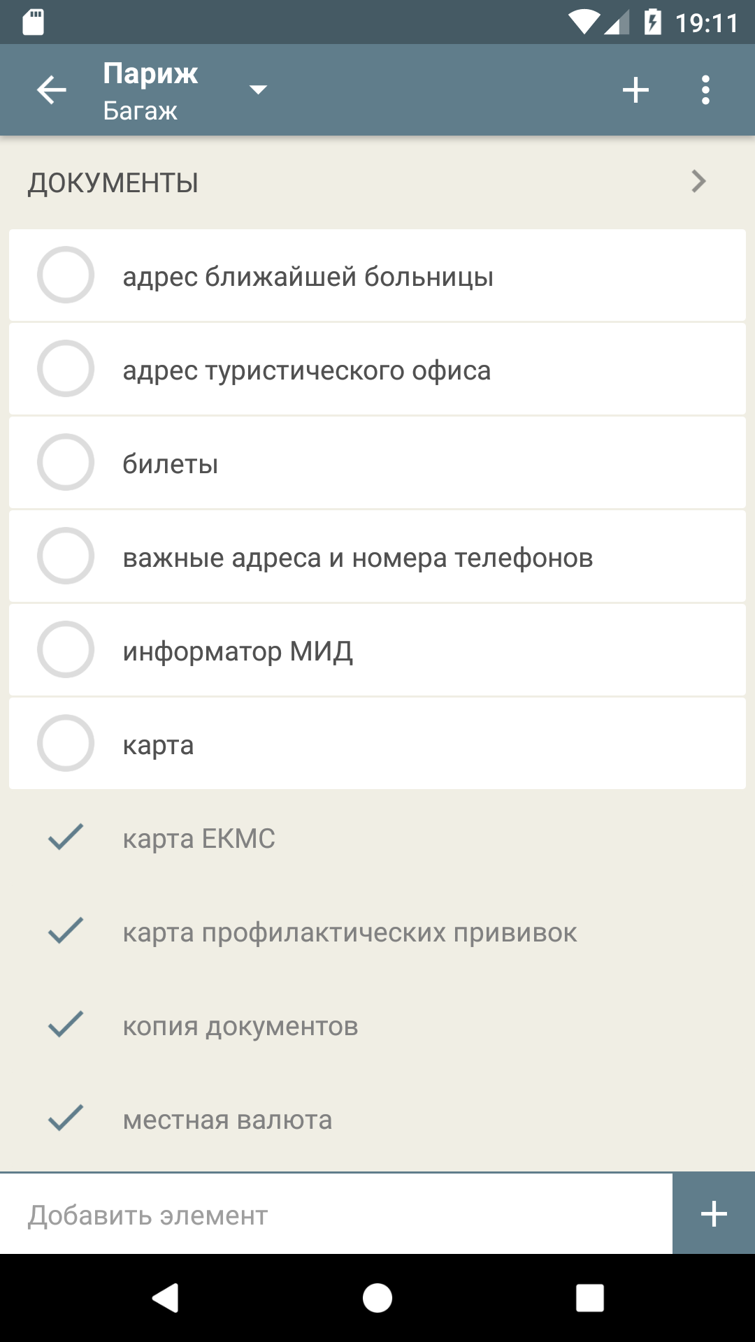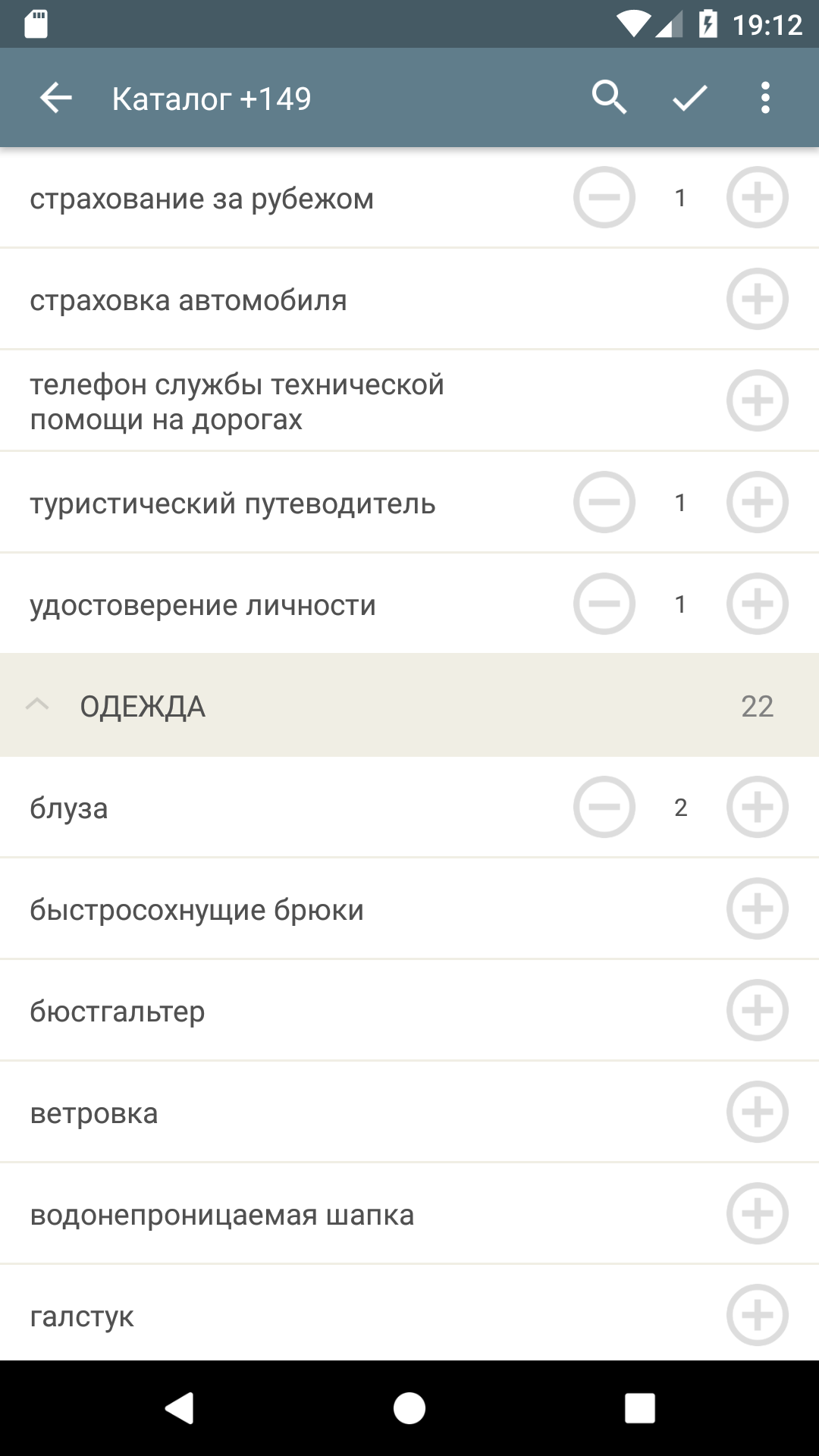 • Встроенный каталог наиболее часто забираемых вещей в поездку (около 400 элементов)