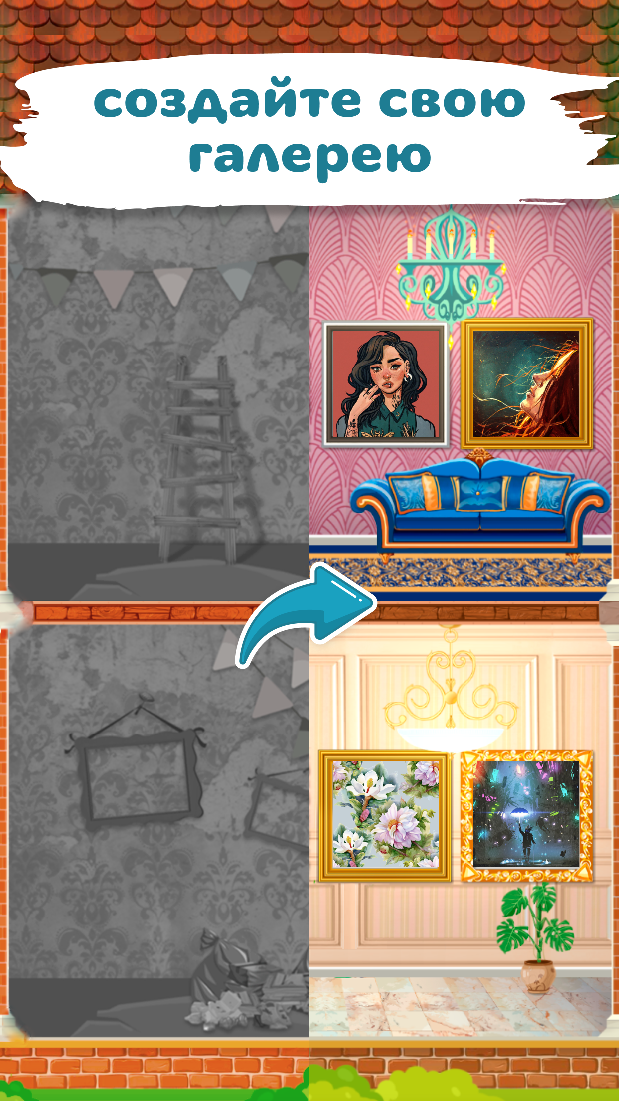 Окунись в прекрасную завораживающую историю художницы и ее галереи, историю, от которой невозможно будет оторваться! Построй свою галерею с нуля, с самого начала, рисуй картины, продавай их и украшай свой интерьер. Улучшай галерею и свои способности, чтобы привлечь больше посетителей на выставку и заработать больше денег, занимаясь своим любимым делом. Не упусти возможность заниматься делом своей мечты 😍