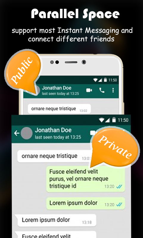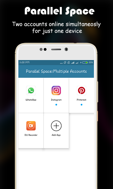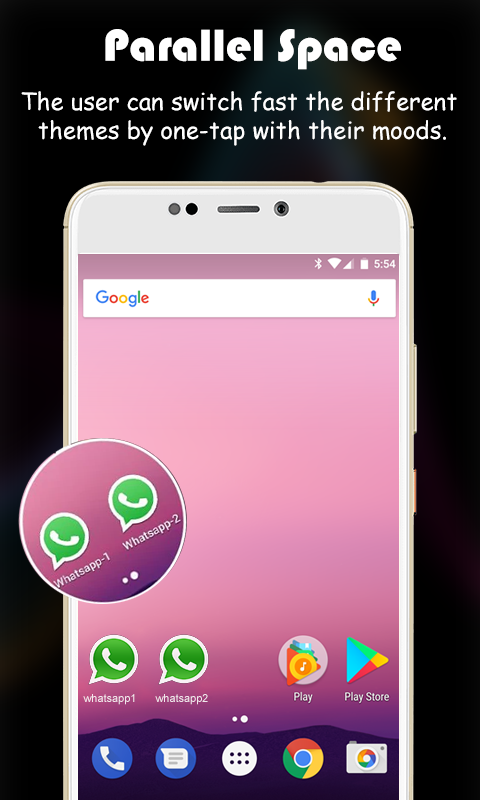 • Parallel Space(Clone Space) - Multiple Accounts Dual sim phone with a single WhatsApp account? Not anymore. Just install the app in your parallel account and treat yourself with a second, virtual account. Parallel Space -Multiple Account: Dual Space, Clone Apps will run two accounts simultaneously on your phone, you can easily switch them with just one key,then effective manage different accounts. • Keep your personal accounts and work accounts both online at the same time, and you can balance between life and work easily. • Almost all social apps are supported for a second account in Dual Space. Data from different accounts will not interfere with each other. Sign in 2 accounts of one app on the same device Easily switch accounts through the app Independent app-install system Install apps inside our app and keep them secure and private Notifications: Please add Parallel Space to whitelist or exceptional list of some 'boost apps' to ensure that notification of some social networking apps functions well. You cannot run two accounts of some social networking apps by using a same mobile number. You should use a different mobile number to run your second account of those apps in Parallel Space and ensure that the mobile number is active during your first login because there will be a verification message sent to this number.
