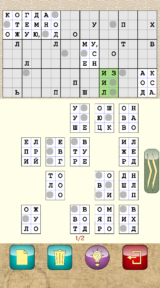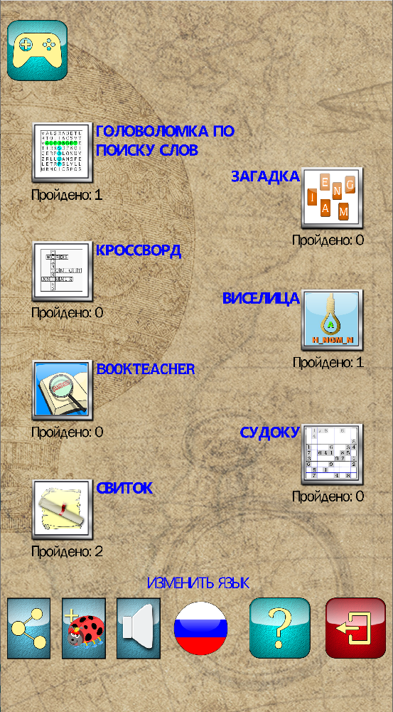 Вам понадобится лишь один игровой комплект. Включает в себя 7 увлекательных игр, которыми вы можете наслаждаться на 7 разных языках. ГАРАНТИРОВАННОЕ УДОВОЛЬСТВИЕ В ОДНОМ ПРИЛОЖЕНИИ! Возможность использования таких языков: английский, испанский, французский, немецкий, итальянский, португальский и русский. Включает: ★ ГОЛОВОЛОМКА ПО ПОИСКУ СЛОВ ★ Абсолютная классика, но, тем не менее, весьма занимательная. Находите требуемые слова среди моря букв. ★ КРОССВОРД ★ Это - увлекательный вызов, вам требуется подобрать нужное слово для завершения игры. ★ ЗАГАДКА ★ Оригинальная игра, в которой вам требуется воспользоваться имеющимися буквами для поиска скрытого слова. ★ ВИСЕЛИЦА ★ Эмоции и веселье гарантированы во время поиска скрытого слова до того, как быть... повешенным. ★ BOOKTEACHER ★ Увлекательная и заставляющая подумать игра, в которой вам следует складывать карточки для получения отрывка из классики: "Дон Кихот Ламанчский" Мигеля де Сервантеса и других книг. ★ СУДОКУ ★ Не требует представления, и хотя у нас есть другое приложение исключительно для игр с цифрами, мы включили его сюда на основе ваших пожеланий, чтобы можно были играть, не меняя приложения. ★ СВИТОК ★ Гениальная игра, во время которой вы должны узнавать известные фразы и пословицы, заменяя символы, отображаемые в виде ключей, правильными буквами. Характеристики: ✔ Полностью бесплатная. ✔ Семь игр: головоломки по поиску слов, кроссворды, загадки, "виселицы", bookteacher, судоку и свиток. ✔ Новые игры в подготовке к будущим обновлениям. ✔ Игры на семи языках дают возможность пополнять словарный запас на языке по вашему выбору. ✔ Простота и возможность саморазвития, без сложных опций, просто выбирайте игру и наслаждайтесь ею. ✔ Тренируйте свой ум без стрессов, для решения задач нет ограничений по времени. ✔ Подключение к Google Play Игры для получения вознаграждений за рекорды и возможности делиться успехами. ✔ Возможности отслеживания во время игры помогают в случае казалось бы неразрешимых ситуаций. ✔ Более 10000 слов, организованных по различным категориям. ✔ Более 1 000 000 скачиваний. Вы не пожалеете о своем выборе!