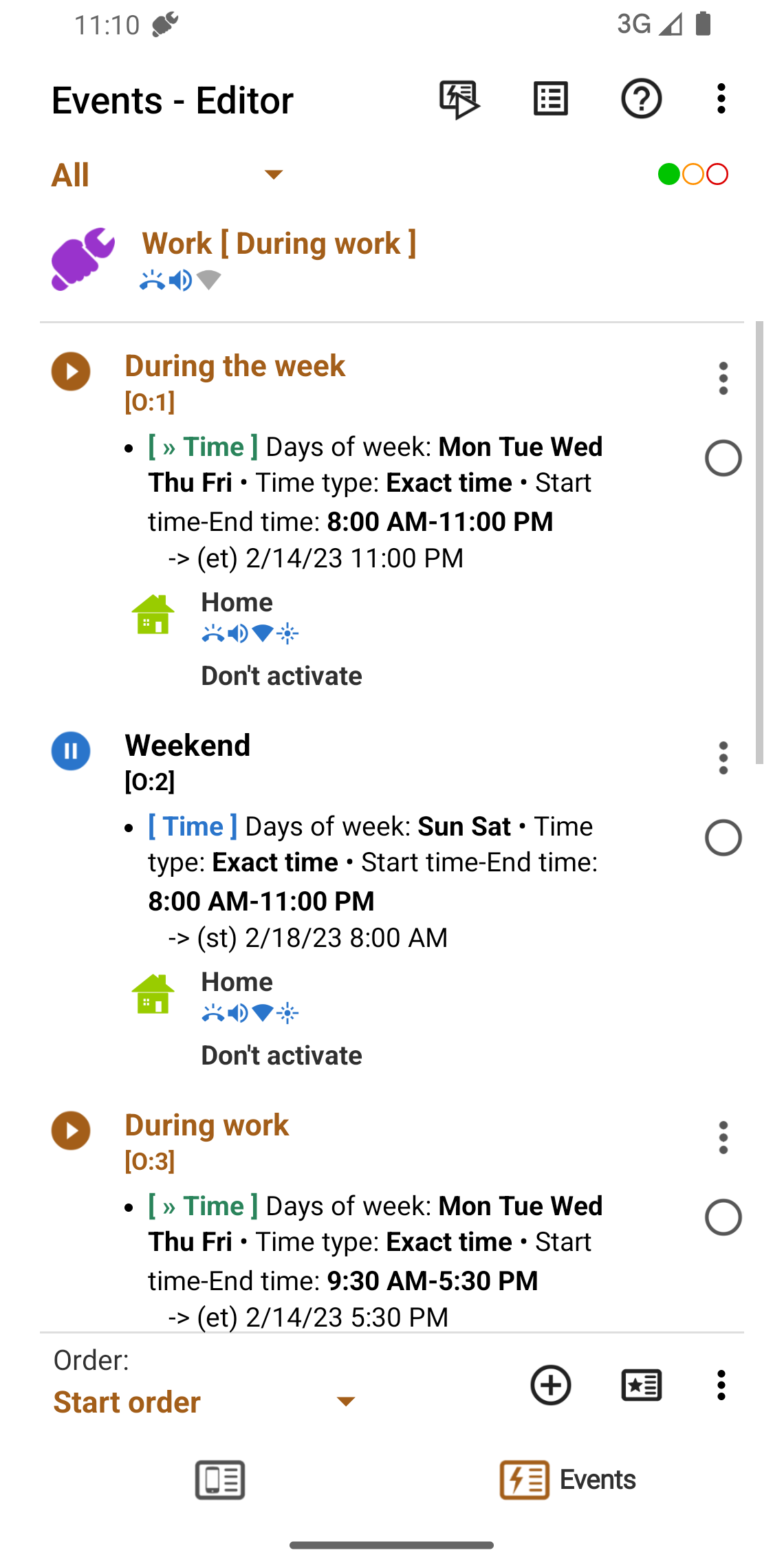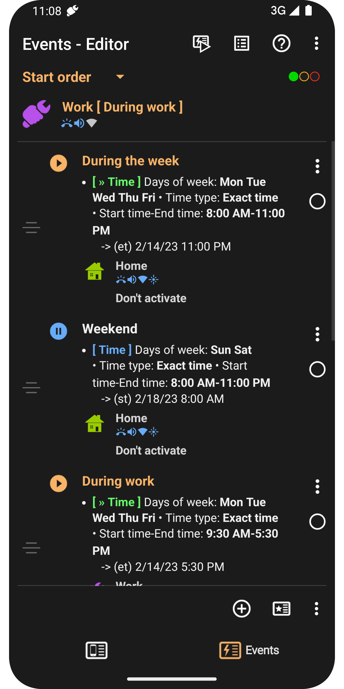 - priority, profile which will by activated on start/end, ignore manual profile activation, sound notification, undo profile activated before start of event, event start delay