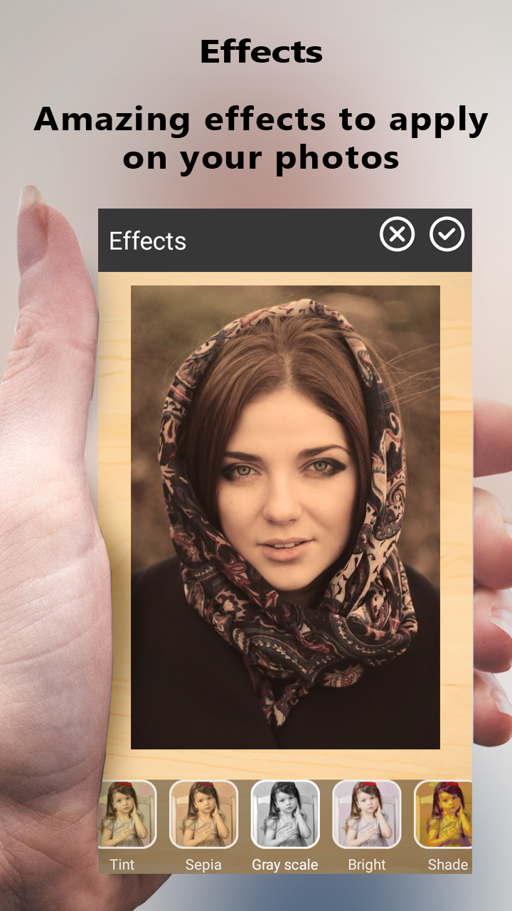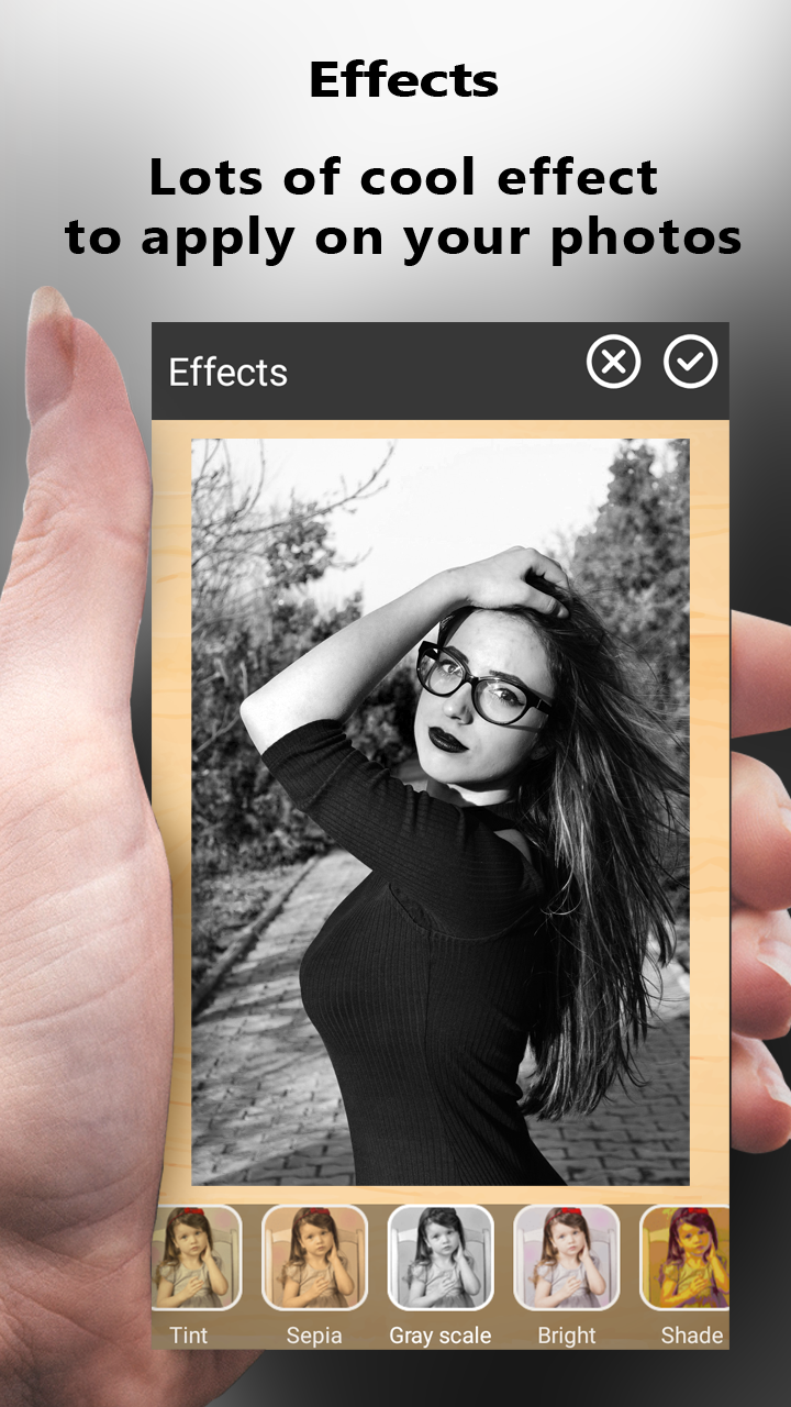 ✓ конвертировать ваши фотографии эффекты в: Blur, Оттенок, серая шкала, светлая, Shade, Зеркало, черно-белый и многое другое.