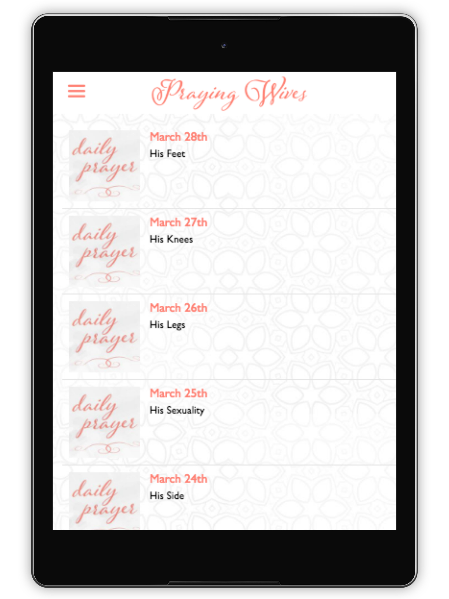 As a wife, you have been given the privilege of serving as a mighty prayer warrior for your husband. Yet sometimes, even when poised with the best of intentions, the task can feel overwhelming. You wonder: What should I pray? How should I pray? What prayers does he need right now? In PrayingWives, adapted from Praying for Your Husband from Head to Toe, Sharon Jaynes maps out sixteen landmarks to help you consistently and effectively cover your husband in prayer – from his mind and the thoughts he thinks, to his eyes and the images he sees, all the way down to his feet and the path he takes. Sharon teaches you how to pray for your husband in ways that are powerful, practical and life-changing. You’ll be equipped and empowered to begin the daily habit of covering your husband in Scripture-based prayer. These prayers will strengthen your marriage, deepen your personal prayer life, and cover your husband from head to toe—in ways that will lift not only his spirit, but yours as well. This app provides: + 365 powerful prayers, one for each day of the year + Scriptural references for each prayer + Easy sharing of your favorite prayers with friends and family via Facebook, Twitter, and email + Notes feature that equips you to journal your thoughts and experiences as you pray for your husband + Favorites feature that allows you mark your favorite prayers and access them easily + Interaction with Sharon Jaynes' website directly from the app Powerful, effective prayer for your husband is easier than you think!