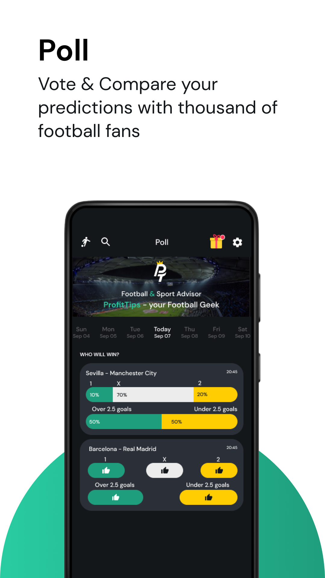 С приложением ProfitTips теперь проще, чем когда-либо, бесплатно сравнить свое мнение об определенных совпадениях с мнением тысяч других пользователей! Опрос ProfitTips позволяет вам голосовать за результат и количество голов в данном матче.