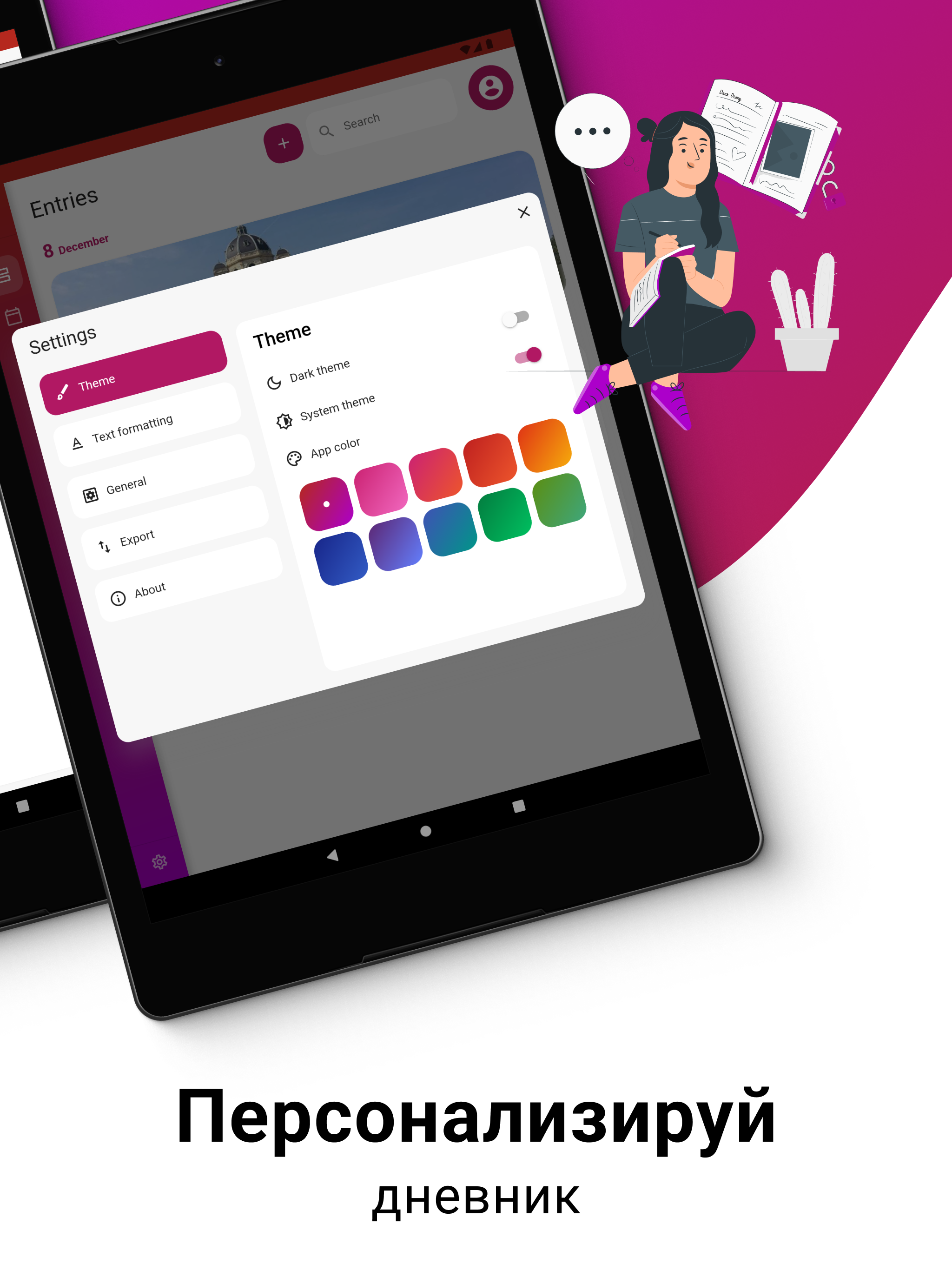 Purple Diary — красиво оформленное приложение для ведения личного дневника, которое позволяет легко записывать и размышлять о своих мыслях и переживаниях. Благодаря интуитивно понятному интерфейсу и богатому набору функций Purple Diary позволяет легко фиксировать важные для вас моменты, независимо от того, записываете ли вы ежедневные события, отслеживаете свое настроение или используете его в качестве инструмента для ухода за собой и личностного роста. Благодаря защите паролем и возможности добавлять фотографии Purple Diary предлагает безопасное и личное пространство для самовыражения. Попробуйте Purple Diary сегодня и начните исследовать свой внутренний мир совершенно по-новому. Также доступно на Wear OS.