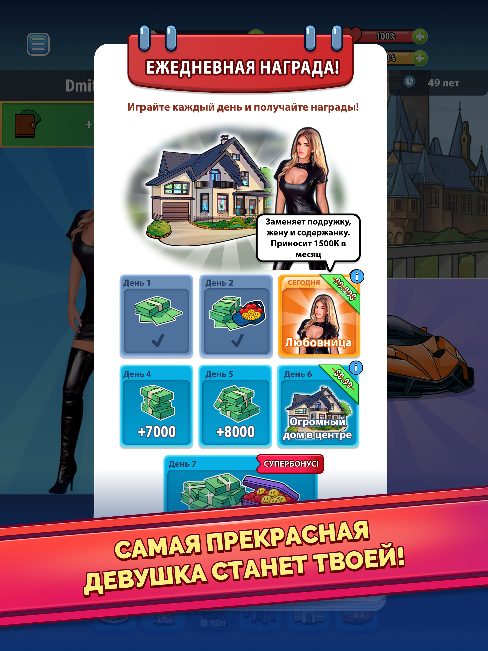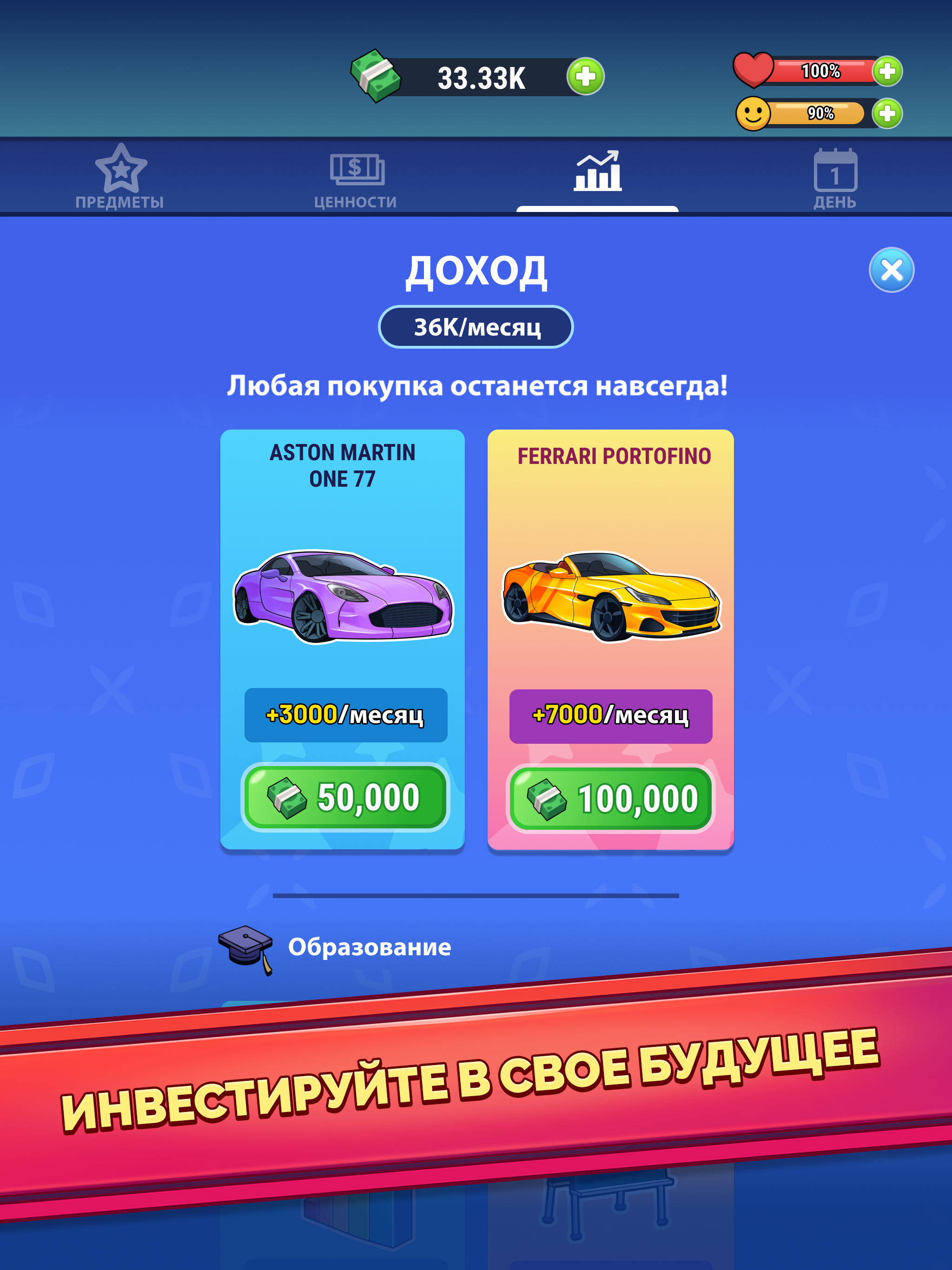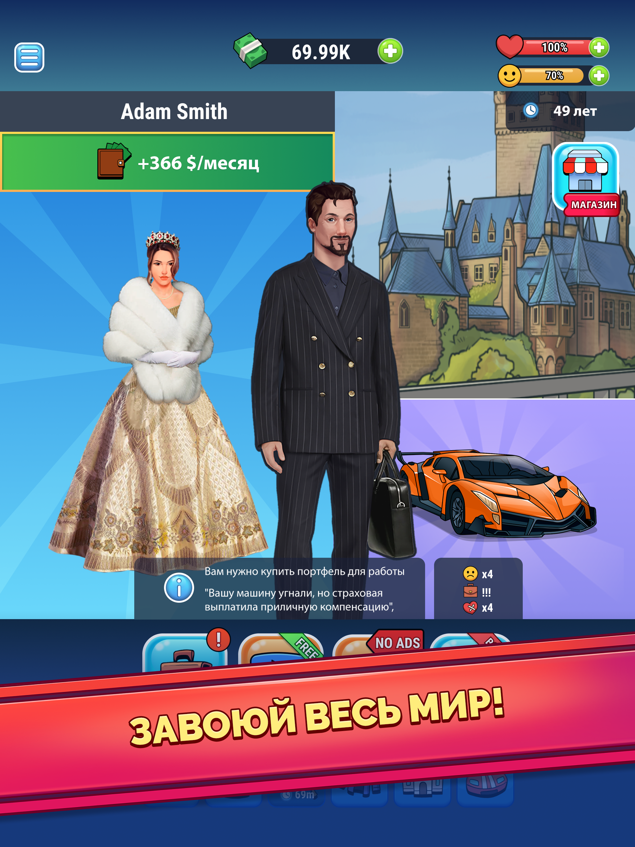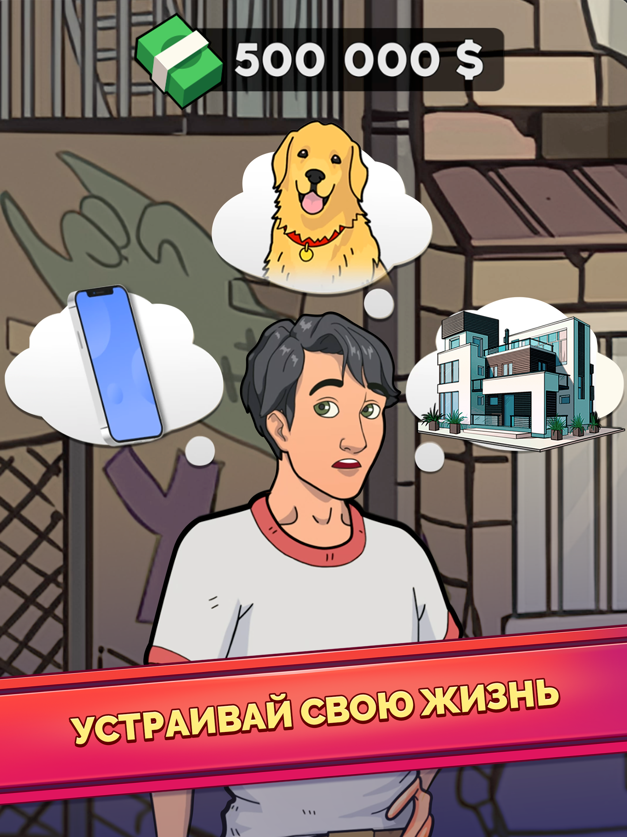 Вы когда-нибудь мечтали стать богачом и жить как магнат миллиардер? Играйте в симулятор жизни, пройдите путь от нуля до героя и напишите свою собственную историю успеха. Делайте правильные жизненные выборы и пройдите путь от бедности к богатству! НАЧНИТЕ С НИЗОВ Помогите безработному парню в этом симуляторе легкой жизни и сделайте его самым богатым человеком! Путь от бедности к богатству может быть трудным, но очень интересным, ведь вы сможете выбирать, где учиться и работать. Или решите играть на бирже или в казино? ОБРАЗОВАНИЕ ДЛЯ ЛУЧШЕЙ ЖИЗНИ Закончите колледж и улучшите навыквыступлений, выиграйте любой спор. Начните свою карьеру и выбирайтесь из нищенства, повышая уровень знаний. Проходите разные курсы от менеджера по продажам до юридических. Подружитесь со своим боссом и получите быстрое продвижение по службе. Симулятор денег ждет вас! СТАНЬТЕ УСПЕШНЫМ КАПИТАЛИСТОМ Превратитесь в праздного магната, узнайте, что значит жить богатой жизнью! Выбирайте, какой тип работы вы хотите от менеджера, инвестиционного консультанта, заместителя директора или финансируйте лучшие стартапы. Сделайте правильный выбор для своего героя. Хотите попасть в банк и стать миллиардером? Сделайте это, иначе ваш сим в конечном итоге будет голодать на улице. ПРИОБРЕТИТЕ СВОЕ ЖИЛЬЕ Перебирайтесь с улиц в общежития, там живут больше 5 человек...весело, но тесно. Тогда переезжайте в небольшую, но уютную квартирку! В будущем вы можете выбирать между таунхаусом, виллой, особняком или даже частным островом на земле, полной денег! Наслаждайтесь роскошной жизнью в симуляторе жизни! СОЗДАВАЙТЕ ОТНОШЕНИЯ Заведите отношения, выберите самую симпатичную девушку-домохозяйку! Решите, жениться или продолжать искать ту самую? Съезжайтесь, укрепляйте отношения и, наконец, женитесь! Рожайте детей и вырастите их. СЛЕДИТЕ ЗА ЗДОРОВЬЕМ И СЧАСТЬЕМ Помните восстанавливать шкалу здоровья и счастья до фиксированного уровня. Исполняйте желания персонажа, чтобы показатель счастья был стабильным. ОСОБЕННОСТИ СИМУЛЯТОРА ЖИЗНИ RICH INC.: - Пройдите путь от бедняка и постарайтесь выжить на улицах; - Разбогатейте и заработайте столько денег, сколько сможете; - Покупайте новую одежду, квартиры, машины или вкладывайте в инвестиции; - Делайте правильный выбор, чтобы достичь цели и стать миллиардером; - Станьте героем в этой денежной игре; - Наслаждайтесь простым геймплеем и жизнью магната: просто делайте выбор и нажимайте на экран. - Пройдите путь от бедного к богатому и станьте самым богатым; - Торгуйте на фондовом рынке или начните собственный бизнес; - Станьте хозяином своей жизни и будьте счастливы! Присоединяйтесь к этой захватывающей игре приключении за богатствами, зарабатывайте деньги и наслаждайтесь праздной 100-летней жизнью в симуляторе. Постройте блестящую карьеру и заработайте большие деньги. Управляйте собственным бизнесом, чтобы стать миллиардером в игре-симуляторе денежного бизнеса. Примеряйте образ жизни богатого капиталиста в игре Rich Inc. Проложите свой путь к успеху и почувствуйте себя магнатом!