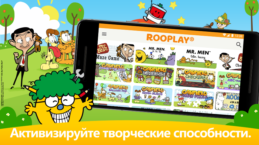 Rooplay предлагает сотни специально отобранных образовательных игр, которые подарят спокойствие и внутреннюю организацию детям и их родителям. Играйте с Гарфилдом, мистером Бином, муми-троллями и персонажами мультсериала "Мистер Мэн".