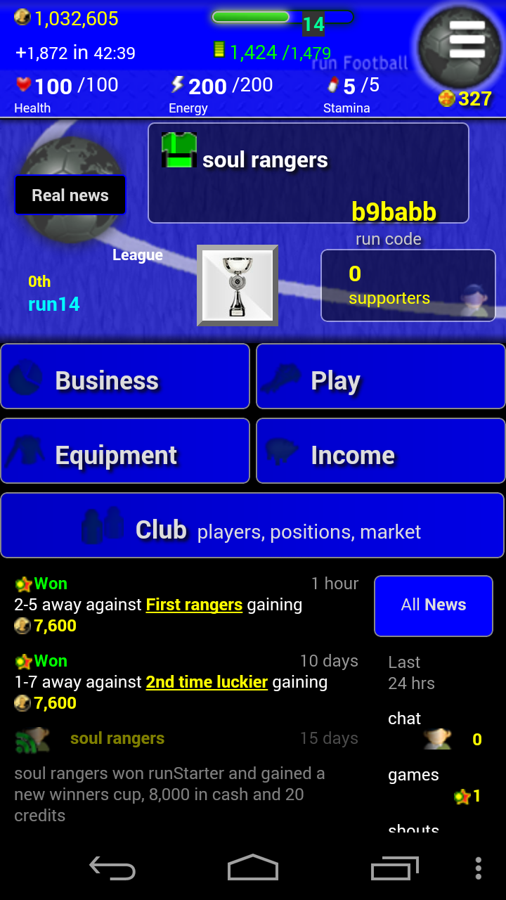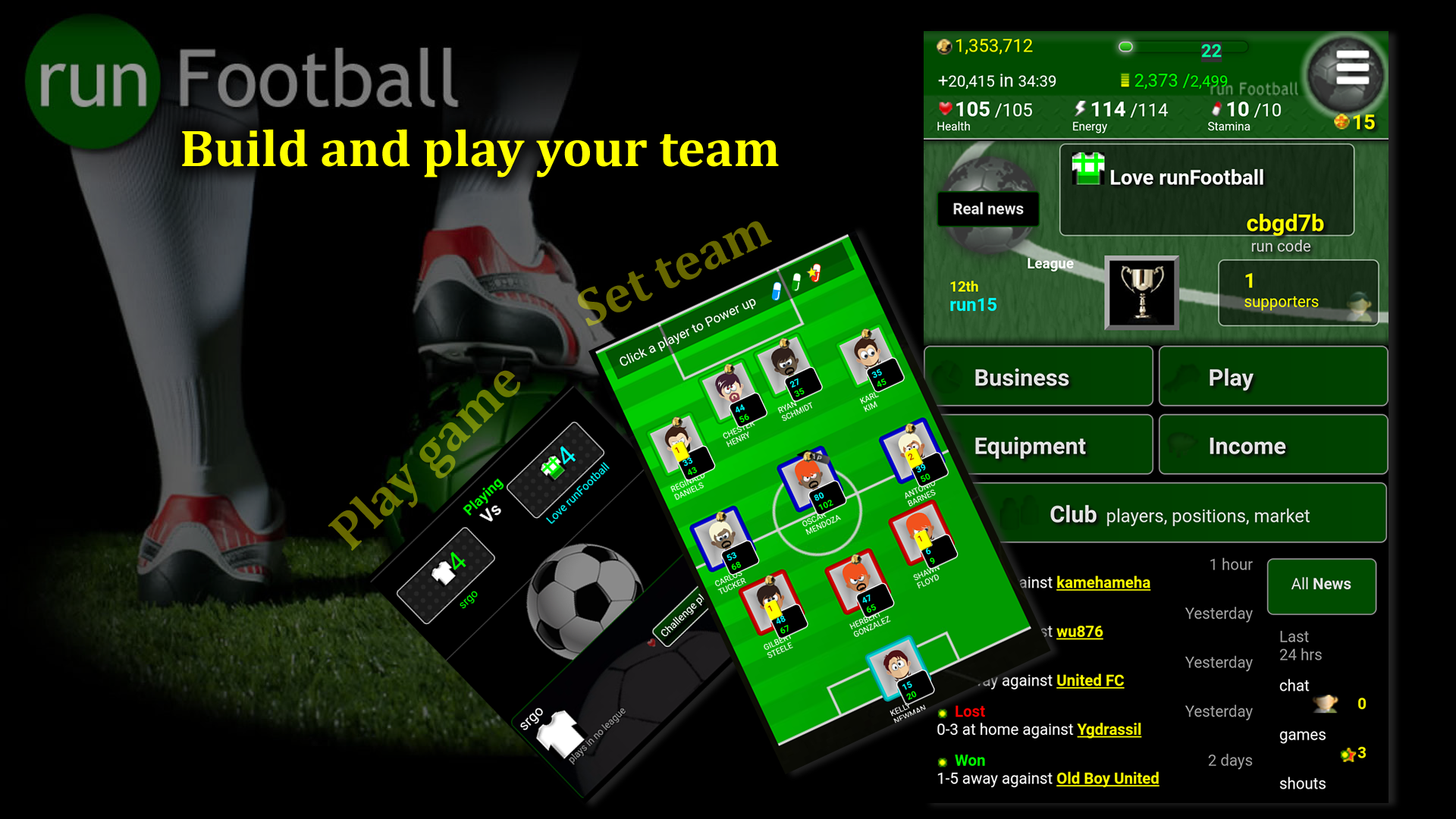 runFootball is a feature rich Multi-player online Football soccer Manager game. Manage skills, team, players, kit and income as you build supporters and manage your own football team to winning the football league. Challenge players and read real world football news. ✅ Multiplayer online football soccer game! ✅ Challenge and meet other players online, play football. ✅ Buy, sell and train your own football team. ✅ Ad free ✅ Compete in many different football leagues as you raise your level. ✅ Many ways to play your team ✅ Train and improve players Permissions required: -Intenet, runFootball is an internet only app. Nothing else needed.