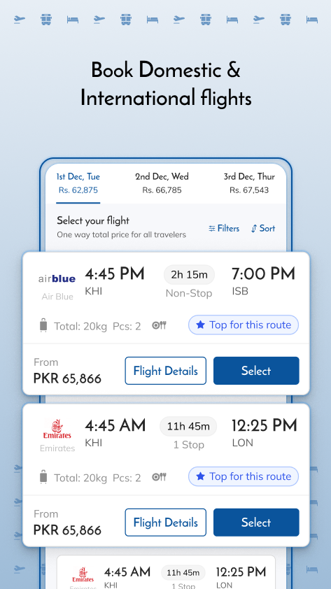 Получите доступ к более чем 100 авиакомпаниям со всего мира. Все внутренние авиалинии, такие как PIA, Air Sial, Airblue и Serene Air, доступны для мгновенного онлайн-бронирования билетов.