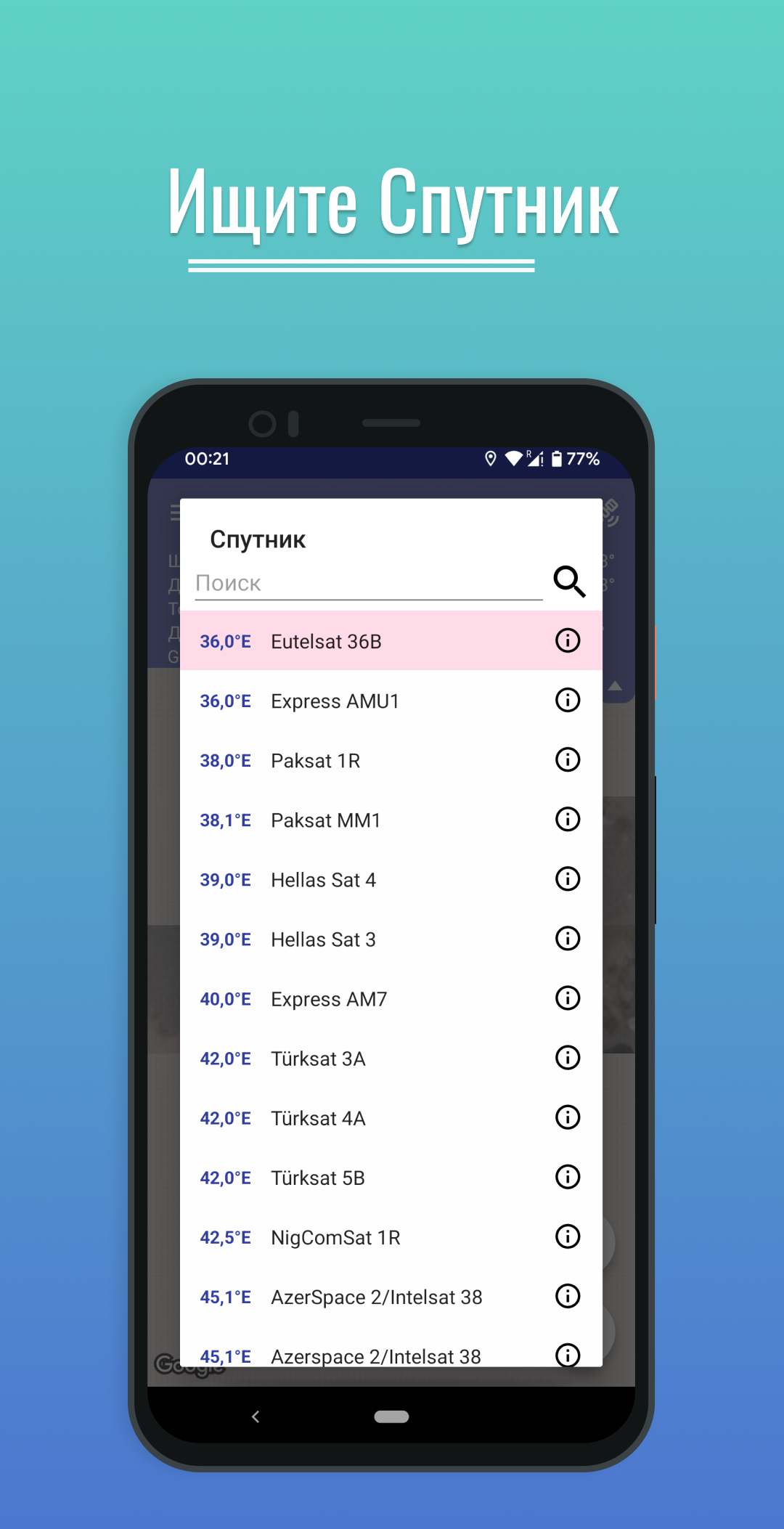 - Удобный поиск спутника по его названию или по названию провайдера;