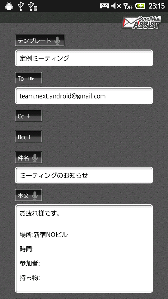 You can create one that address, subject, text, and signature were input can be made as a template (fixed form sentence) and save it, also we supports voice input function.