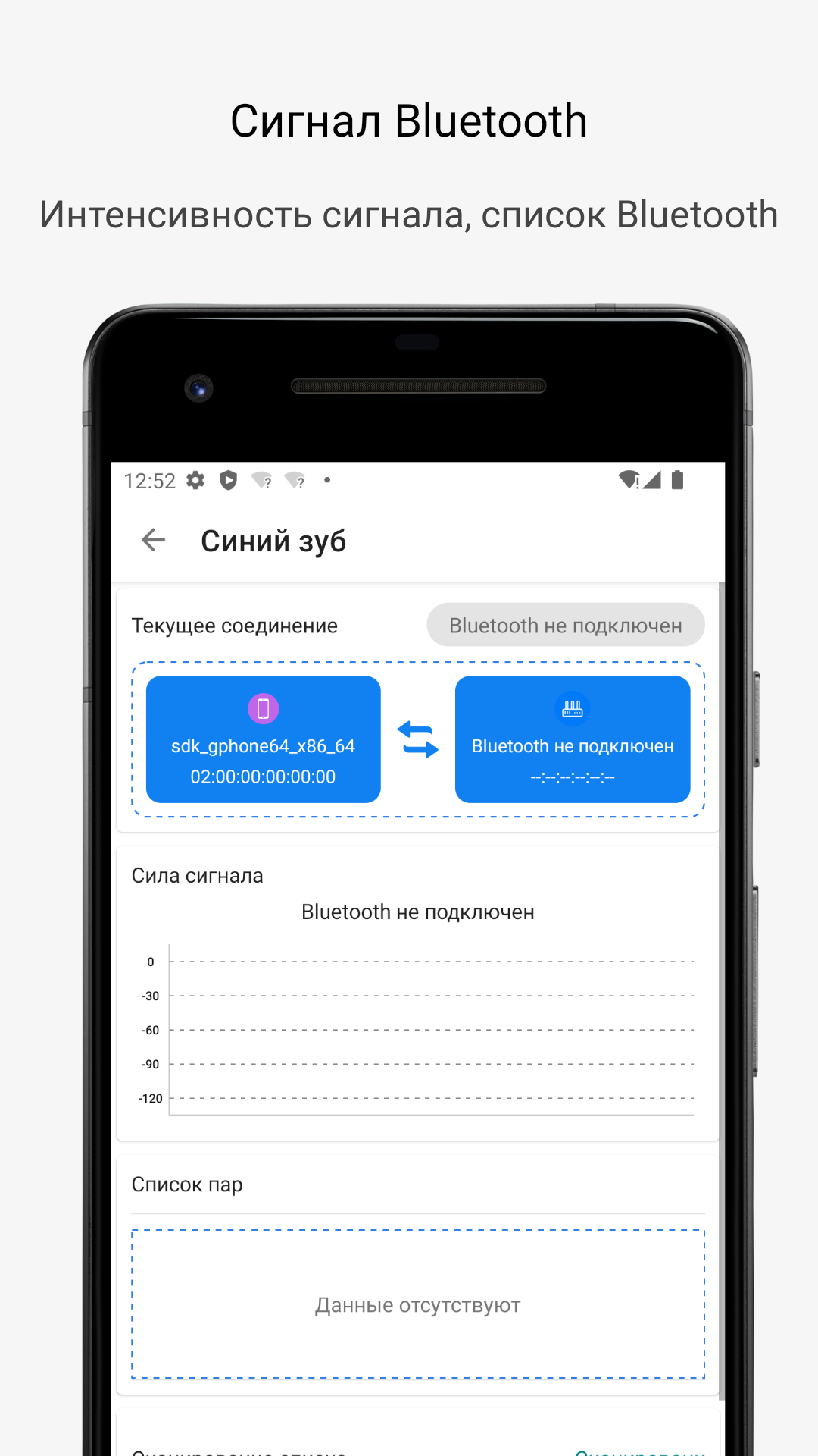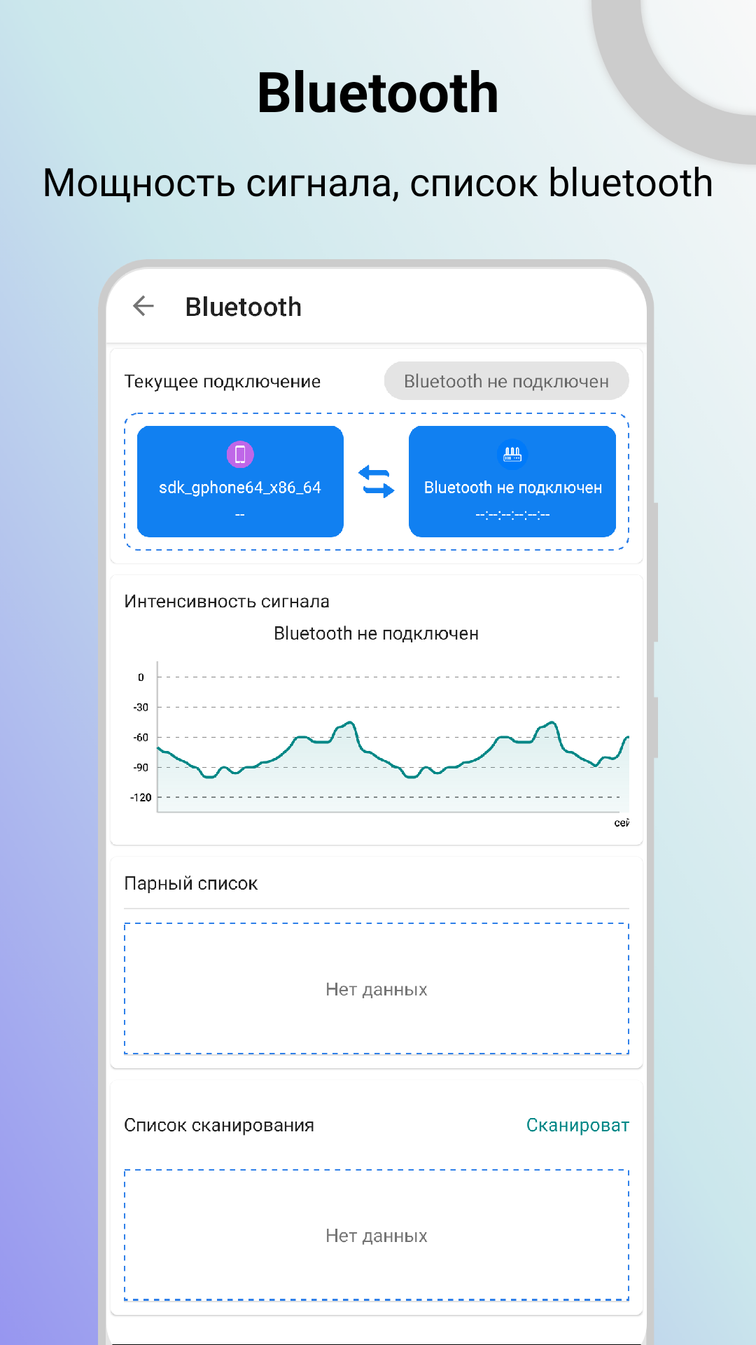 4. Сигнал Bluetooth: определение уровня сигнала Bluetooth в режиме реального времени и получение такой информации, как MAC-адрес подключенного в данный момент Bluetooth. Проверьте список сопряженных устройств, выполните сканирование, чтобы обнаружить дополнительные устройства и другие функции.