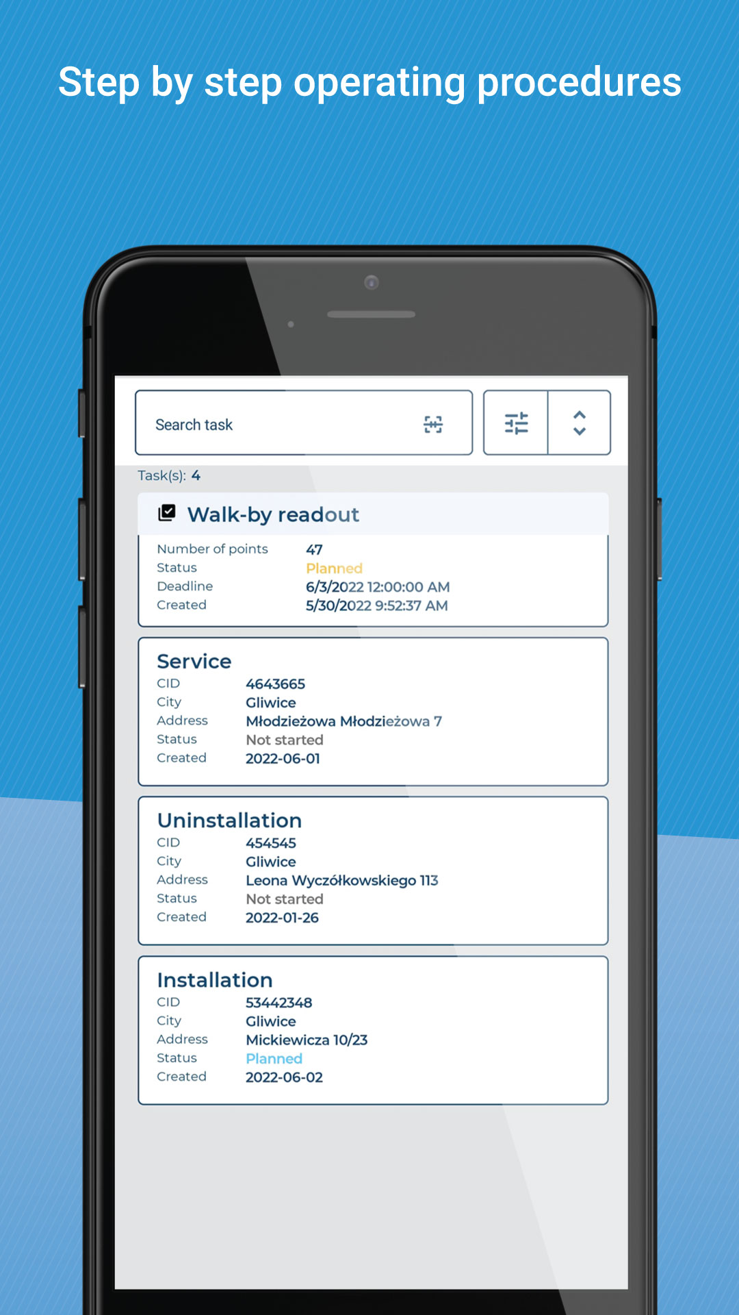 Получите больше от своих активов. Управляйте местоположениями, устройствами IoT и счетчиками, просматривайте их подробные данные и создавайте задачи для монтажников.