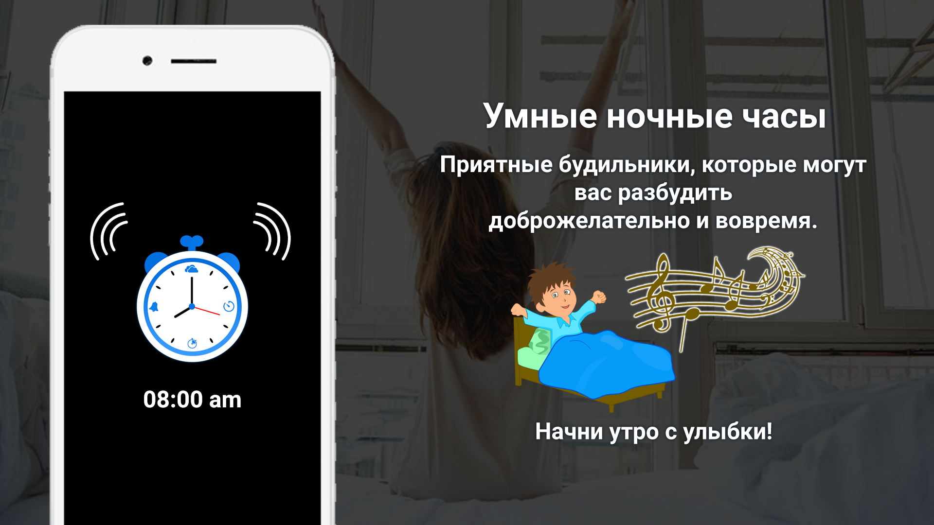 ⏰ просыпайтесь с умным нежным будильником и начинайте свой день с любимой песни вместе с информацией о погоде в реальном времени